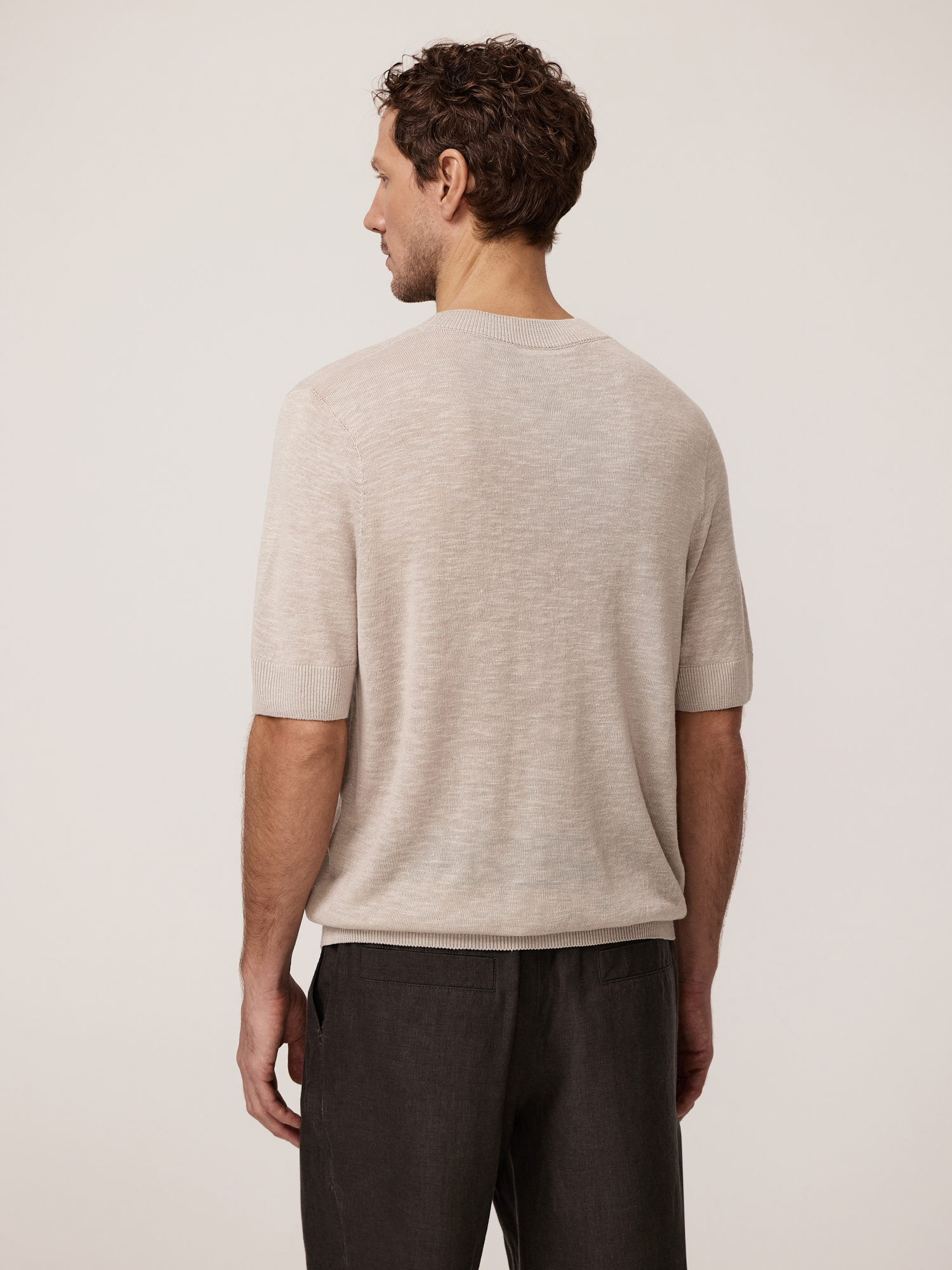 Выбрали для базовой модели премиального качества пряжу изо льна и EcoVeroViscose. Лен обеспечивает натуральность, гипоаллергенность и высокую воздухопроницаемость, что делает футболку комфортной для жаркого времени года. EcoVero Viscose придает мягкость, приятную текстуру и легкий блеск, улучшая эстетику и тактильные ощущения, это экологичное волокно, произведенное с минимальным воздействием на окружающую среду. Футболка выполнена на японской плосковязальной машине Shima Seiki и отличается 12-м классом вязки . Чем выше класс вязки, тем более тонкое, ценное вязаное изделие мы получаем. 12-й класс – один из самых высоких и доступен нам благодаря современному оборудованию фабрики. Футболка связана по бесшовной технологии - это значит, что она создается как единое целое, хорошо держит форму и долго прослужит. Резинка горловины присоединена к цельновязаной модели на кеттельном оборудовании. Эта премиальная, практически незаметная обработка с высокой долей ручного труда и вниманием к деталям, отличается высокой эластичностью, что способствует формоустойчивости изделия. Базовый светло-бежевый оттенок универсален и подойдет для офиса, праздника, прогулки, повседневной носки. Бежевый — это тихая роскошь мужского гардероба. Он не кричит о статусе, но тонко подчеркивает вкус и уверенность.