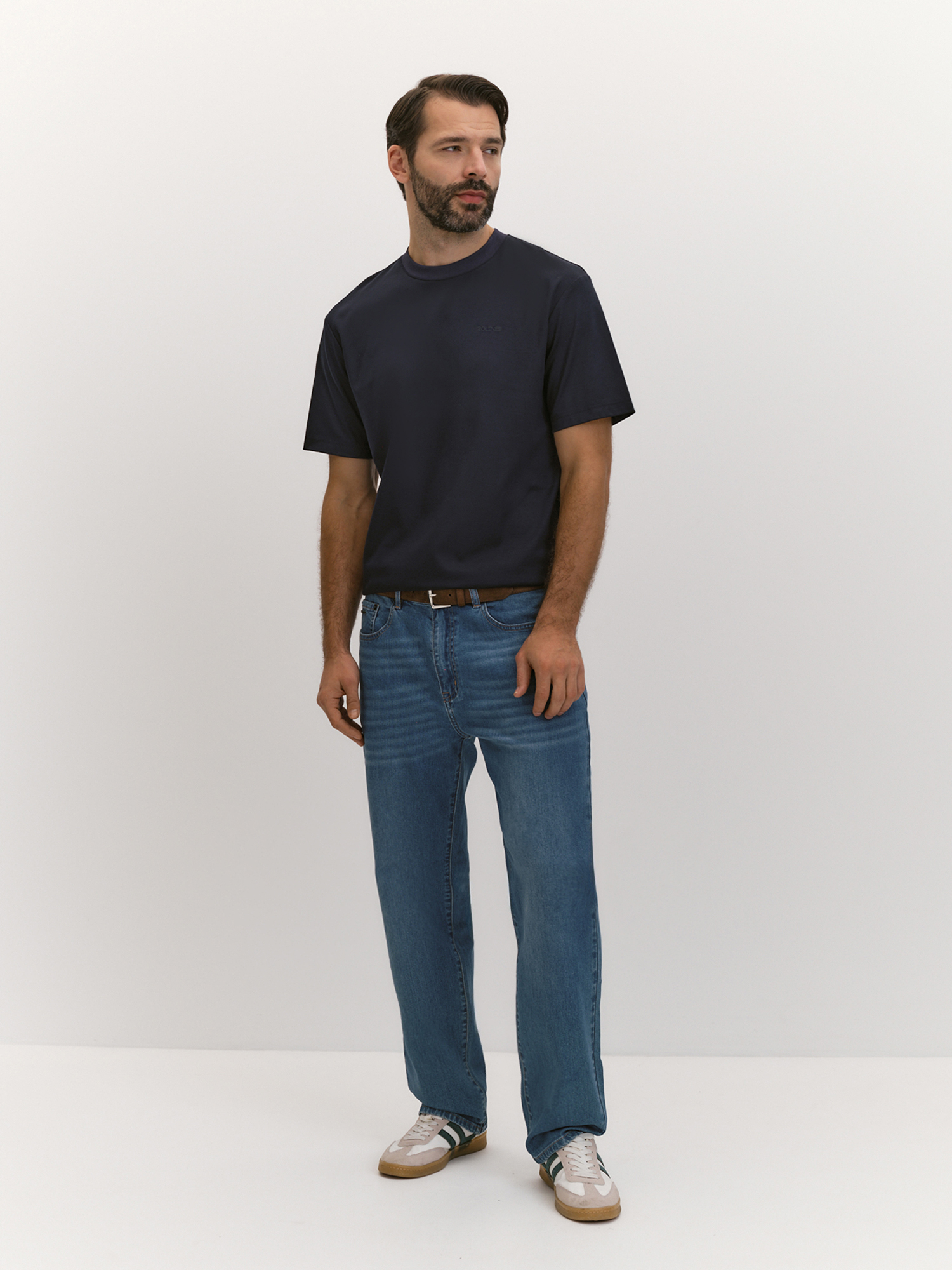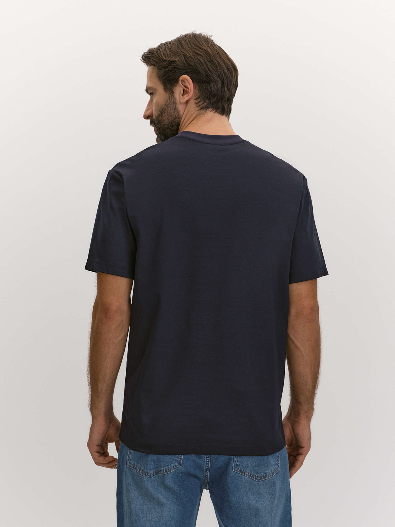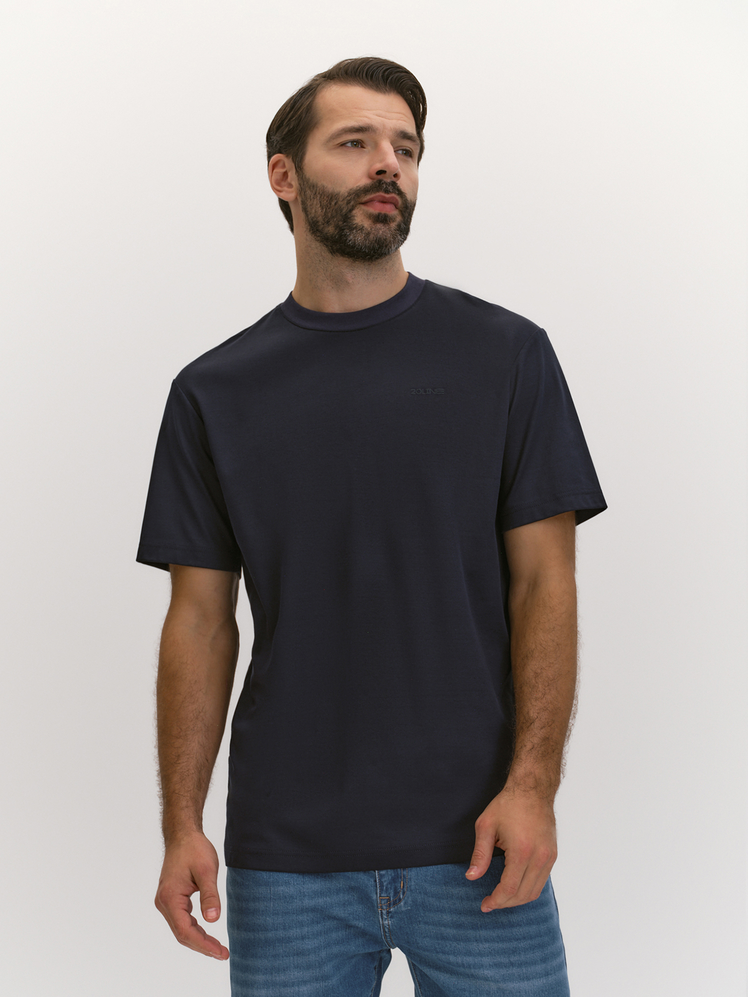 Силуэт regular и премиальный трикотаж способствуют универсальности и долговечности модели. Футболка из 100% мерсеризованного хлопка сочетает в себе прочность, гладкость и уникальный блеск, такие свойства достигаются благодаря специальной обработке ткани. Мерсеризация делает хлопок устойчивым к износу и менее подверженным сминанию, это дополнительно к комфорту, воздухопроницаемости и приятным тактильным ощущениям. Серьезный темно-синий зайдет в гардероб как новый черный и станет не менее востребованным. Крой regular обеспечивает комфортную посадку, подходящую для любого типа фигуры. Короткие рукава обеспечивают комфорт в теплую погоду, а лаконичный круглый вырез с отделкой из хлопкового трикотажа рибана гарантирует формоустойчивость выреза горловины. Брендированный принт, нанесенный на собственном производстве с помощью современной машины для печати по текстилю, становится акцентом, подчеркивающим внимание к деталям . Такая футболка — выражение качества и стиля продукта.