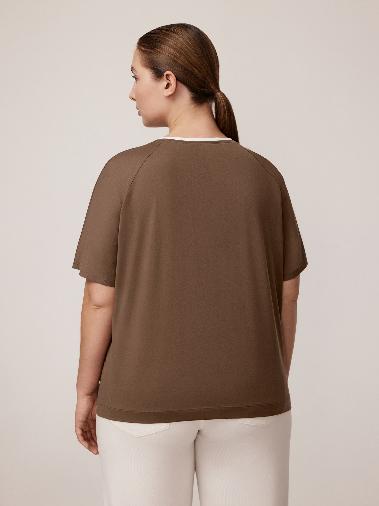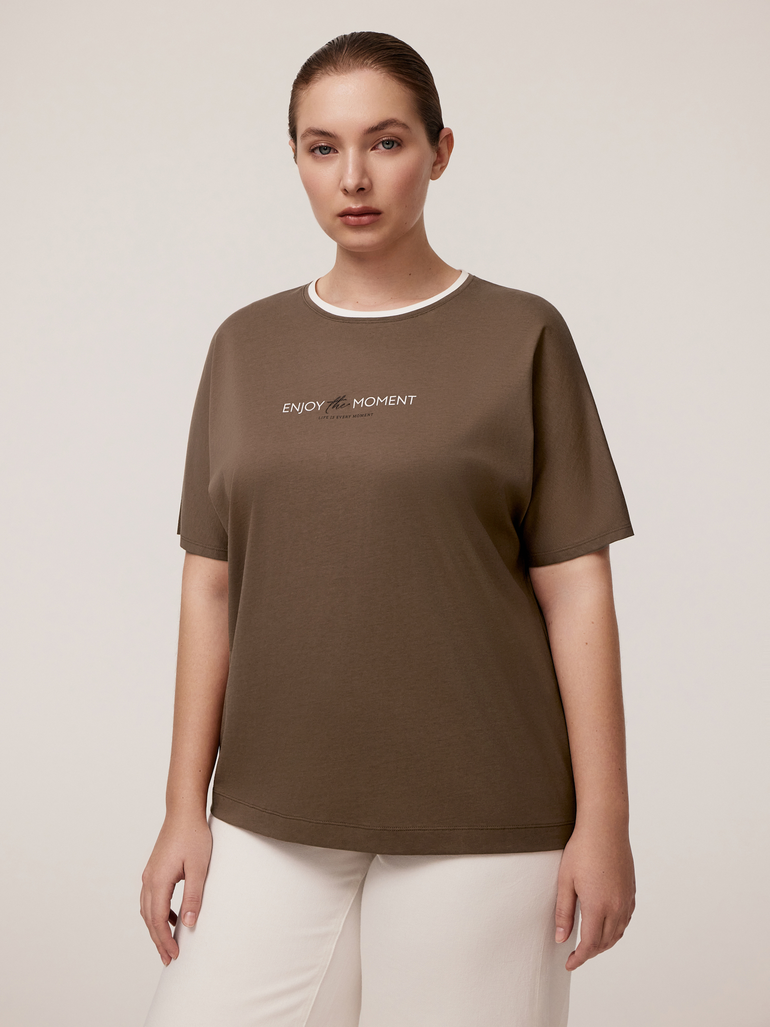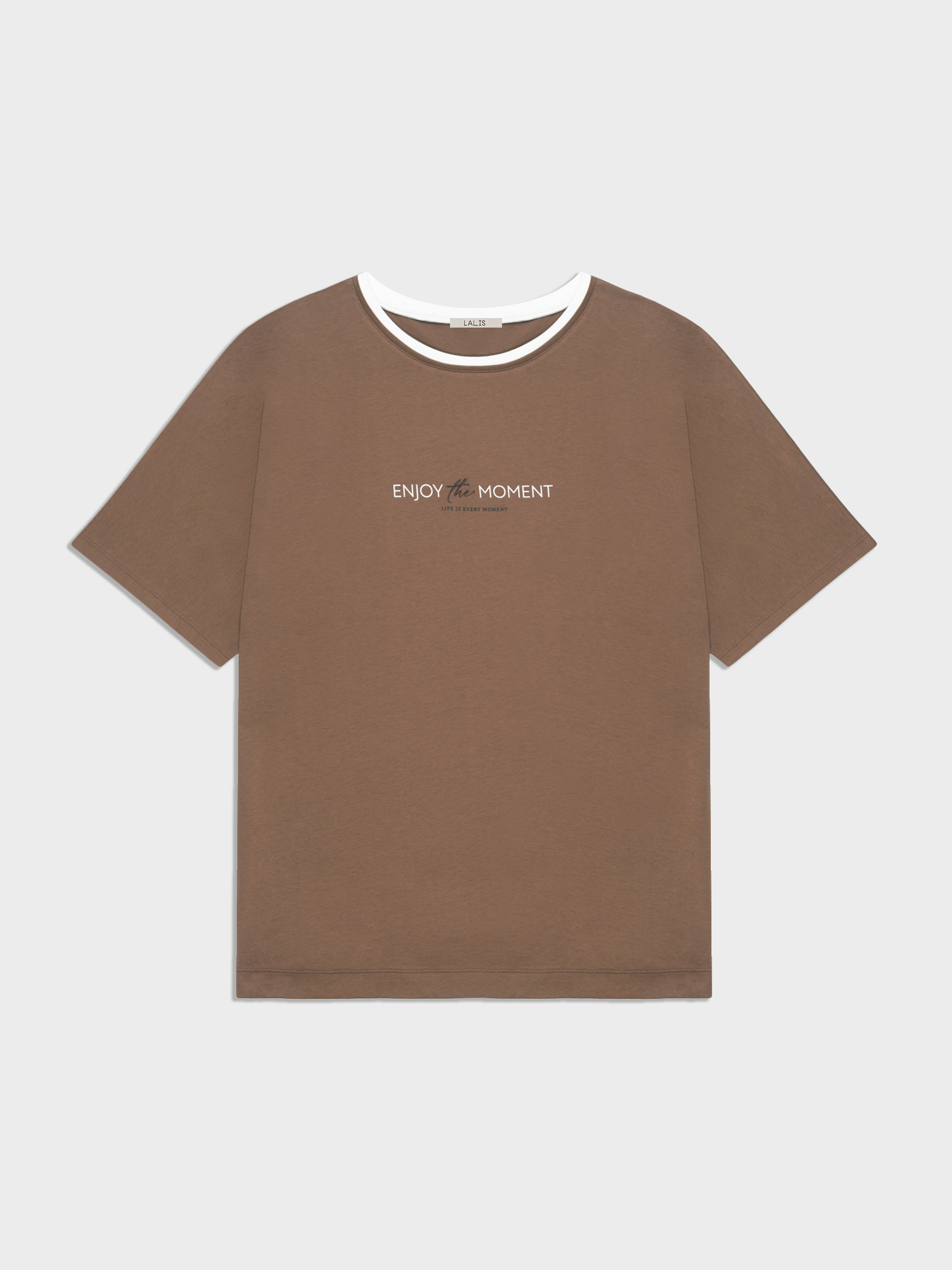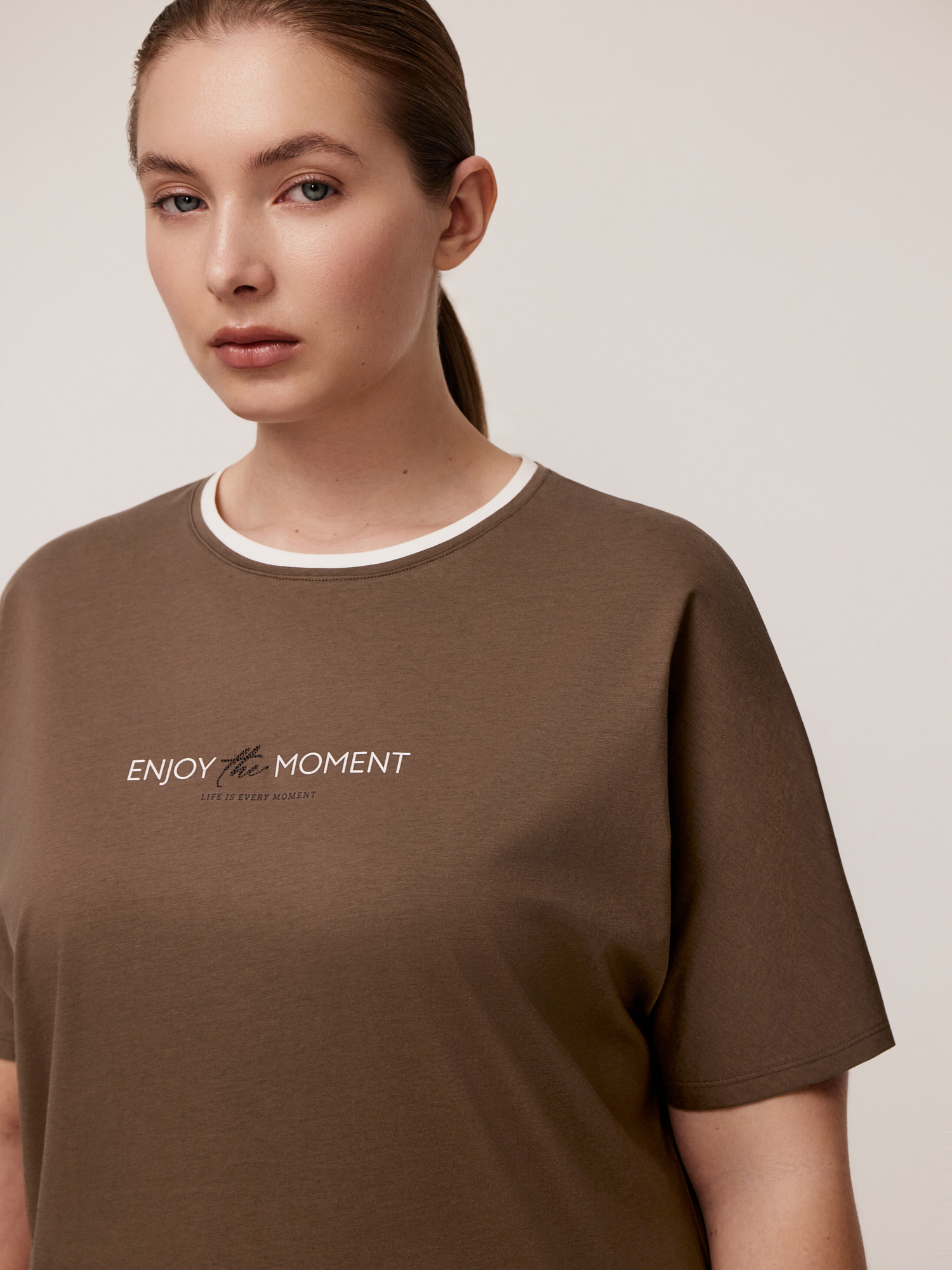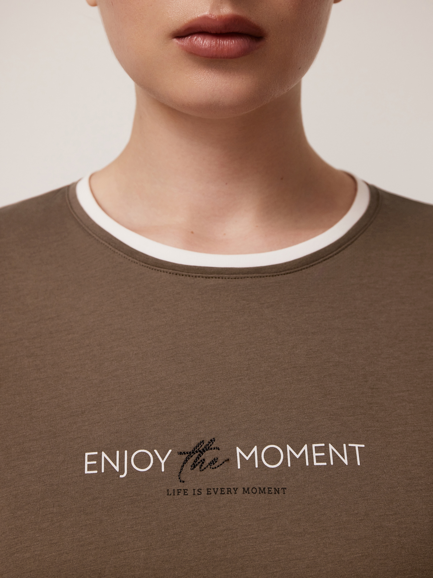 Мягкий премиальный хлопок дарит коже невероятную нежность и комфорт даже в самый жаркий день, все благодаря дышащей структуре натурального волокна. Хлопковый трикотаж «рибана», выбранный для отделки выреза горловины, надежно держит форму, предотвращая растягивание, а также привлекает внимание своей фактурой и белым цветом. Такой кант лаконичного круглого выреза горловины прекрасно сочетается с декором изделия и логично завершает его. Цвет сливочной ириски - насыщенный коричневый с золотисто-медовым подтоном добавит Вашему образу выразительности и глубины. Удобный цельнокроеный рукав обеспечивает полную свободу движений, а контрастный кант подчеркивает графичность принта, делая футболку стильным акцентом в любом образе. Уникальная технология нанесения — сочетание печати по ткани и вышивки, выполненных на высокоточном оборудовании, — гарантирует яркость и четкость надписи. "ENJOY THE MOMENT. Life is every moment" (рус. «Наслаждаюсь моментом. Жизнь - это каждое мгновение») - эта фраза созвучна философии бренда ELIS и обязательно придаст Вашему образу позитивный заряд.