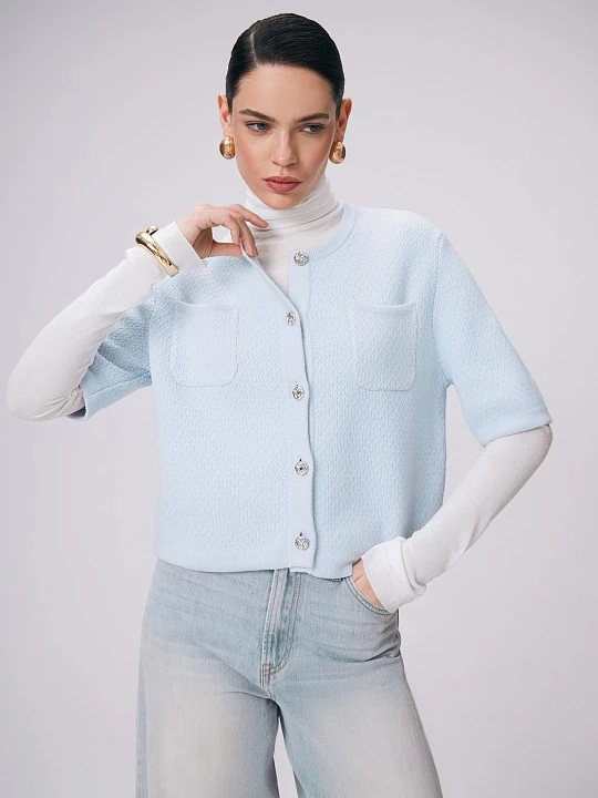 Жакет, вдохновленный классическим стилем Chanel, представляет собой уникальное сочетание элегантности и современности, выполненное из вязаного трикотажа. Дизайнеры стремились создать модель, которая бы отражала изысканность и утонченность, присущие культовому стилю, при этом используя современные технологии и материалы. Изделие выполнено на японской плосковязальной машине Shima Seiki, что позволяет достичь высокой точности и качества вязаного полотна. Использование жаккардовой техники, при которой переплетаются множество нитей, создает уникальный и сложный дизайн, который выделяет модель на фоне других. В качестве основного материала была выбрана российская пряжа из 100% хлопка, что обеспечивает отличную воздухопроницаемость и мягкость на ощупь. Хлопок является гипоаллергенным материалом, что делает его идеальным выбором для людей с чувствительной кожей. Это качество особенно важно для создания комфортной одежды, которая будет носиться в течение всего дня. Часть соединительных швов выполнена на кеттельном оборудовании, что позволяет добиться эластичного и практически незаметного соединения. Такая обработка швов не стесняет движений и делает кардиган удобным и практичным для повседневного использования. Это внимание к деталям подчеркивает премиальный характер продукта и стремление дизайнеров предложить своим клиентам высококачественную и стильную одежду. Бледно-голубой оттенок обладает благородным и аристократичным характером. Этот цвет практически универсален и легко комбинируется с другими оттенками, что позволяет создавать разнообразные образы для различных случаев. Бледно-голубой цвет добавляет свежести и легкости, делая модель идеальным выбором как для деловых встреч, так и для более неформальных мероприятий. Костюм из вязаного жакета и юбки в стиле Chanel не только отражает актуальные модные тренды, но и является символом утонченности и уверенности в себе, вдохновляя на самовыражение через стиль.