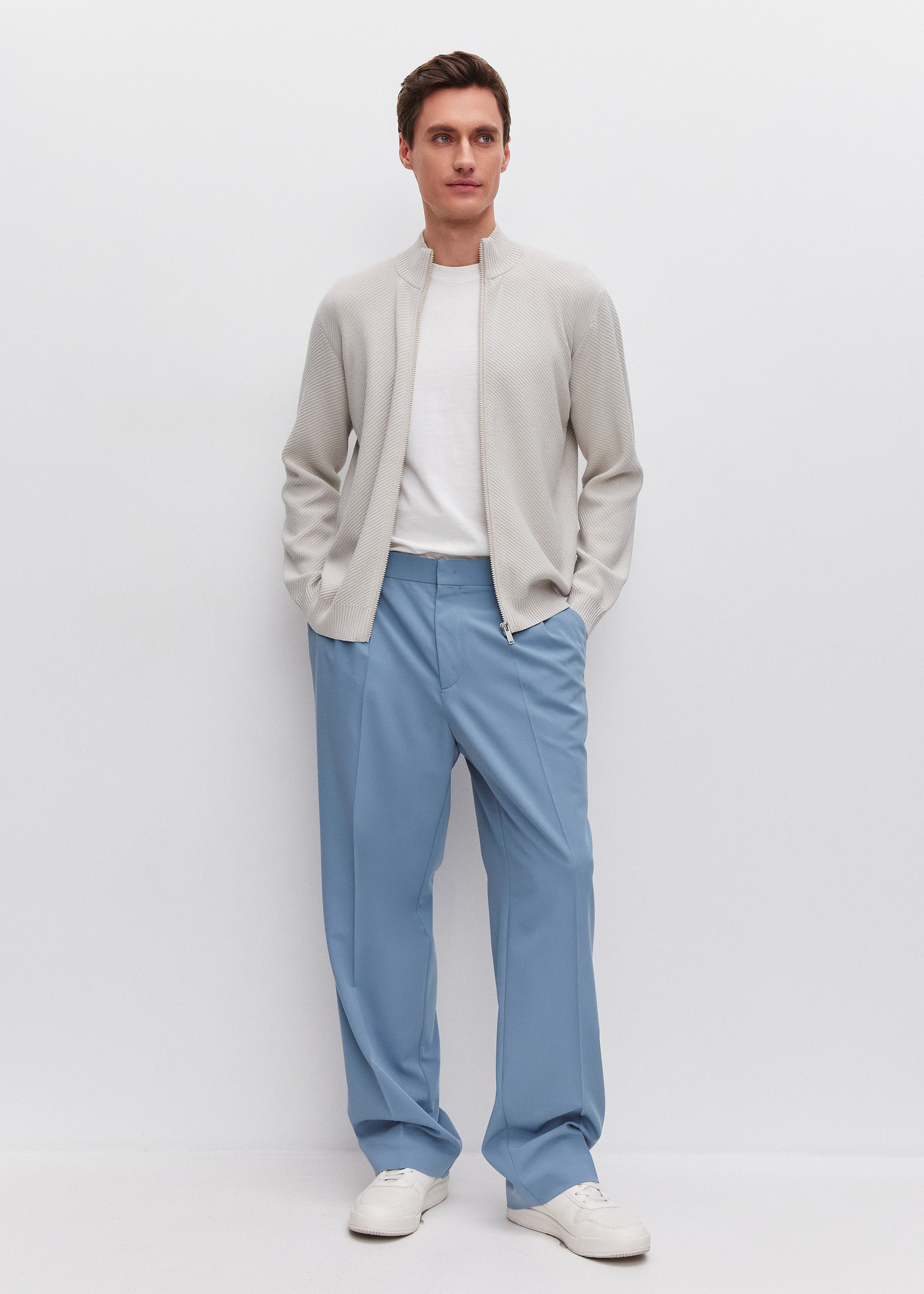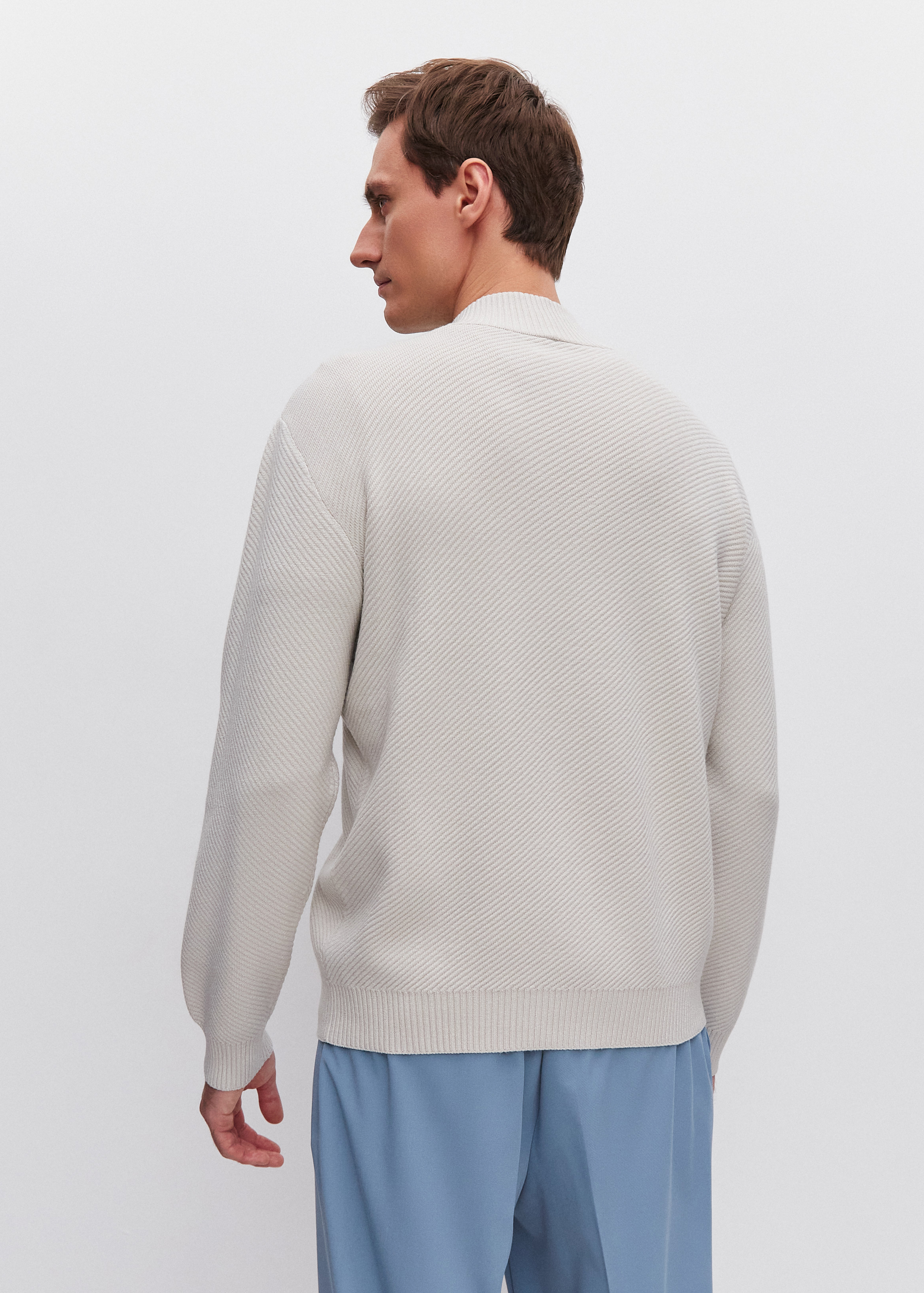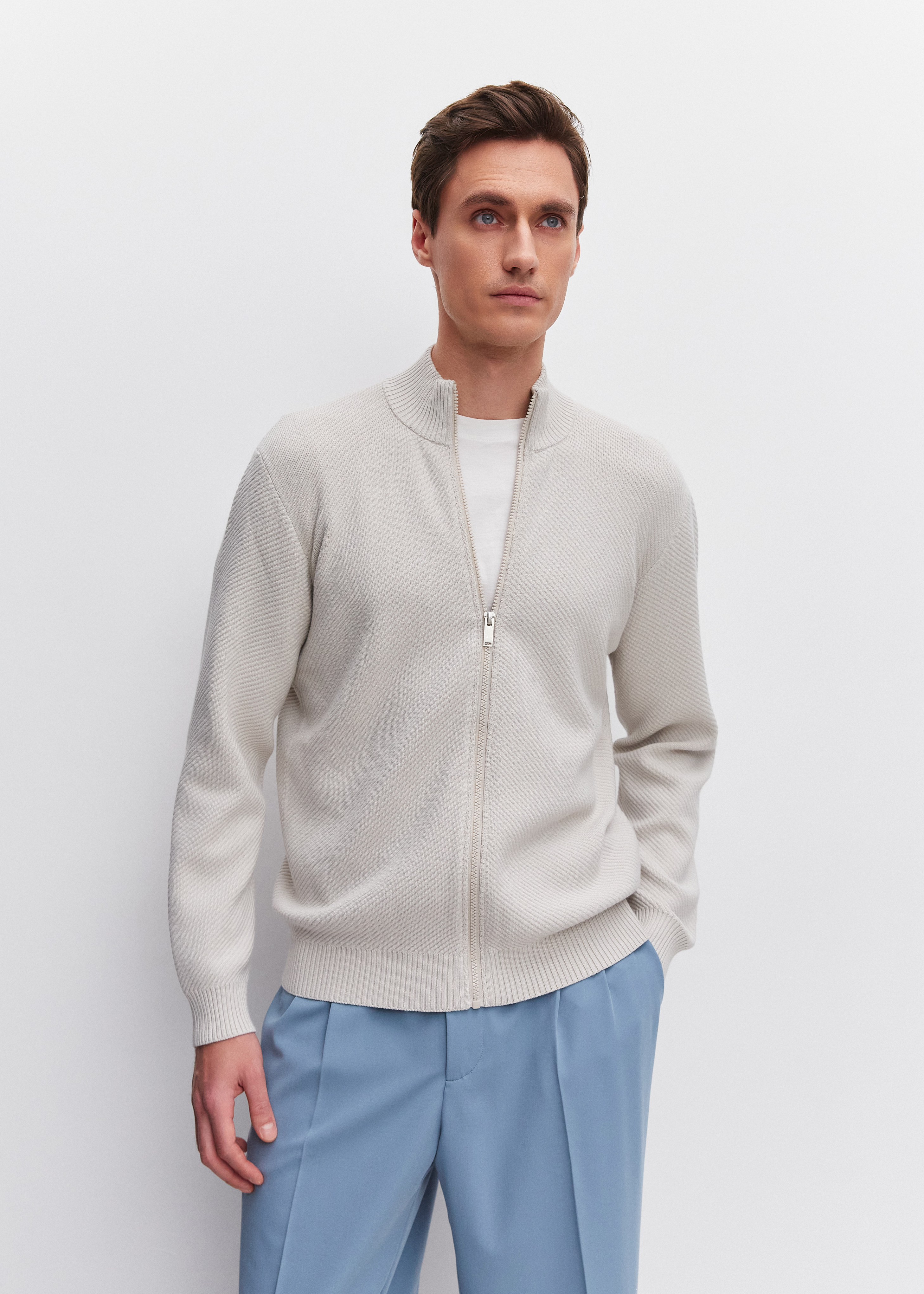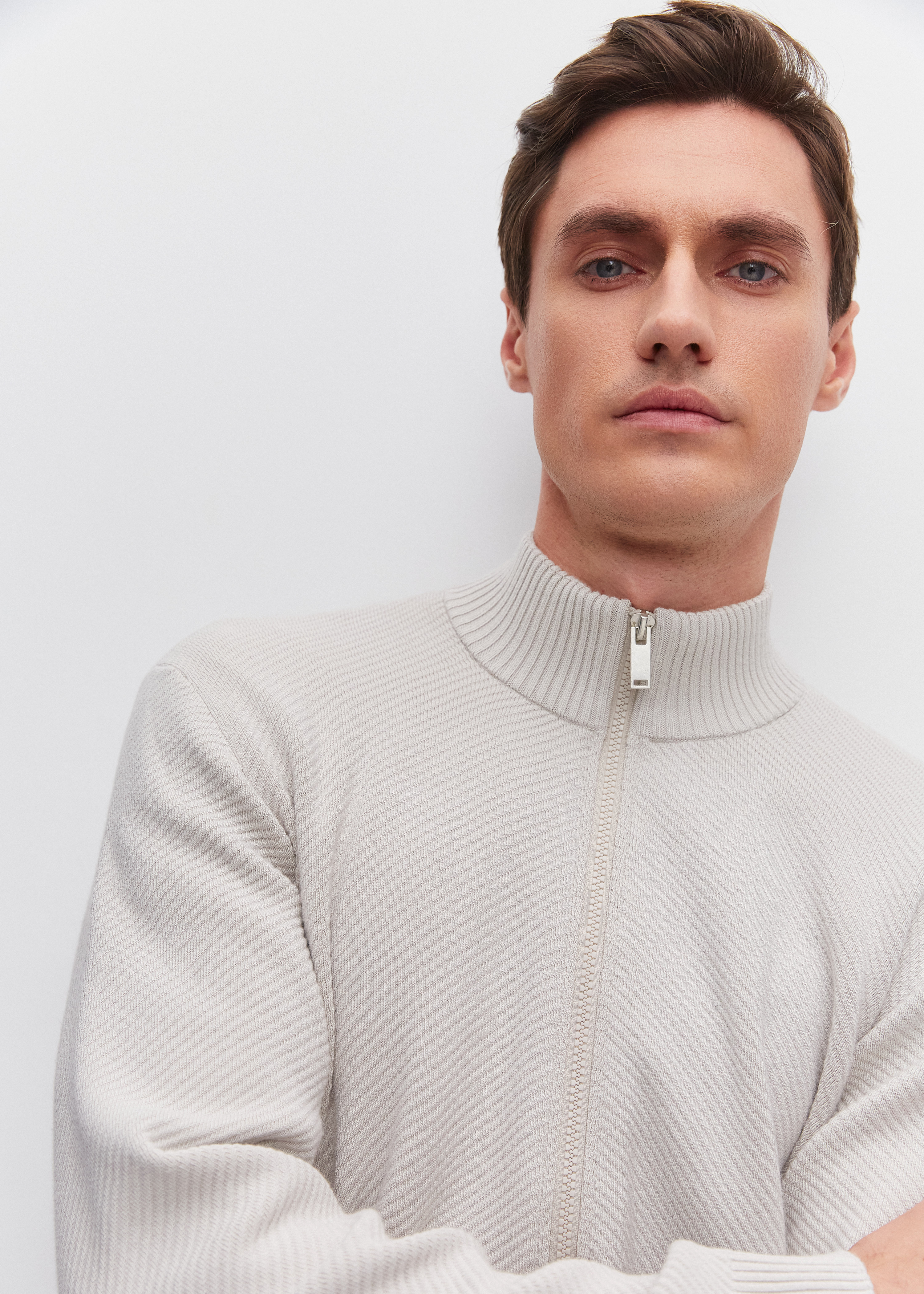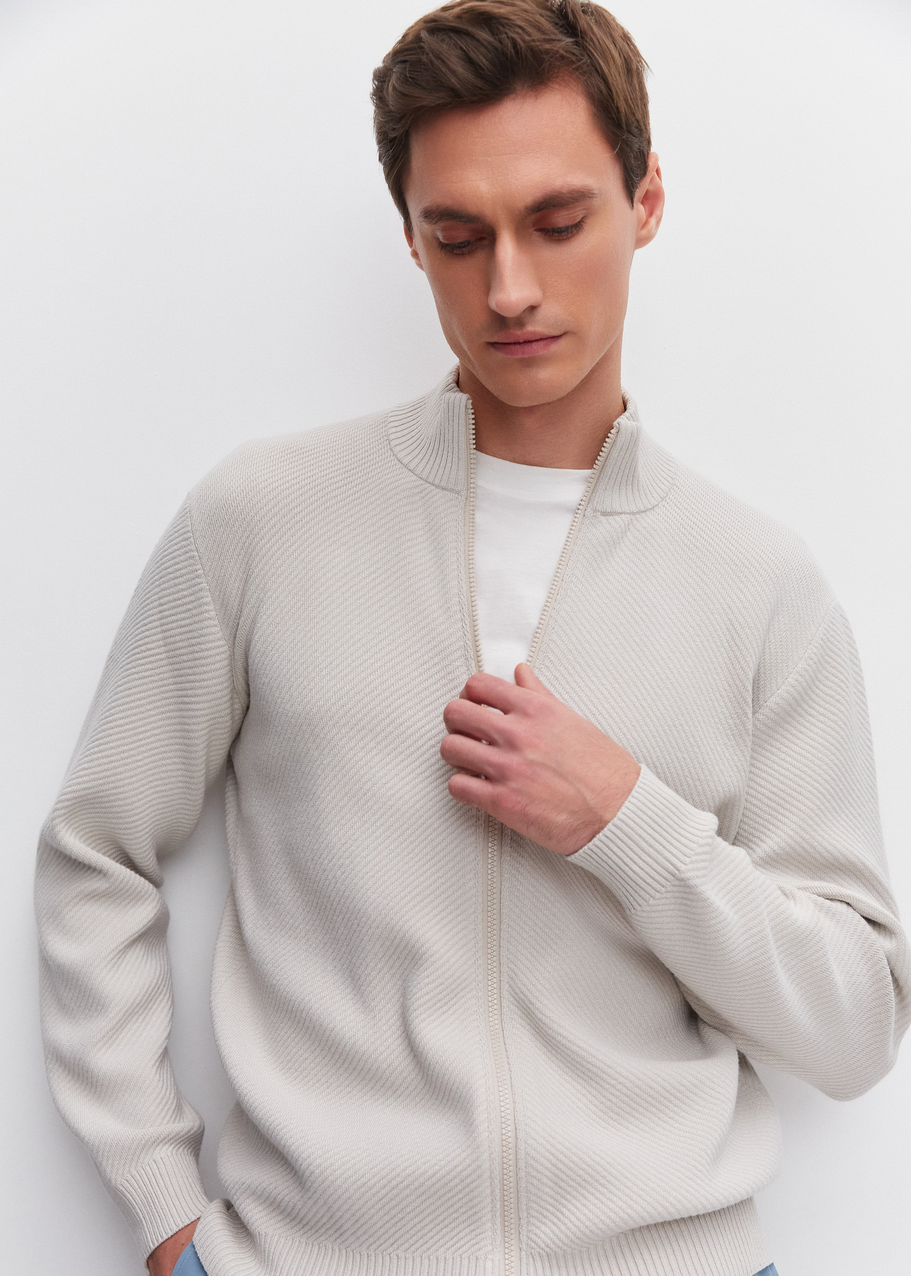 Бежевый кардиган прямого силуэта с высоким воротником, застежкой на молнию, эластичными манжетами и поясом из мягкой пряжи на основе вискозы. Фактурная вязка в крупный диагональный узор, достаточно эластичная и не деформируется. Комфортный вязаный кардиган станет базой повседневного гардероба.