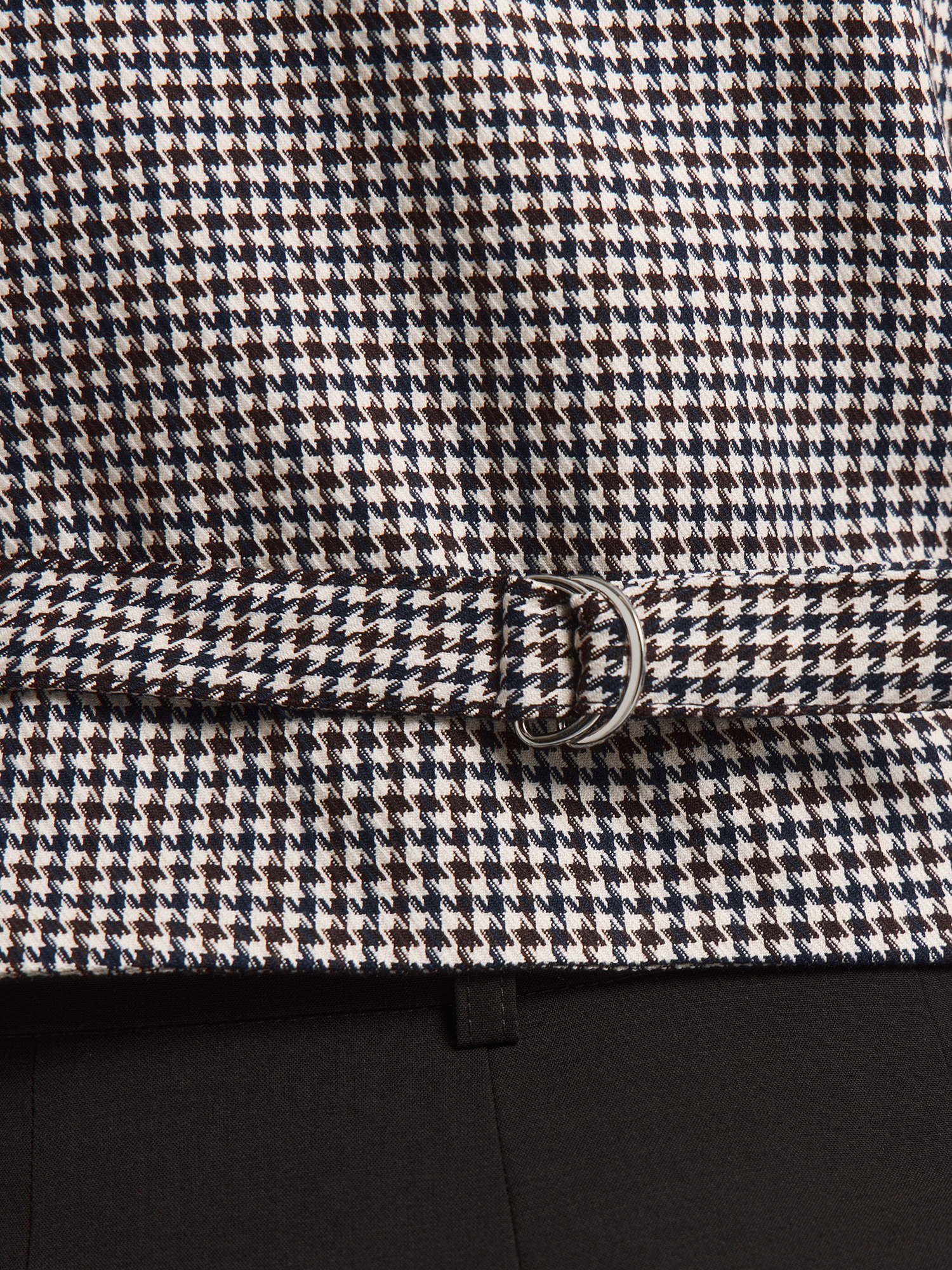 Прямой укороченный крой с V-вырезом и дизайнерскими срезами по борту создаёт лаконичный силуэт. Декоративные карманы «в рамку» дополняют образ в деловом стиле.