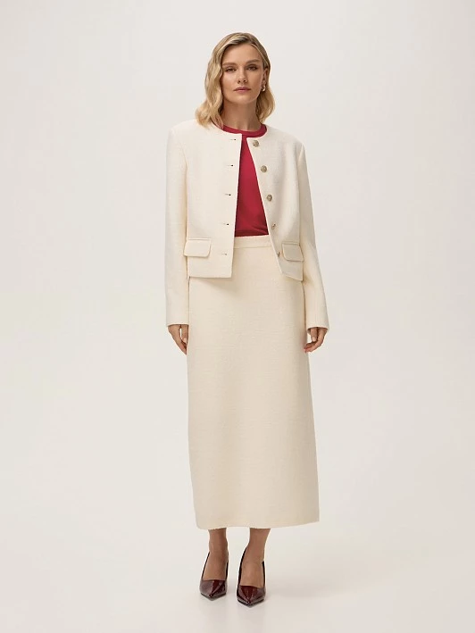 Жакет прекрасно сочетается с юбкой SK0582, а благодаря высокому содержанию шерсти он послужит альтернативой легкой куртке или ветровке.