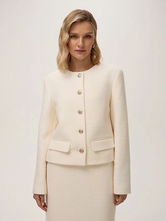 Короткий прямой жакет сшит из тёплой и прочной вареной шерсти с добавлением вискозы. Такая ткань приятна на ощупь, хорошо держит форму и имеет аккуратный внешний вид. Внутри — удобная подкладка для комфорта и лучшей посадки.