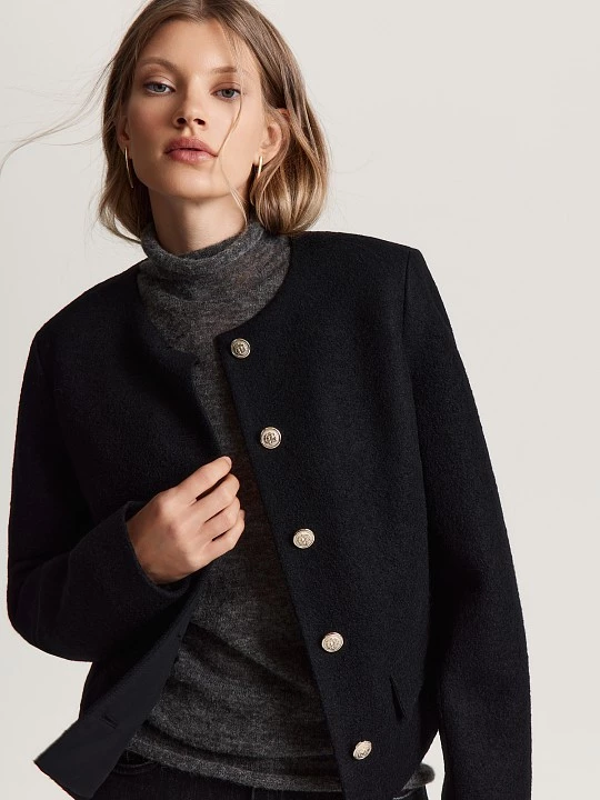 Модель с длинными втачными рукавами, круглым вырезом и декоративными клапанами застёгивается на эффектные гербовые пуговицы. Классический черный цвет и лаконичный дизайн делают жакет универсальным — он идеально дополнит образы в стиле old money или повседневный casual.