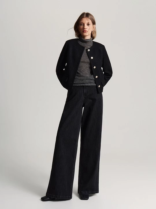 Короткий прямой жакет сшит из тёплой и прочной вареной шерсти с добавлением вискозы. Такая ткань приятна на ощупь, хорошо держит форму и имеет аккуратный внешний вид. Внутри — удобная подкладка для комфорта и лучшей посадки.