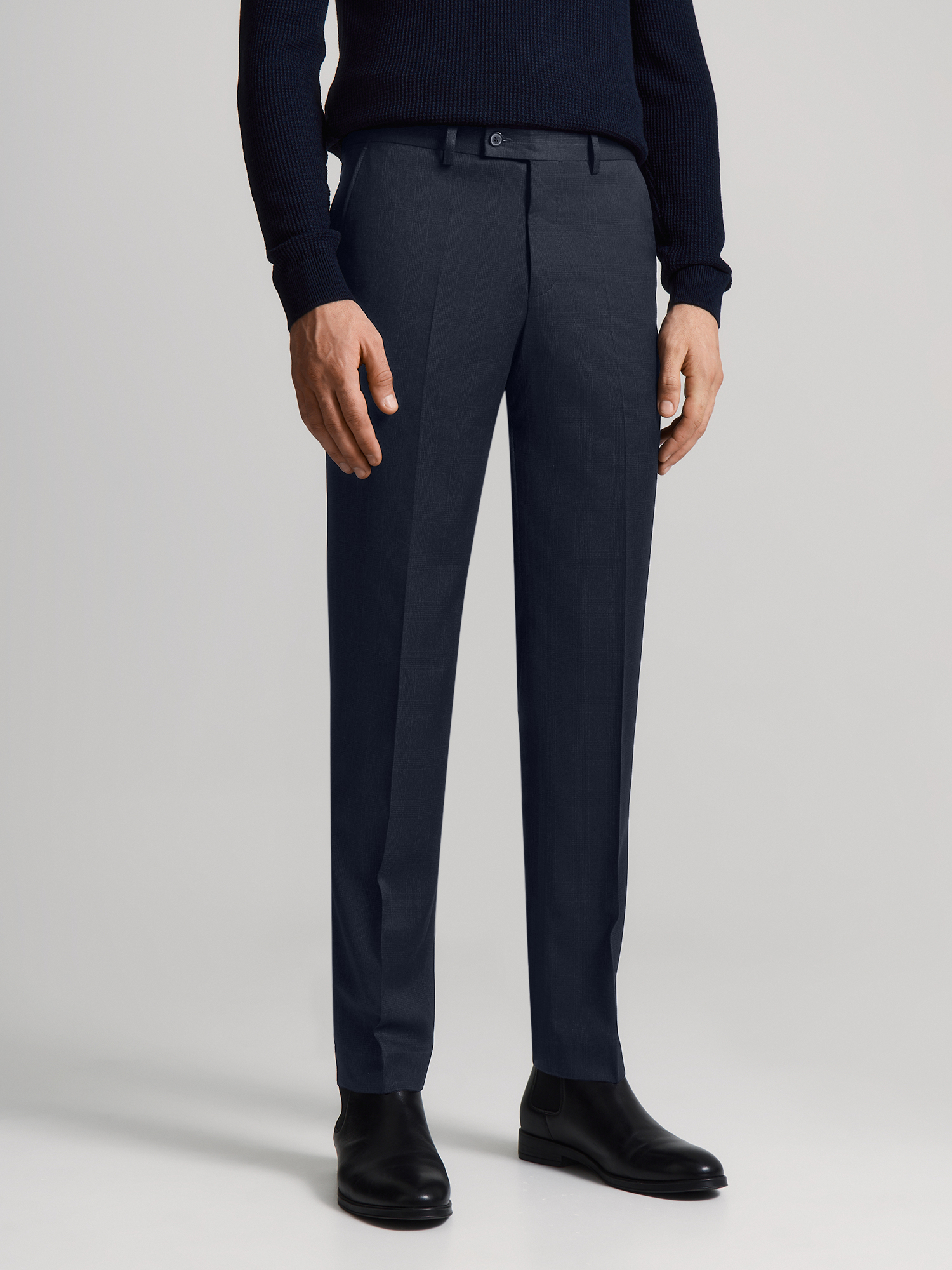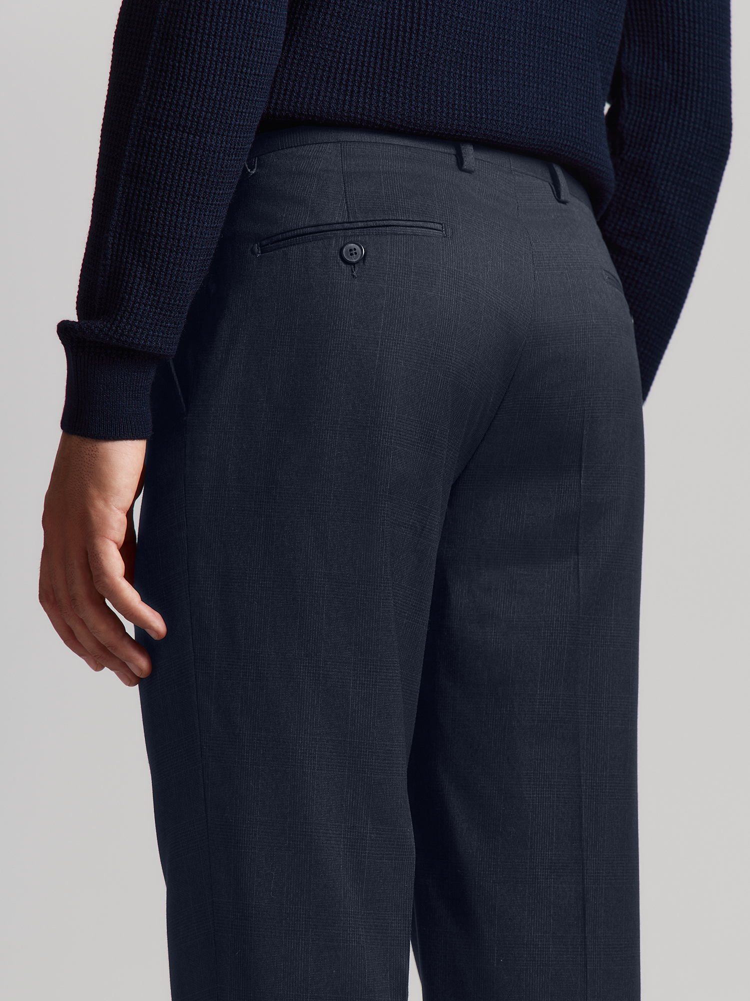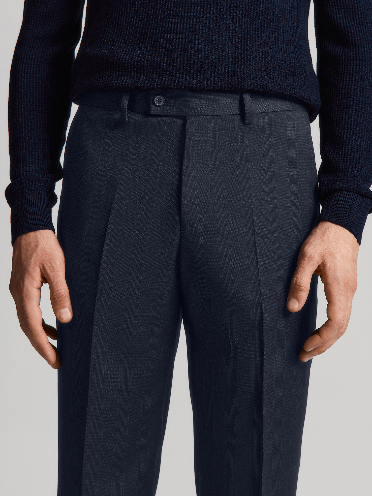 Зауженные брюки на притачном поясе со шлевками одновременно самодостаточны и прекрасно дополняют однобортный костюмный пиджак. Пояс на корсажной ленте обеспечивает отличную посадку и дисциплинирует. Брюки выполнены с традиционной застежкой-гульфиком, с косыми боковыми карманами, усиленными закрепками, и задними прорезными карманами в рамку с фиксацией на пуговицу. Для продления срока службы изделия и лучшей посадки брючин с плавным сужением добавлена частичная подкладка по передним полотнищам модели. Костюмная вискозная ткань хорошо подходит для создания мужских формальных брюк, она воздухопроницаема, долговечна, практически не мнется. Современная интерпретация виндзорской клетки в лаконичном черно-синем позволяет адаптировать модель в самые разные образы, брюки можно надеть в праздничный день, на выпускной, в школу, в офис.