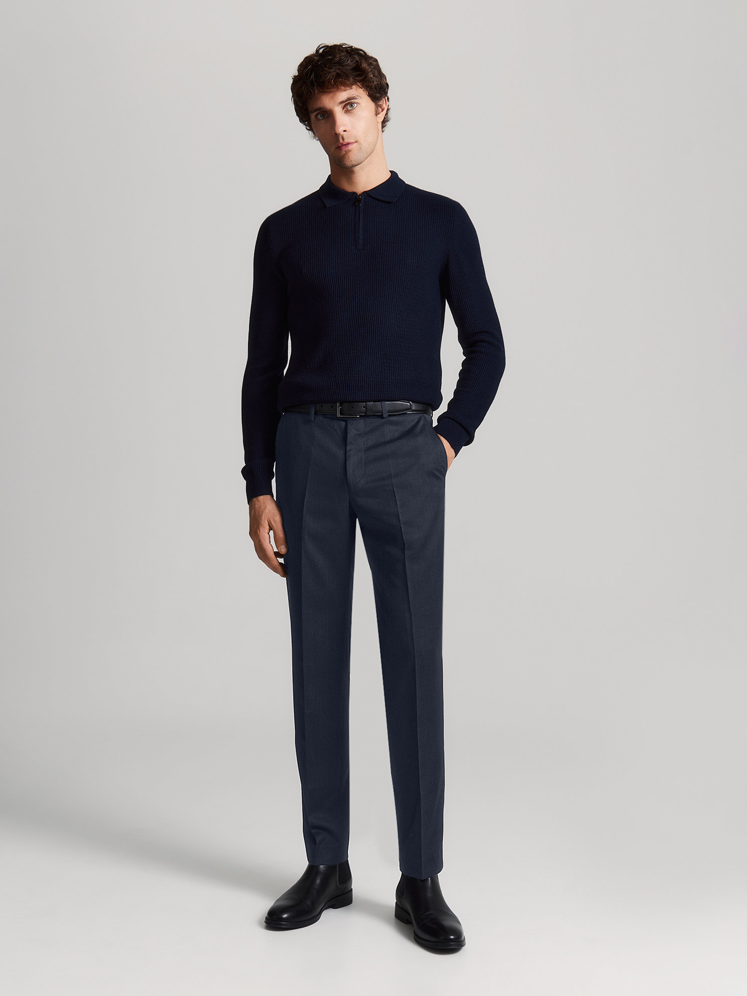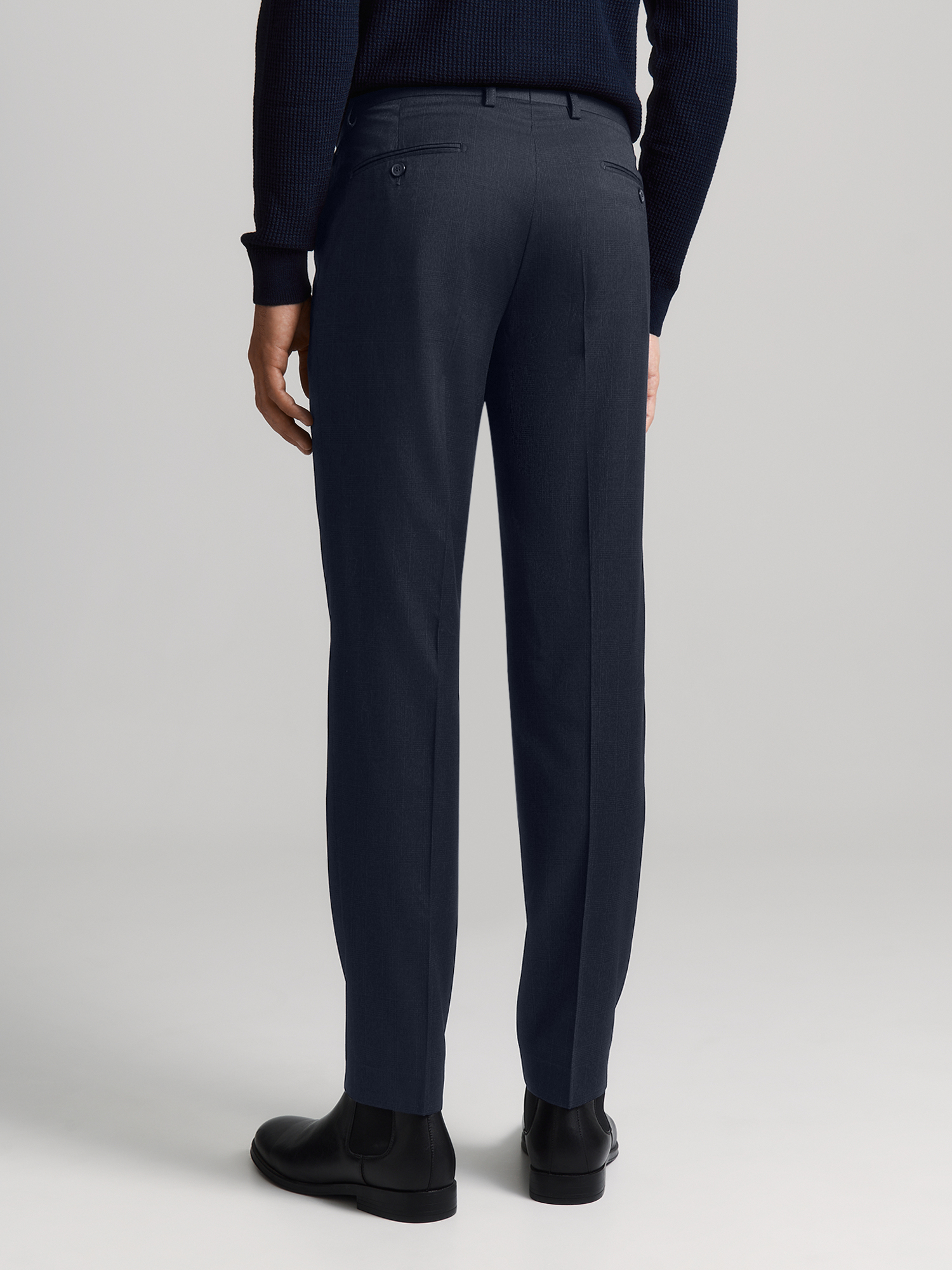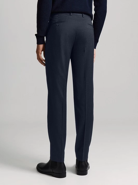 Зауженные брюки на притачном поясе со шлевками одновременно самодостаточны и прекрасно дополняют однобортный костюмный пиджак. Пояс на корсажной ленте обеспечивает отличную посадку и дисциплинирует. Брюки выполнены с традиционной застежкой-гульфиком, с косыми боковыми карманами, усиленными закрепками, и задними прорезными карманами в рамку с фиксацией на пуговицу. Для продления срока службы изделия и лучшей посадки брючин с плавным сужением добавлена частичная подкладка по передним полотнищам модели. Костюмная вискозная ткань хорошо подходит для создания мужских формальных брюк, она воздухопроницаема, долговечна, практически не мнется. Современная интерпретация виндзорской клетки в лаконичном черно-синем позволяет адаптировать модель в самые разные образы, брюки можно надеть в праздничный день, на выпускной, в школу, в офис.