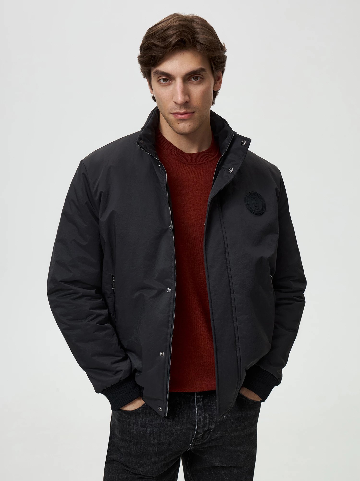 Стильный бомбер силуэта regular подойдет для образа в спортивном, кэжуал и смарт кэжуал стиле. Модель хорошо защищает холодного ветра, выполнена с внешним ветрозащитным клапаном и традиционными для бомбера подвязами из вискозной пряжи по низу и рукавам. Благодаря полному циклу производства, подвязы созданы на собственной фабрике с помощью японских плосковязальных машин Shima Seiki. Для дополнительной функциональности, куртка дополнена прорезными боковыми карманами на молнии и внутренними карманами с небольшими клапанами и слайдерами из шнурков. Для стилизации бомбер декорирован круглым брендированным бейджем, молниями с брендированными пуллерами и репсовой тесьмой с внутренней стороны. Осенний тонкий пуховик выполнен из качественной нейлоновой плащевой ткани с влагозащитной пропиткой и утеплен качественным синтепоном. Классический черный хорошо сочетается с денимом, моделями из костюмной ткани и из трикотажного полотна капсулы.