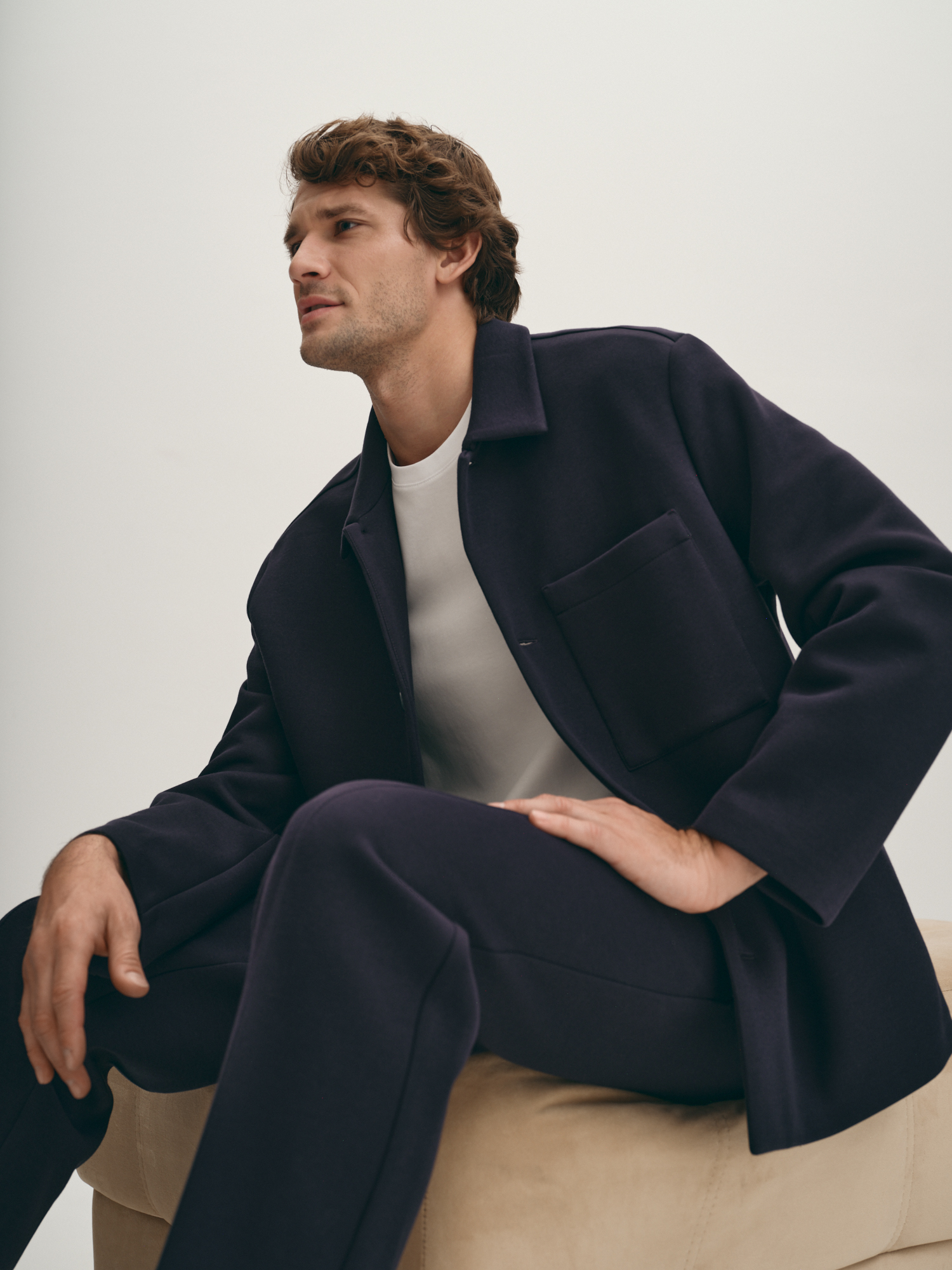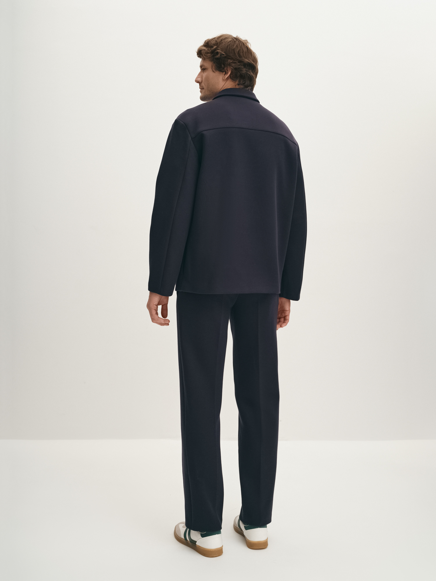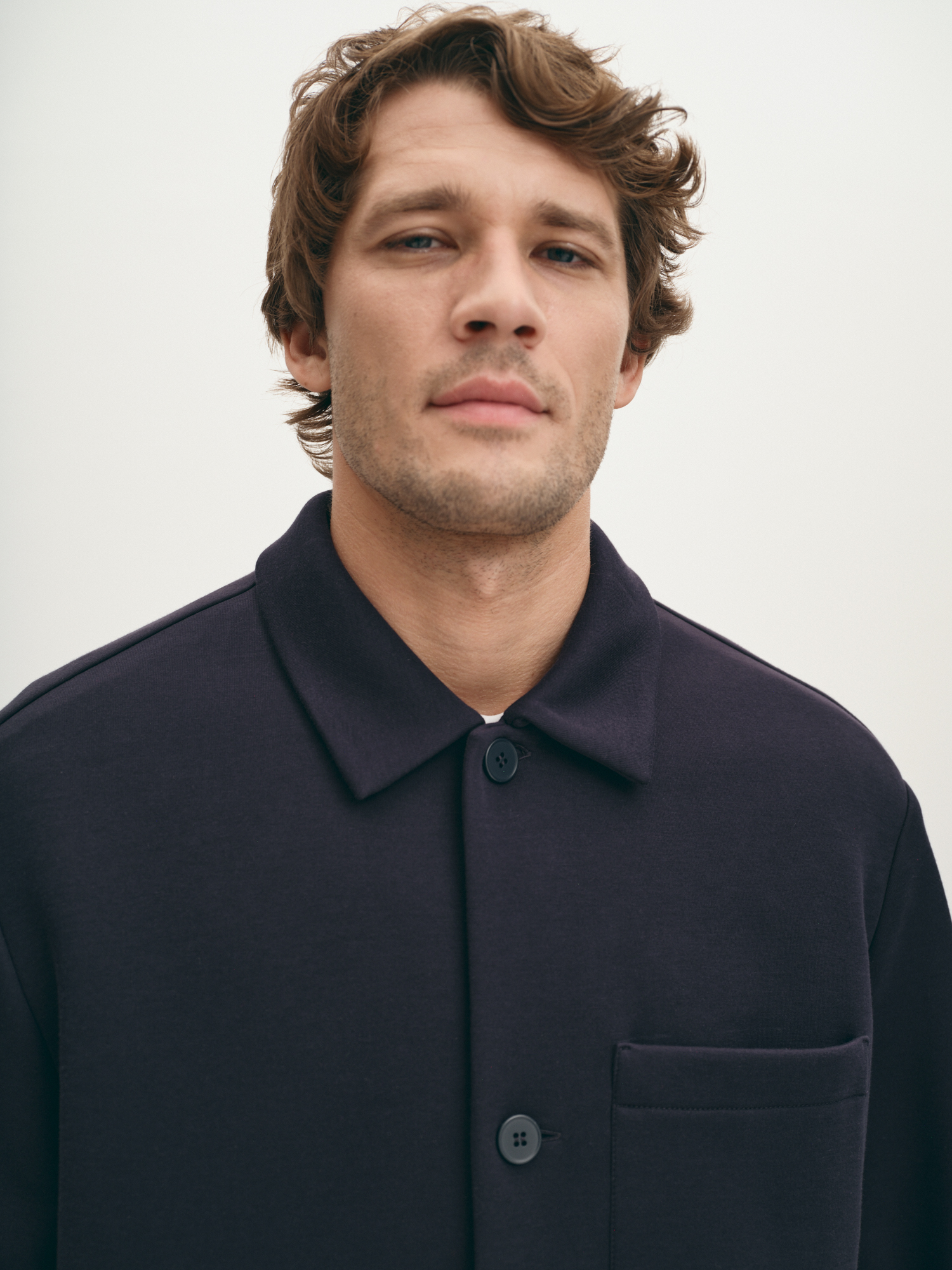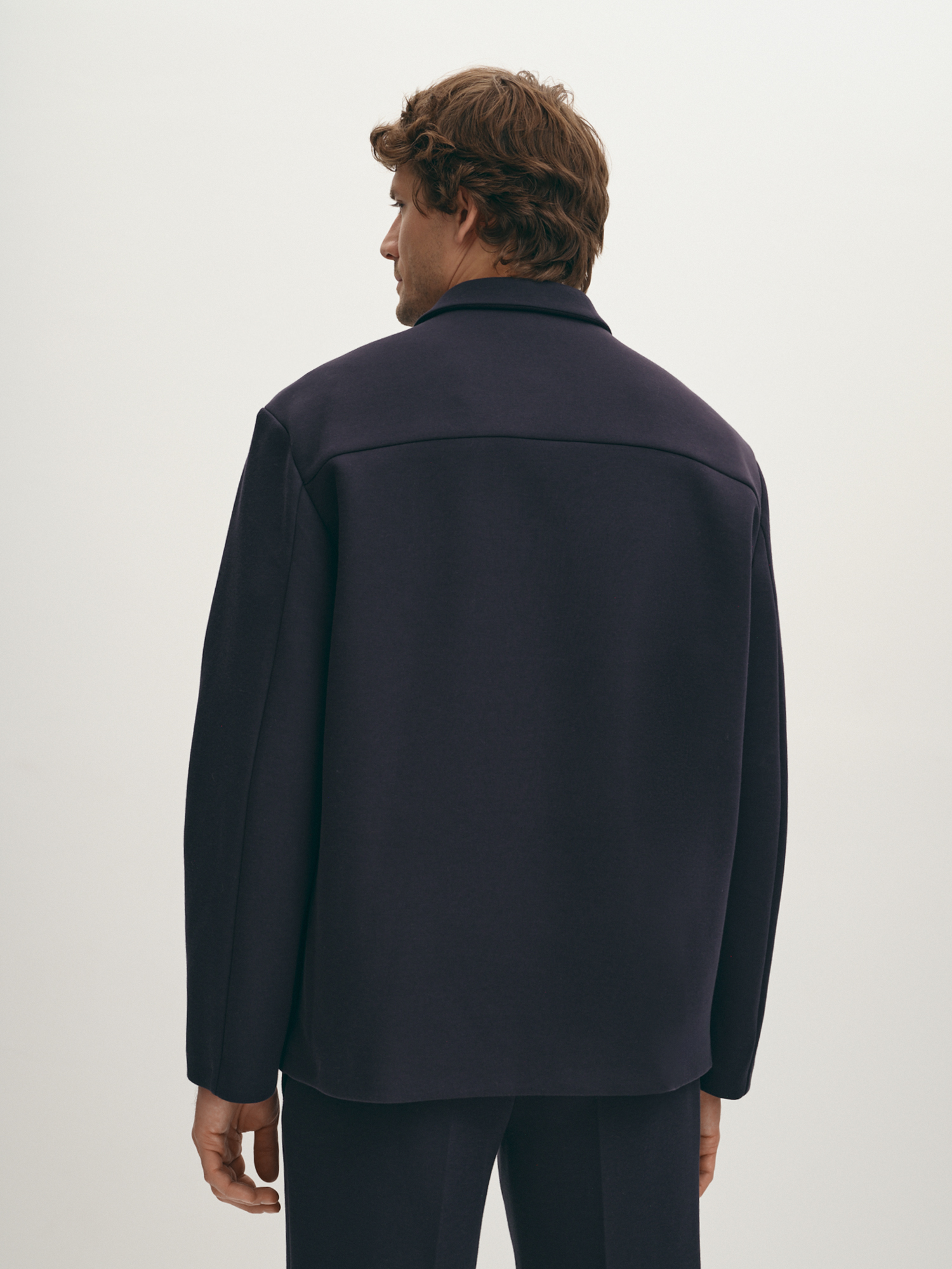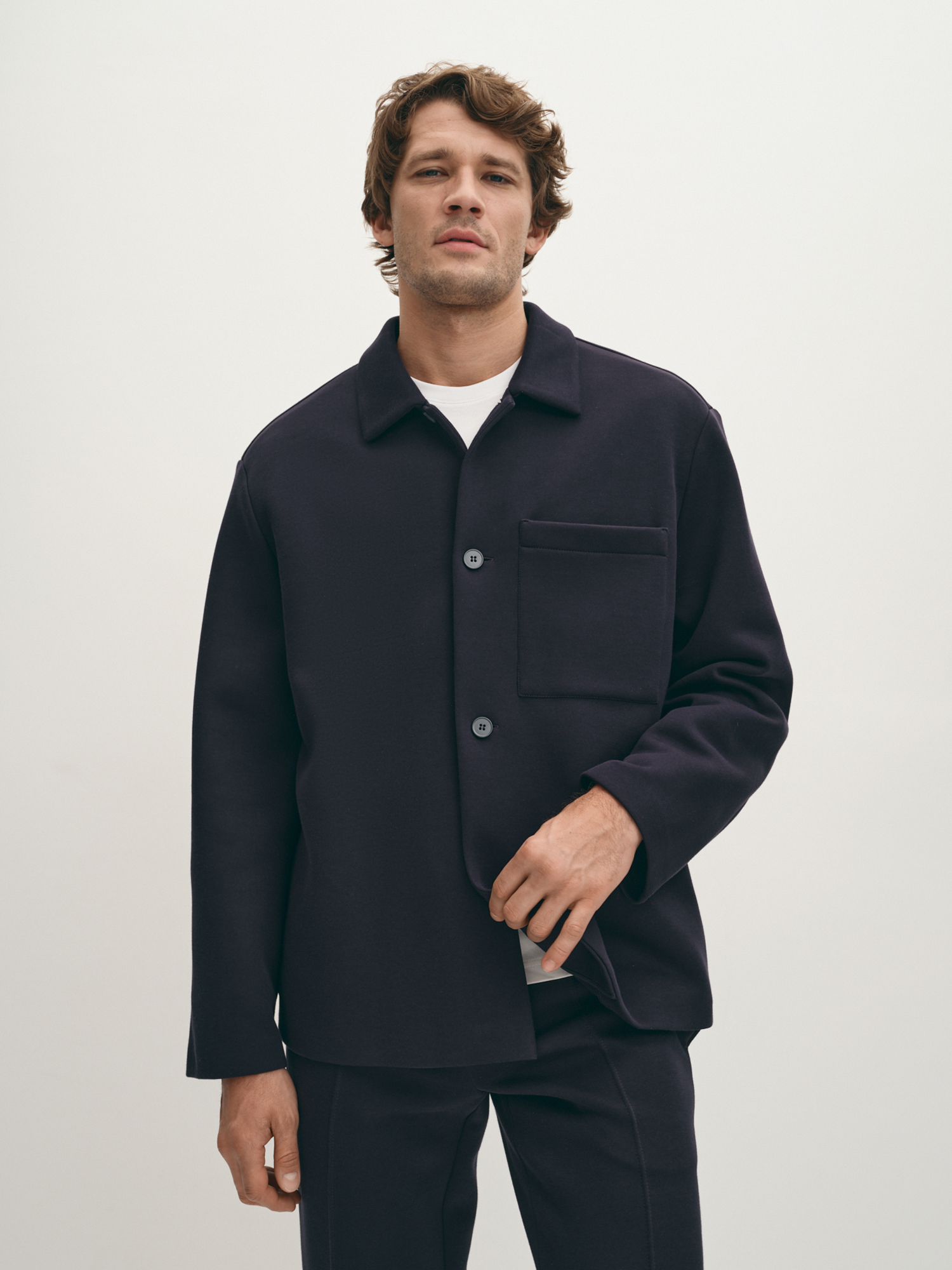 Модная легкая демисезонная куртка из неопрена с хлопком без подкладки подходит для осенней прохлады. Модель с отложным воротником, втачным рукавом, на пуговицах и с функциональным нагрудным карманом напоминает по крою рубашку. Куртка в универсальном темно-синем актуальна и как модная классика, и как короткая спортивная. Если подобрать размер куртки на один-два больше, можно формировать актуальный силуэт оверсайз.