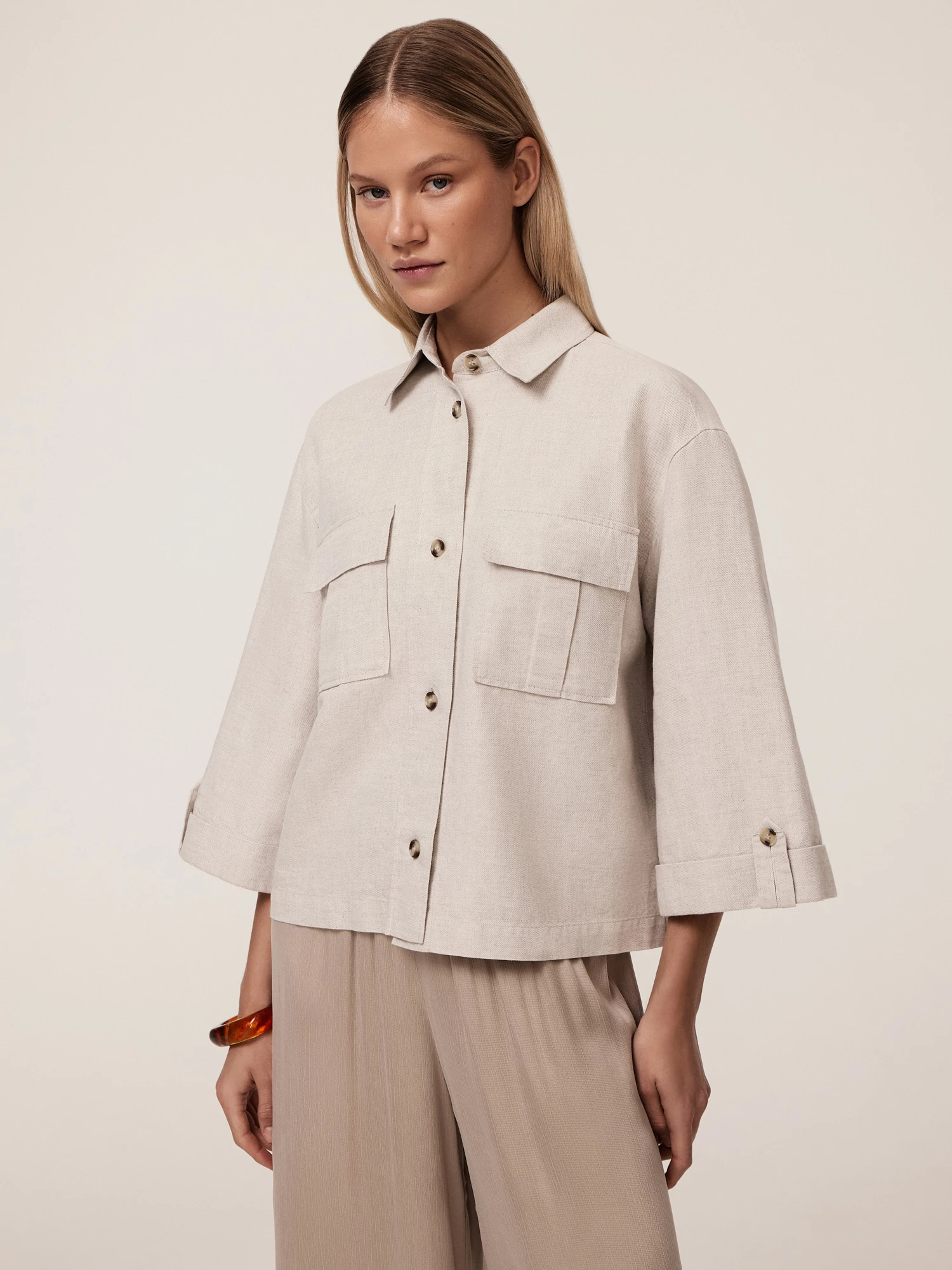 Легкая куртка прямого кроя невероятно удобна. Ткань из натуральных волокон льна и хлопка поддерживает комфортную температуру. Лен — это экологически чистый материал, который обеспечивает высокий уровень комфорта и безопасности для кожи. Он хорошо пропускает воздух и обладает терморегуляцией, как раз поддерживая комфортную температуру тела в жаркую погоду. Лен впитывает влагу и быстро испаряет её, обеспечивая ощущение сухости и комфорта даже в условиях высокой влажности. Его износостойкость и антибактериальные свойства делают куртку практичной и гигиеничной. Хлопок добавляет мягкость и комфорт, делая рубашку приятной для носки. Прямой крой и укороченный рукав не сковывают движения. Оригинальны петли на патах, образованные закрепками на полосках ткани, а также накладные карманы с заутюженной складкой. Небольшой отложной воротник на отрезной стойке дисциплинирует модель и позволяет адаптировать жакет, помимо прочего, в классические образы. Натуральный светло-бежевый оттенок куртки универсален и легко сочетается с другими элементами гардероба, делая модель идеальной базой для создания различных образов.