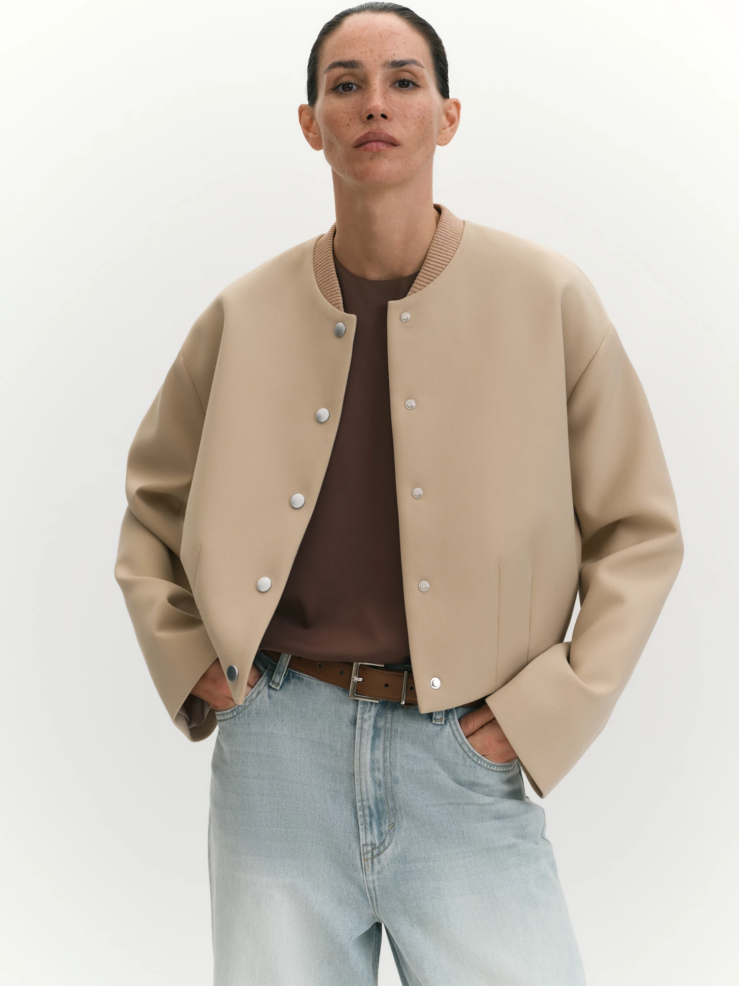 Бомбер — это практичная и актуальная куртка, сочетание ретро-эстетики с современным уличным стилем. Мягкие и эластичные подвязы, выполненные на собственной фабрике из качественной пряжи на основе нежной вискозы, обрамляют низ спинки и круглый вырез, добавляя образу утонченности и подчеркивая ретро-шарм. Каждая деталь бомбера продумана до мелочей: плотная поливискозная ткань саржевого переплетения придает куртке износостойкость и особую текстуру, а подкладка из вискозы и полиэстера обеспечивает легкость, мягкость, дышащие свойства и прекрасную посадку. Спандекс в составе ткани добавляет эластичность, делая бомбер удобным и комфортным в носке, а также формоустойчивым. Песочно-бежевый оттенок Сафари, нейтральный и универсальный, сочетается с любыми оттенками, делая бомбер идеальным участником самых разных образов. О-силуэт, созданный благодаря подвязу по низу спинки и четырем вертикальным вытачкам, придает куртке объемный, но при этом актуальный вид, подчеркивая современный крой и обеспечивая комфорт. Спущенное плечо и втачной рукав хорошей ширины добавляют образу комфорта, расслабленности и свободы движений, а стильные серебристые кнопки завершают образ, добавляя современный акцент и являясь надежной застежкой. Этот бомбер подчеркнет Ваш хороший вкус и обеспечит ощущение уюта.