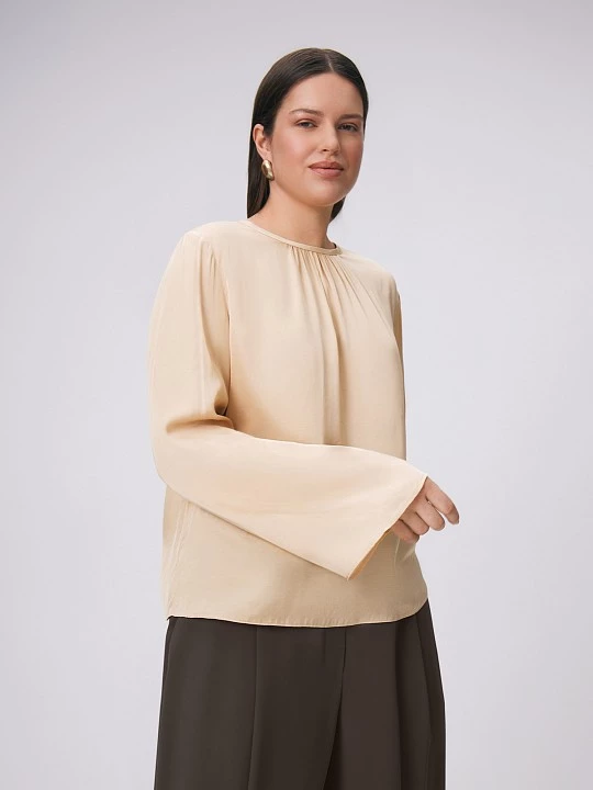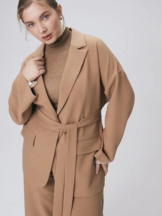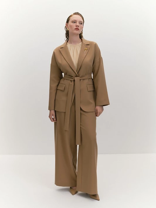 Создали жакет однобортным, с застежкой на одну пуговицу и обрамили V-вырез классическим английским воротником, сделав акцент на зоне декольте и визуально вытянув силуэт. Клапаны прорезных карманов прекрасно балансируют модель, делая талию, подчеркнутую поясом, еще заметнее. Втачной длинный спущенный рукав смягчает линию плеча, делая пиджак более женственным. Вискозная костюмная ткань хорошо держит форму, долговечна и тактильно приятна. Сочетание жакета с брюками палаццо в базовом оттенке цвета тростникового сахара - бесспорный must have. В сочетании с соответствующими аксессуарами, такой комплект вполне способен выступить как вечерний.
