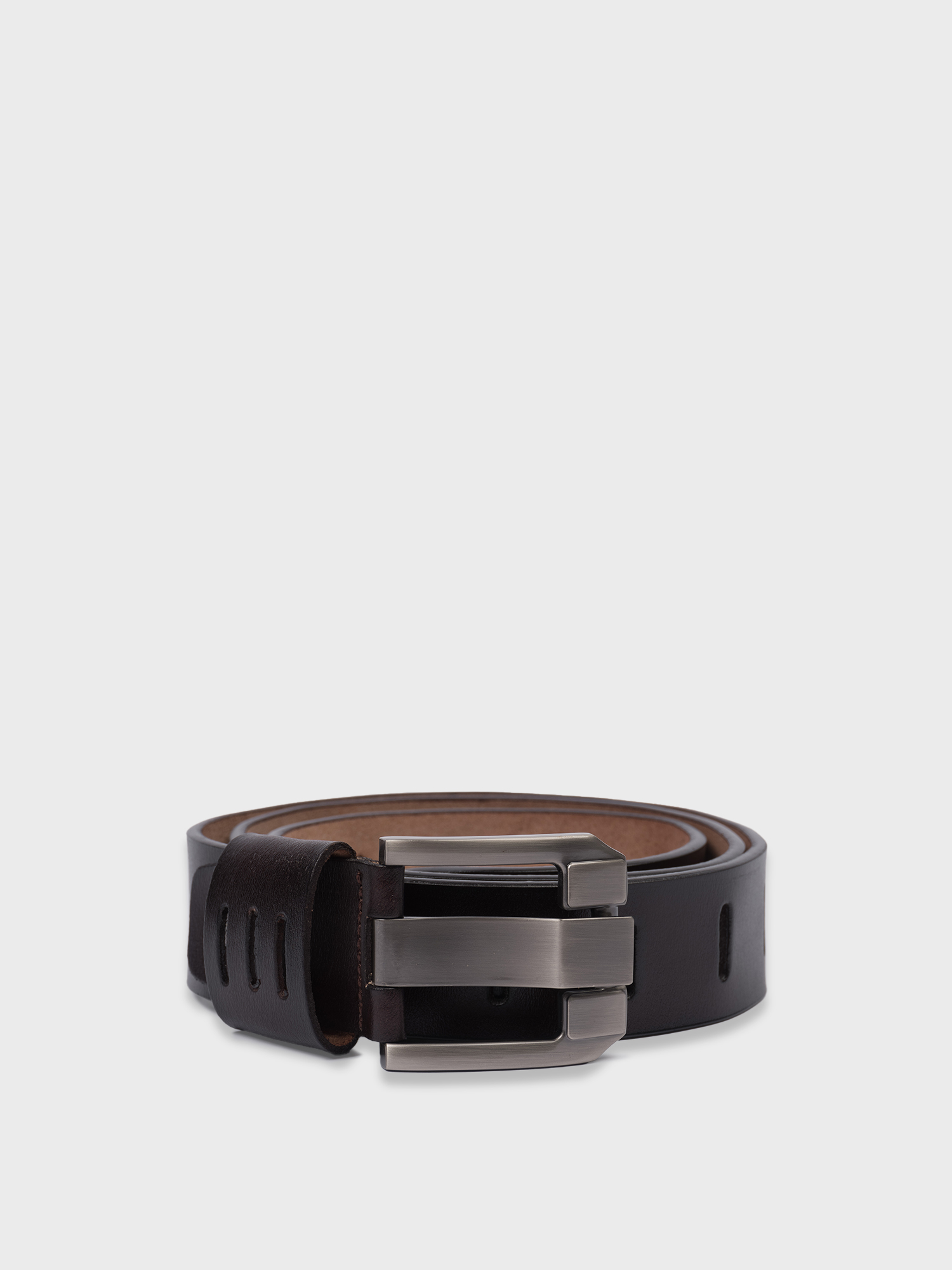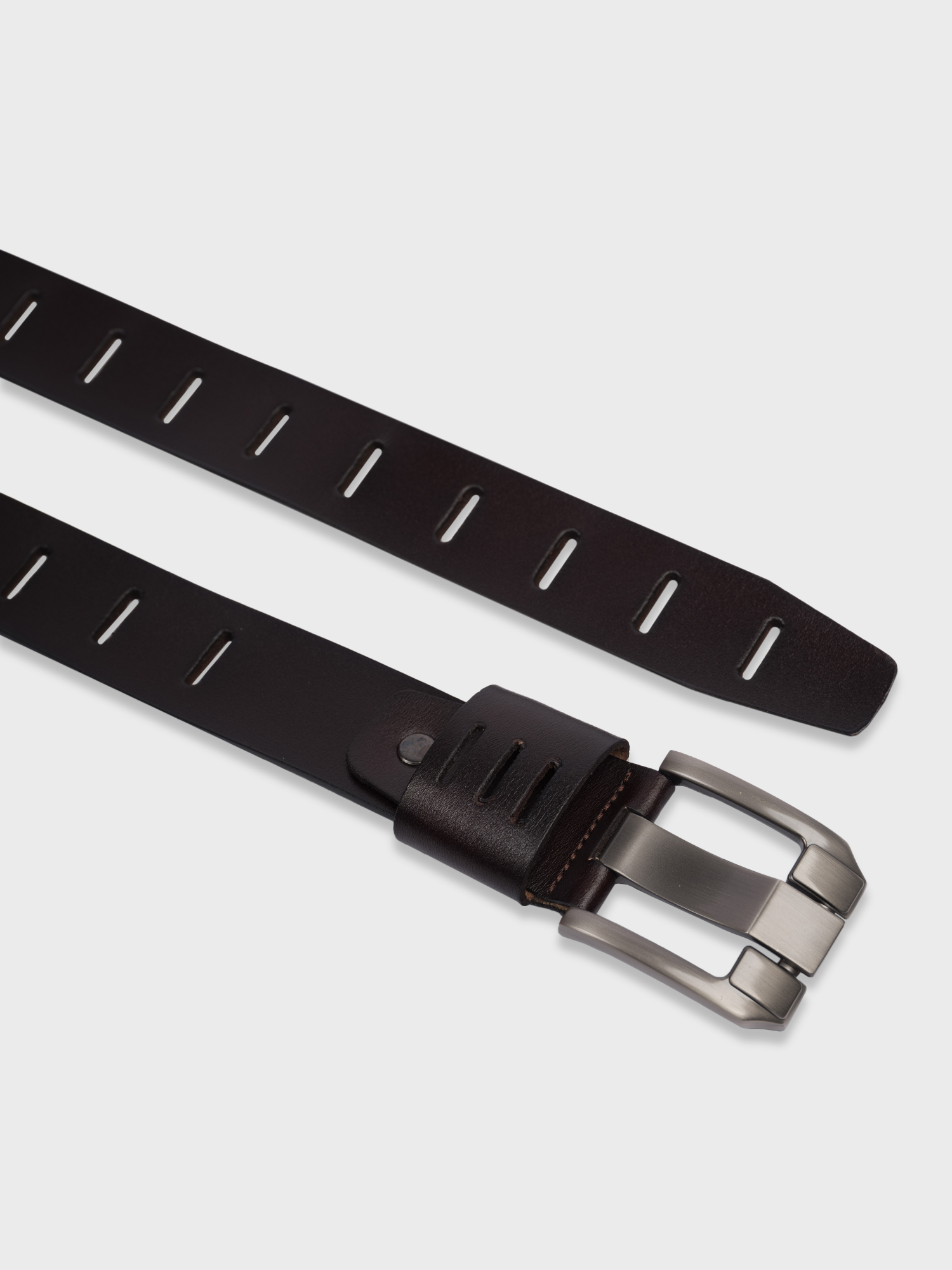 Ремень из натуральной кожи коричневого цвета, с оригинальными отверстиями в виде прорезей и акцентной серебристой пряжкой. Идеально сочетается с джинсами. Ширина 4 см