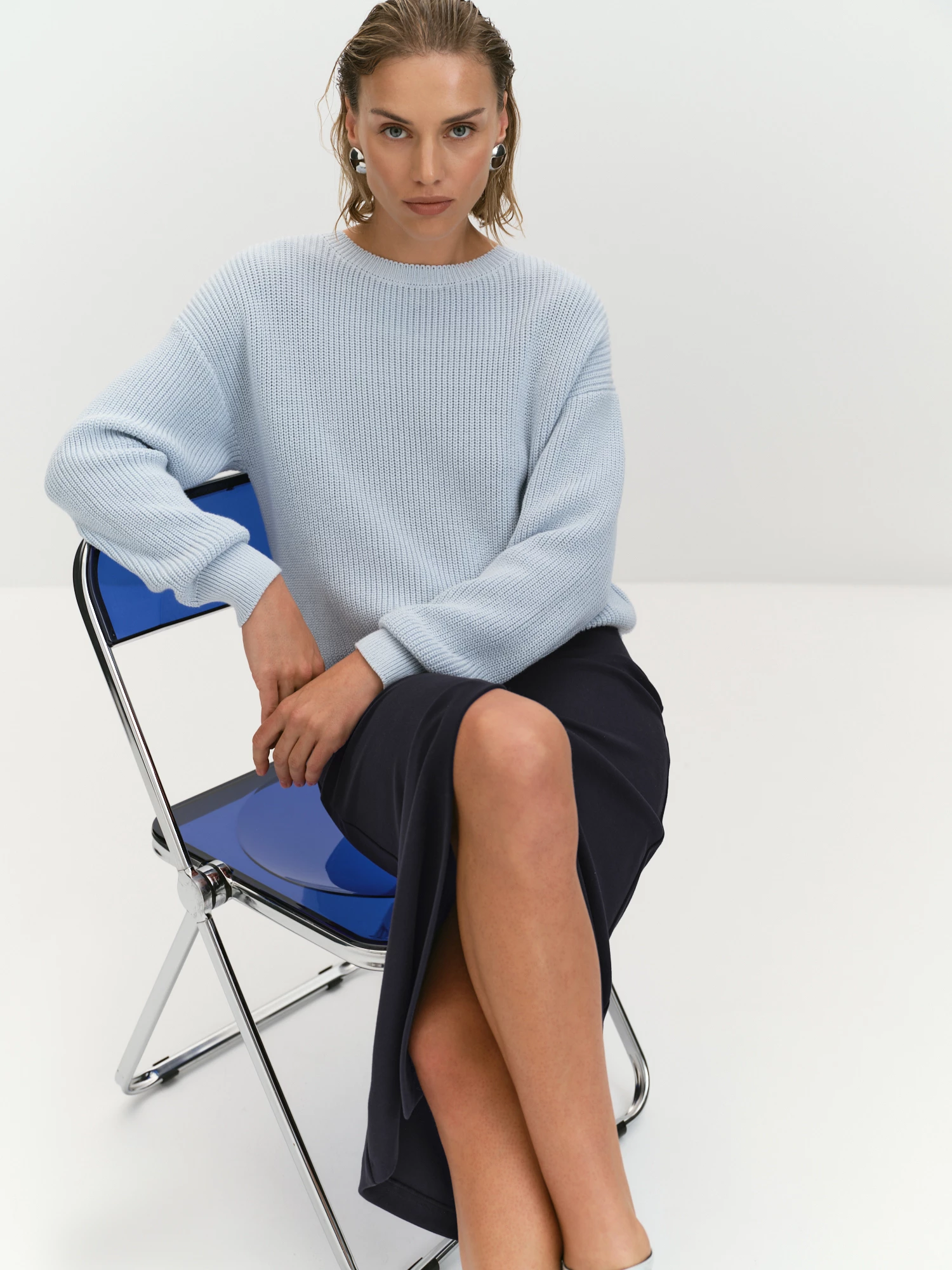 Ценное шерстяное полотно с мягким ворсом демонстрирует премиальное качество. Теплая, уютная ткань демонстрирует нюансные переливы цвета и выглядит эффектно. На нашей фабрике особенно заботятся о внешнем виде ткани пальто - при производстве используют минимум влажно-тепловой обработки и высокую долю ручного труда. Создали модель однобортной, с небольшим английским воротником. Оригинальна конструкция рукава - впереди он выполнен как втачной, а сзади как цельнокроеный. Это позволило соединить графику первого с пластичностью второго и получить деталь повышенной комфортности. Шов особой детали - подкройного бочка - служит основой бокового кармана и выполняет роль нагрудной вытачки. Все благодаря кропотливой работе на всех этапах создания продукта. Бледно-голубой цвет (Whispy Blue) благороден, аристократичен и практически универсален в сочетаниях. Наш выбор: вязаный нежно-голубой джемпер из 100% хлопка JM0189V и джинсы из особого сырого денима DJ0168.