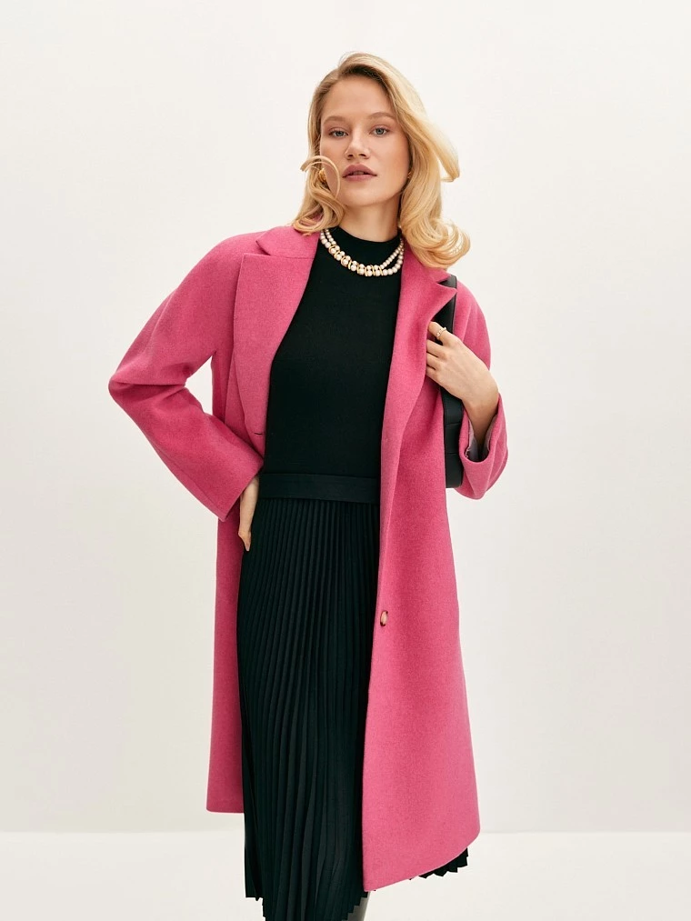 Нежное элегантное пальто в трендовом розовом оттенке добавит яркости в ваш повседневный образ. Выбранный для пошива материал хорошо сохраняет форму и отлично сидит по фигуре и согреет, благодаря мягкой и теплой овечьей шерсти в составе. Прямой силуэт скроет все недостатки и подчеркнет достоинства вашей фигуры. Данная модель может стать базовой в вашем гардеробе за счет посадки и кроя, а благодаря яркому цвету – акцентом в образе.