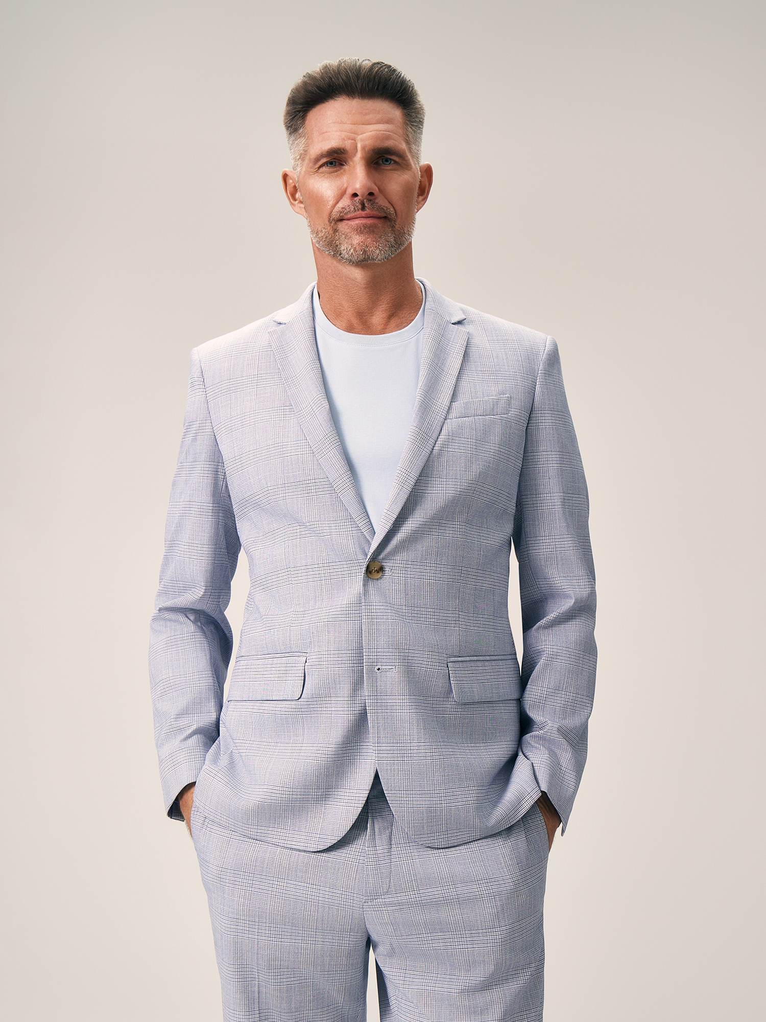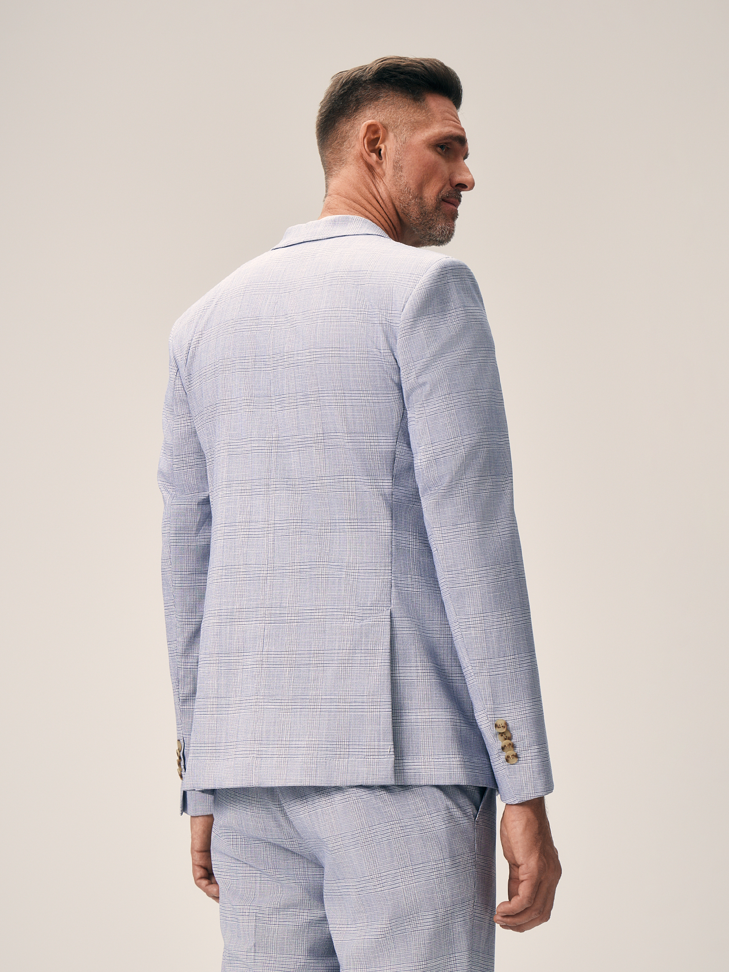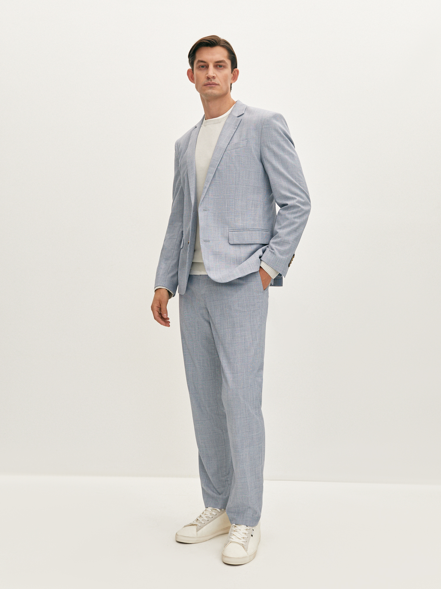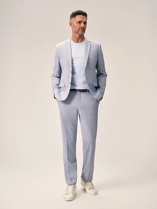 Стильный пиджак в клетку голубого оттенка полуприлегающего силуэта выполнен из смесовой ткани, в составе которой вискоза, полиэстер и эластан. Легкий, мягкий материал, который отлично пропускает воздух, слегка тянется и позволяет комфортно сесть по фигуре. Изделие на частичной подкладке, что идеально подходит для весенне-летнего периода. Модель дополнена двумя прорезными карманами с клапаном и двумя шлицами. Пиджак в клетку станет элегантным решением для вашего гардероба. Он гармонично дополнит брюки из комплекта, а также стильно завершит образ smart casual.