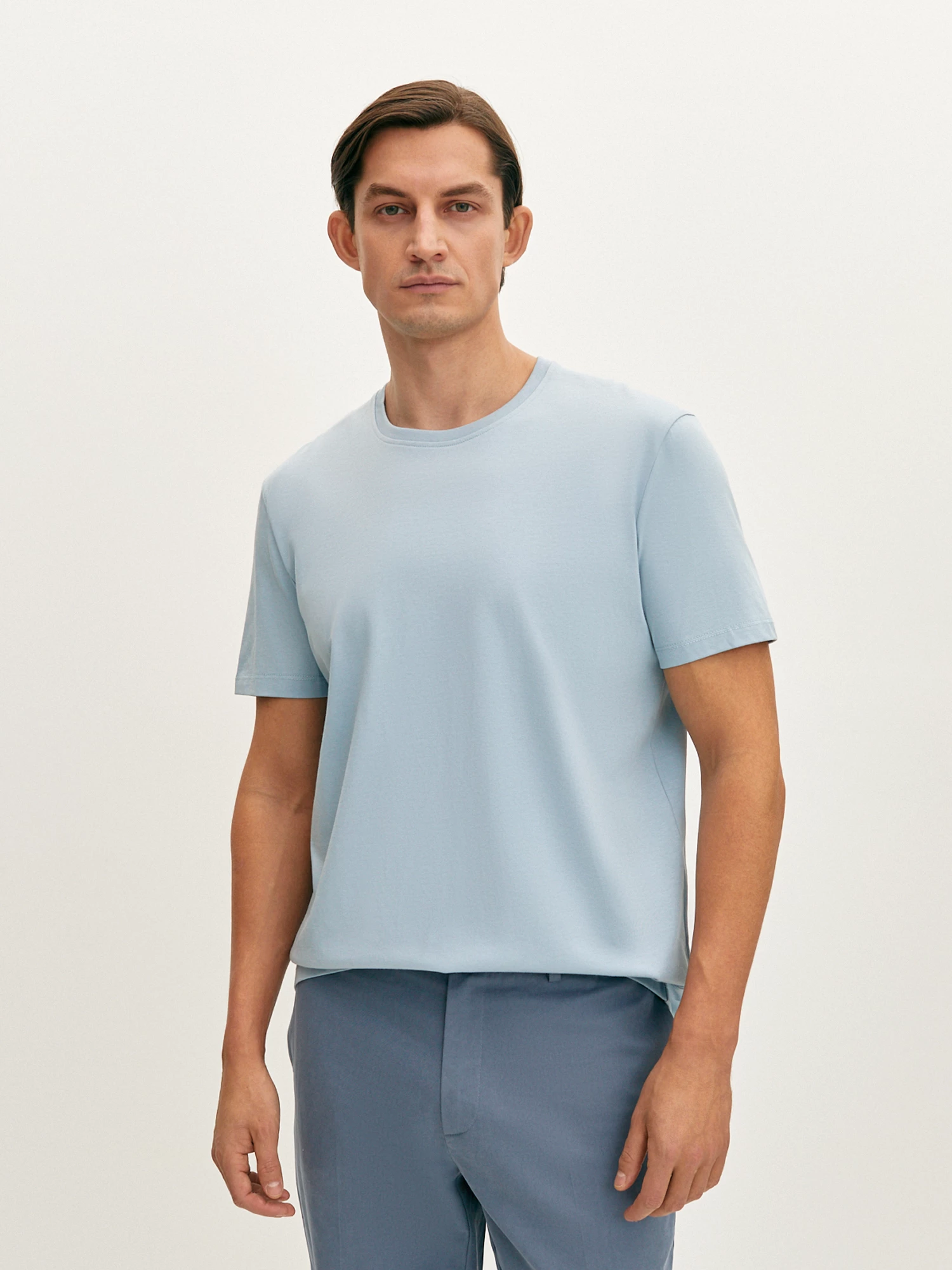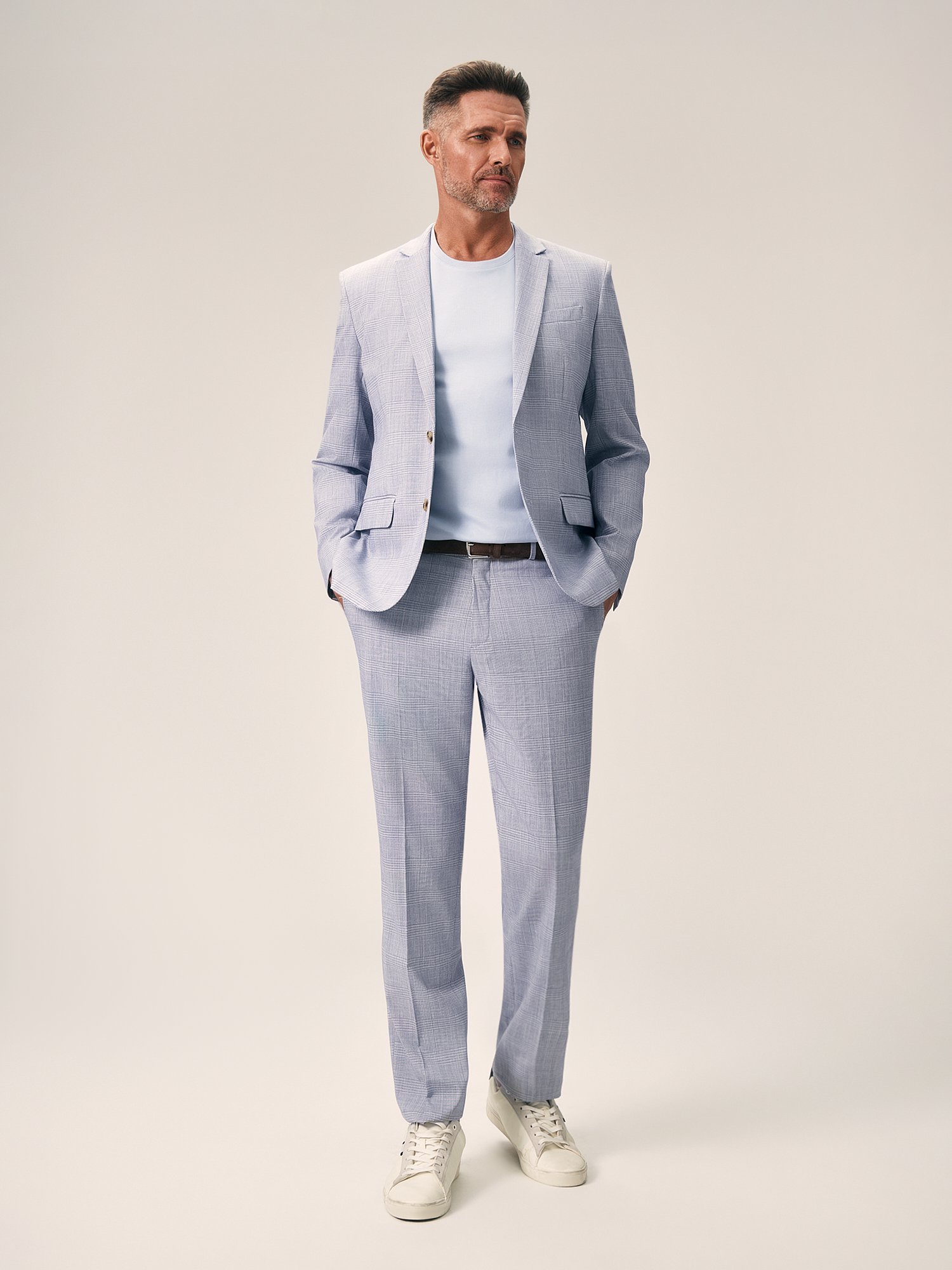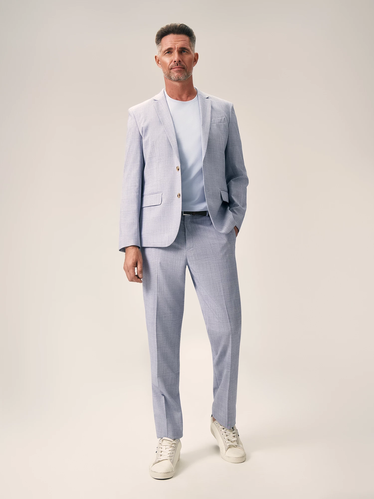 Стильный пиджак в клетку голубого оттенка полуприлегающего силуэта выполнен из смесовой ткани, в составе которой вискоза, полиэстер и эластан. Легкий, мягкий материал, который отлично пропускает воздух, слегка тянется и позволяет комфортно сесть по фигуре. Изделие на частичной подкладке, что идеально подходит для весенне-летнего периода. Модель дополнена двумя прорезными карманами с клапаном и двумя шлицами. Пиджак в клетку станет элегантным решением для вашего гардероба. Он гармонично дополнит брюки из комплекта, а также стильно завершит образ smart casual.
