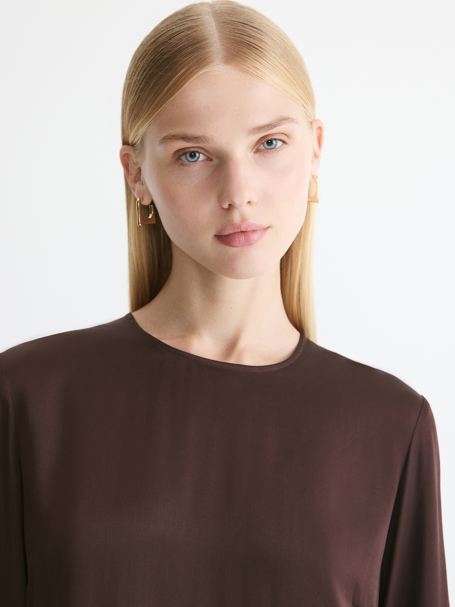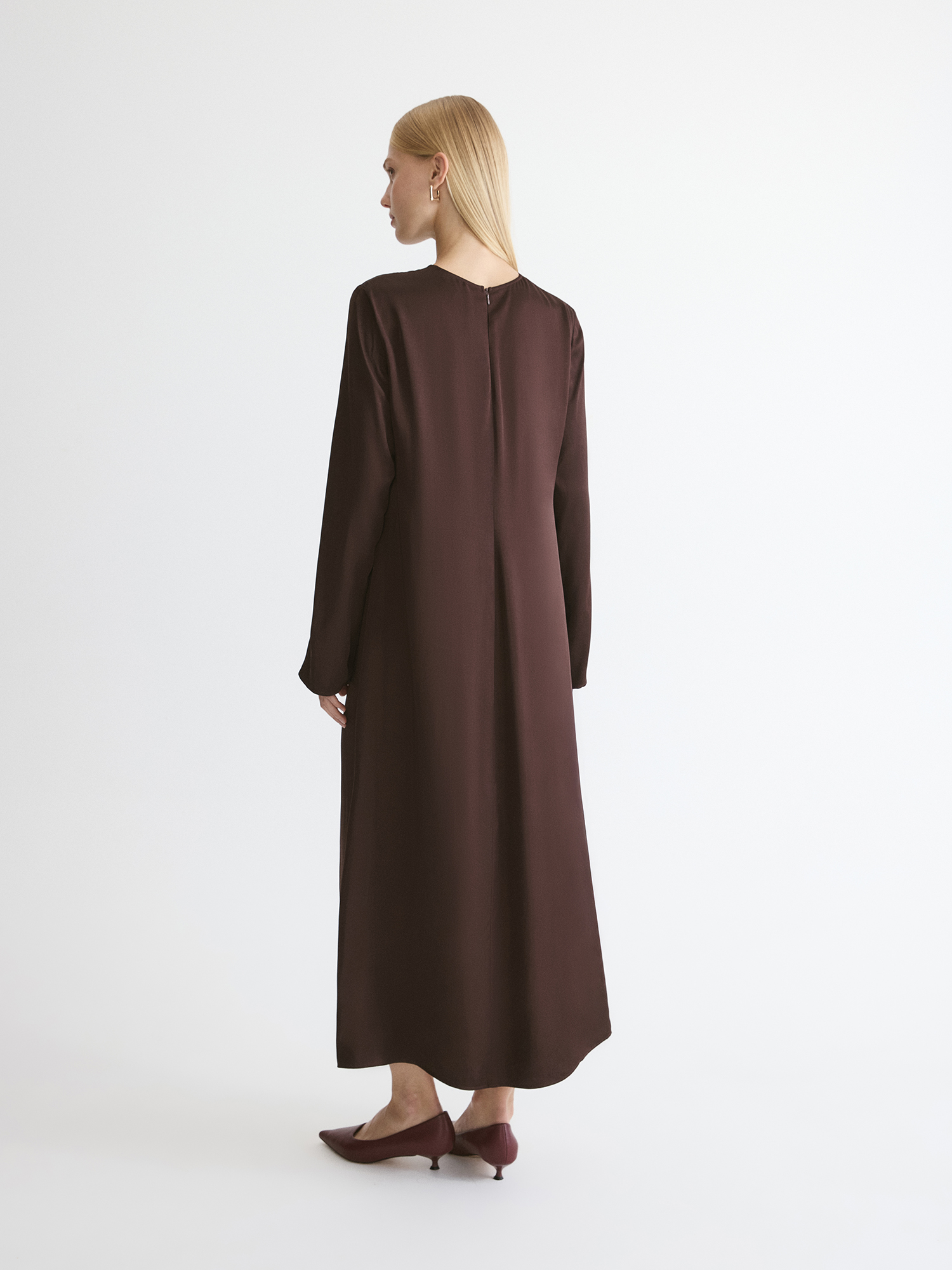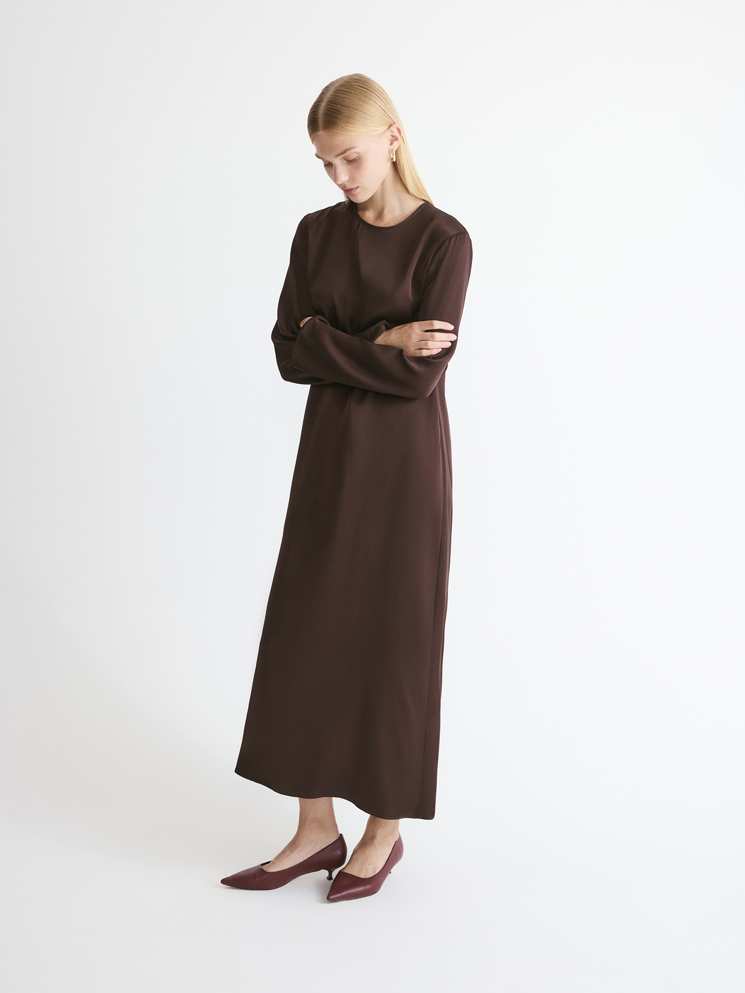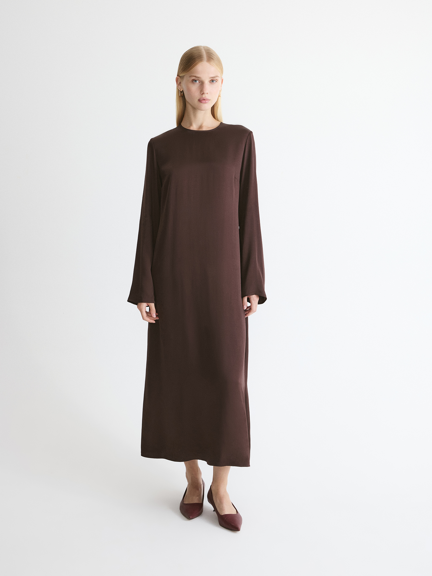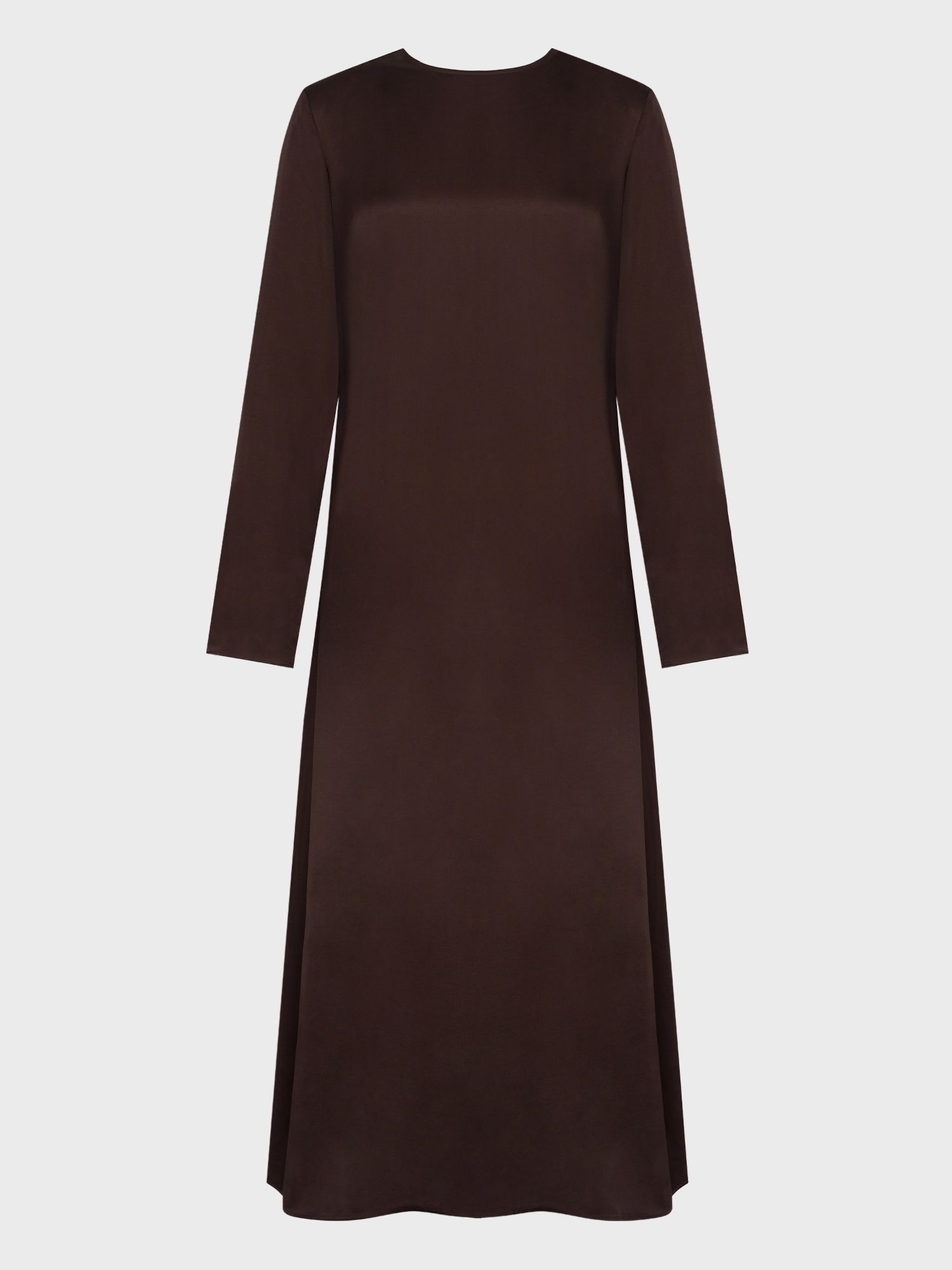 Платье прямого кроя в шоколадном оттенке - для тех, кто ценит лаконичность и комфорт. Эффектная длина, аккуратный круглый вырез, втачные рукава создают утонченный силуэт, анатомически верные нагрудные вытачки обеспечивают правильную посадку.