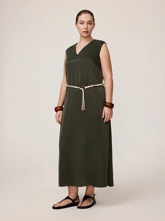 Платье лаконичного кроя, подчеркивающее достоинства фигуры. А-силуэт мягко расклешается от груди, создавая воздушный эффект, который дарует свободу и легкость. Эффектный V-вырез добавляет образу ноту чувственности, не нарушая при этом общей сдержанности стиля. Нагрудные вытачки обеспечивают идеальную посадку, а застежка на пуговицу на спинке делает процесс надевания удобным и комфортным. Ткань, тактильно напоминающая мокрый шелк, и темно-оливковый цвет с вертикальным крэш-принтом светлее основного тона, добавляют образу утонченности. Модель выполнена из ткани на основе купры с добавлением экологичной EcoVeroViscose. Купра — премиальная разновидность вискозы — дарит коже ощущение невесомой прохлады в жару и мягко обволакивает фигуру, подчеркивая ее естественные линии. EcoVero Viscose - экологичный материал, произведенный с минимальным воздействием на окружающую среду. Это позволяет заботиться об sustainability (рус. «устойчивости») и внести свой вклад в соблюдение принципов устойчивого развития и ответственного отношения к окружающей среде.
