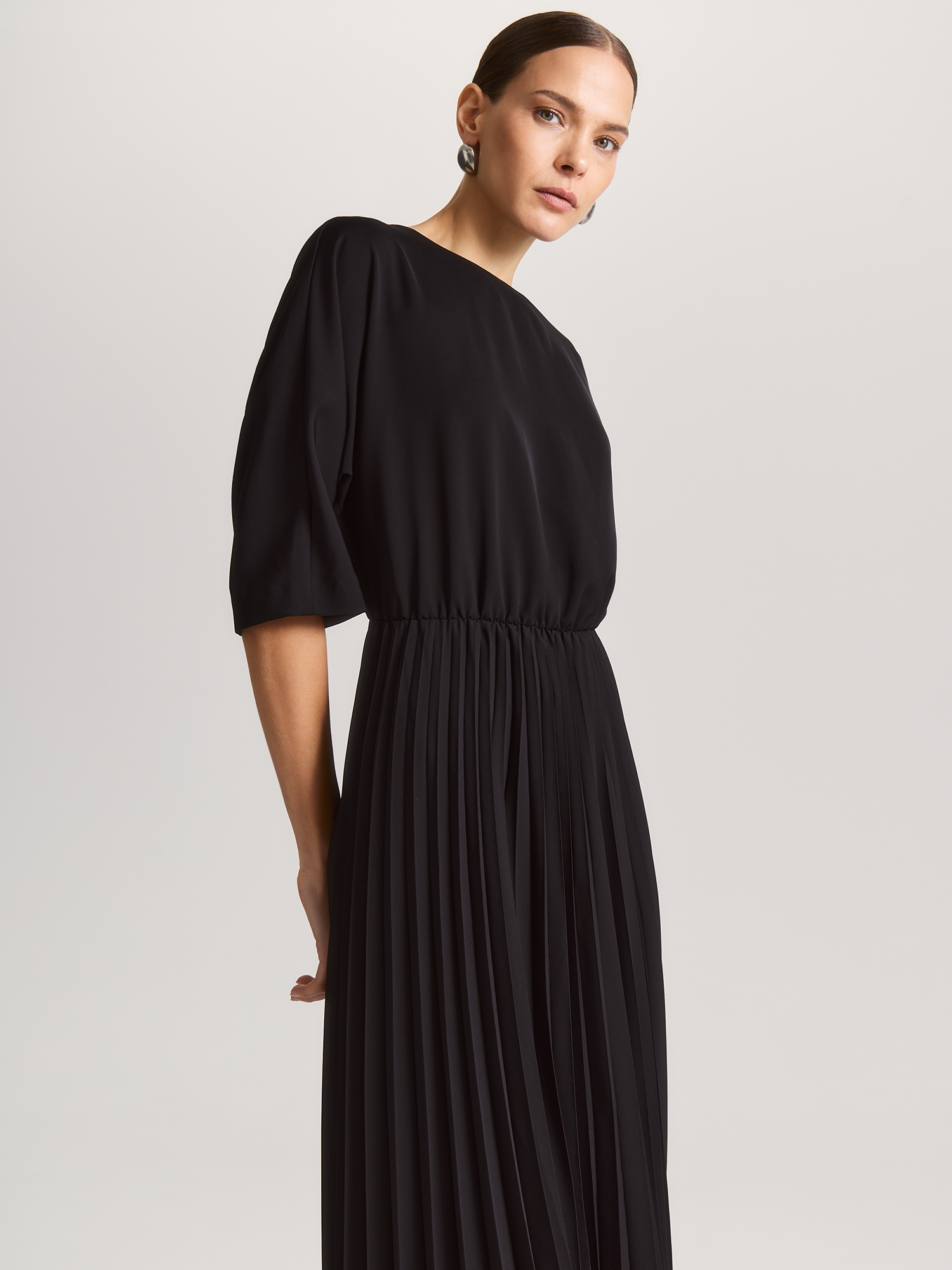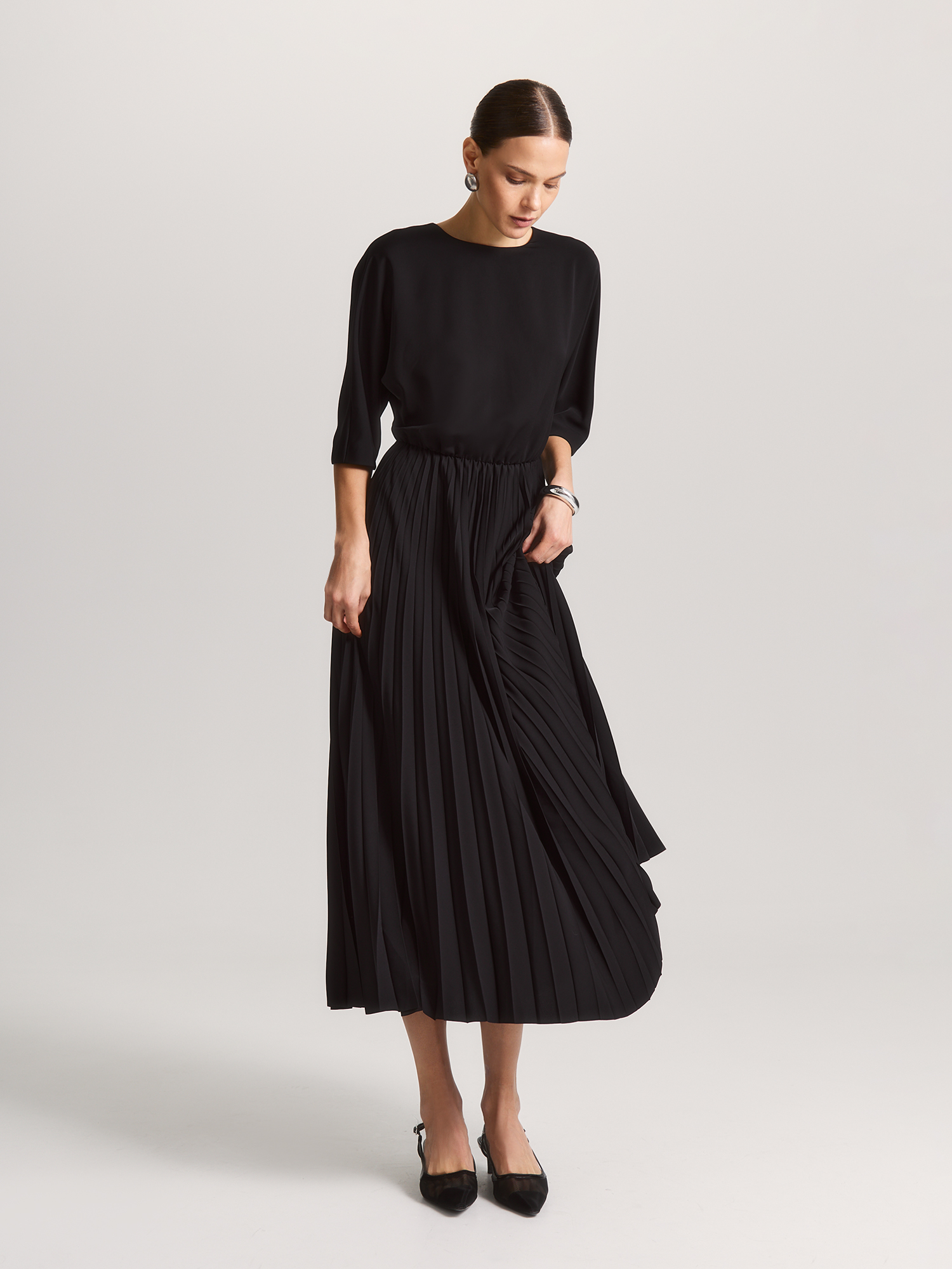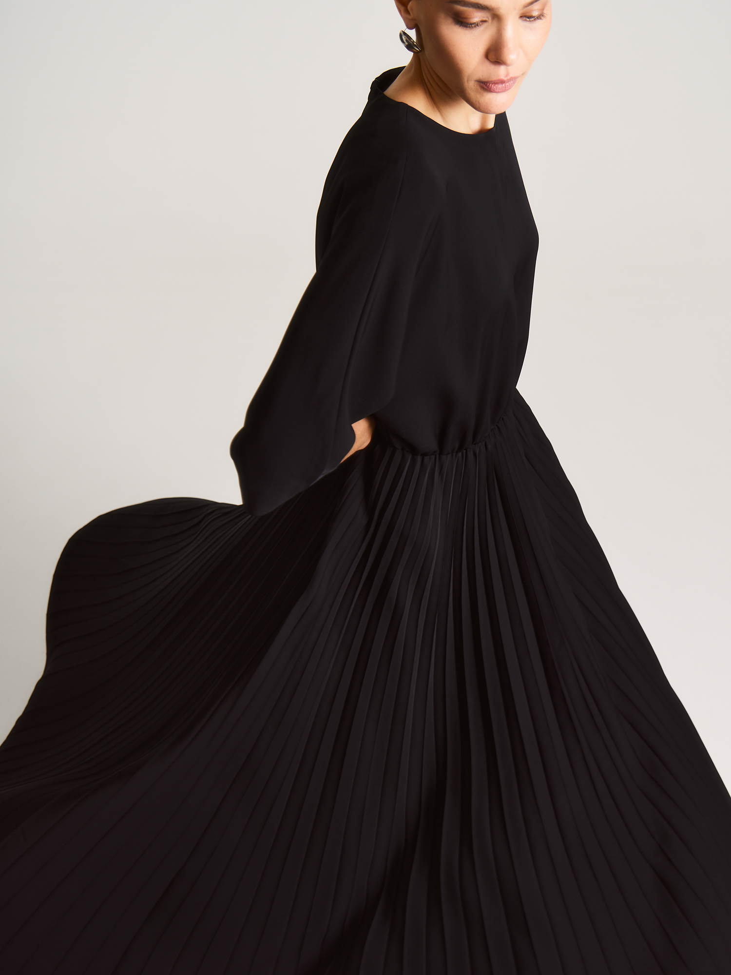 Удобный крой с акцентом на талию подчеркивает фигуру, а цельнокроеный рукав дарует свободу движений. Юбка с радиальным гофре создает романтичный объем, а круглый вырез аккуратен и не перегружает образ.
