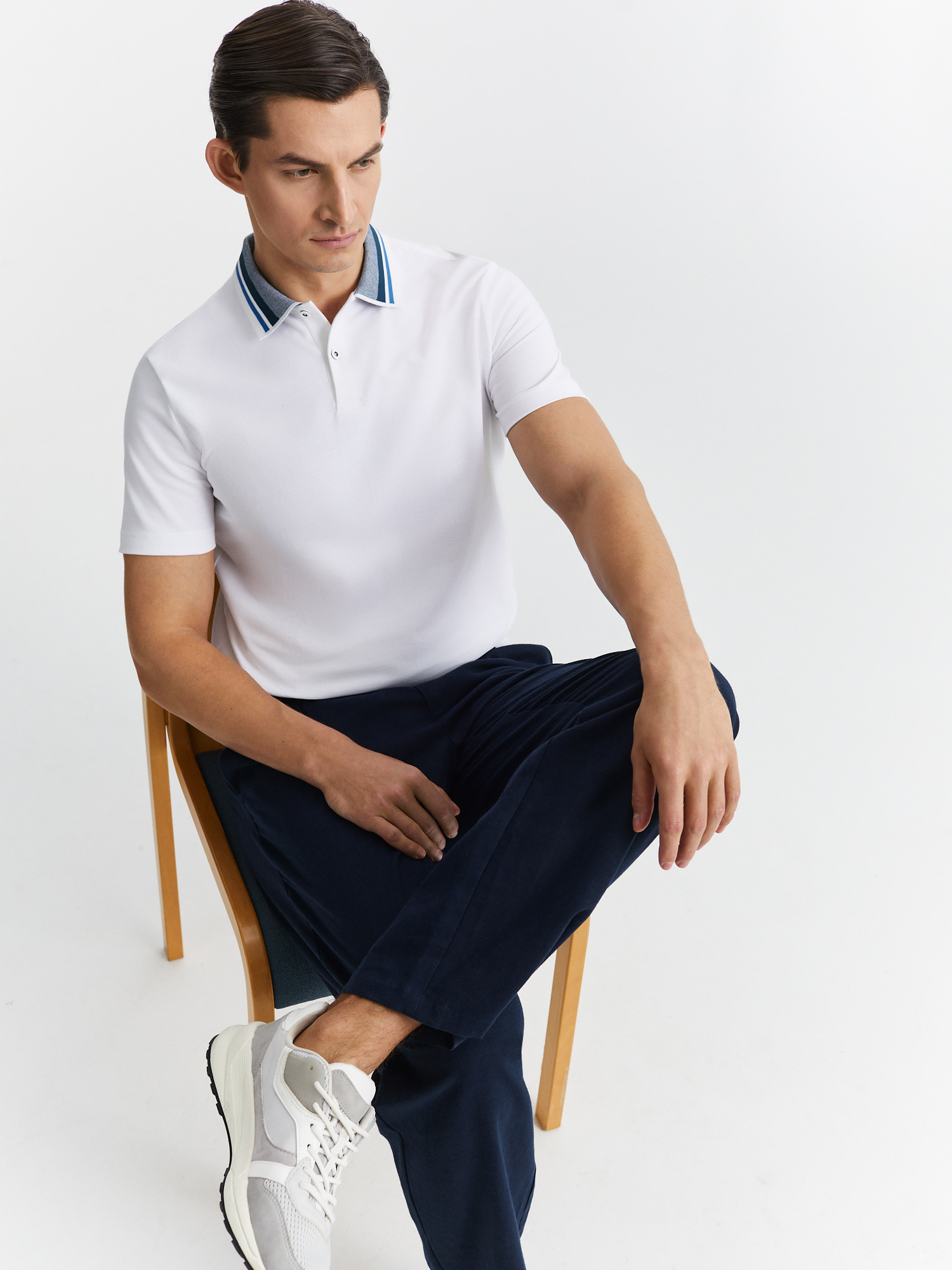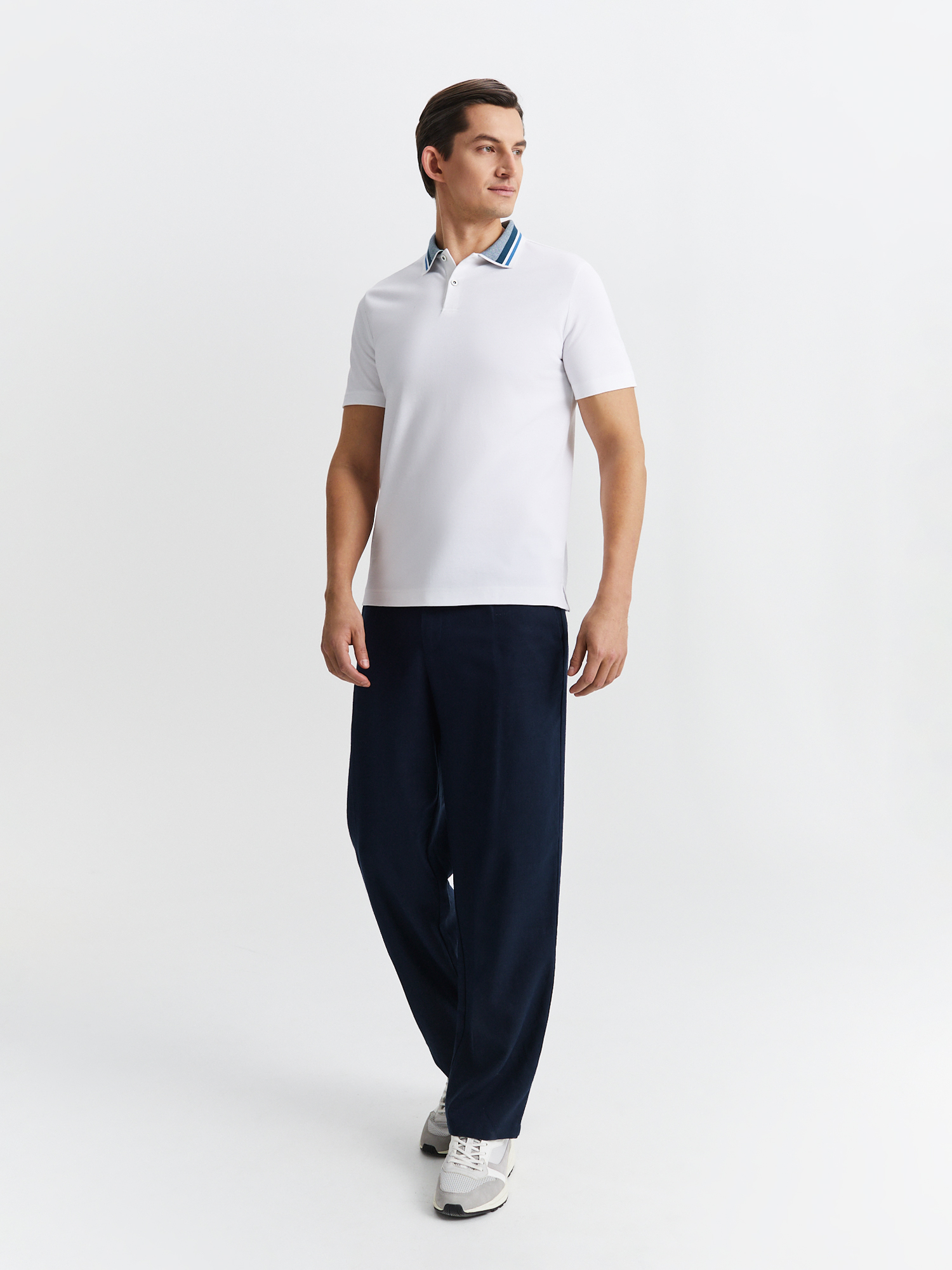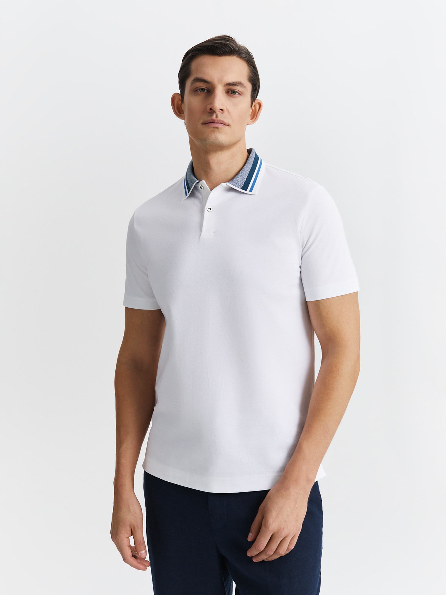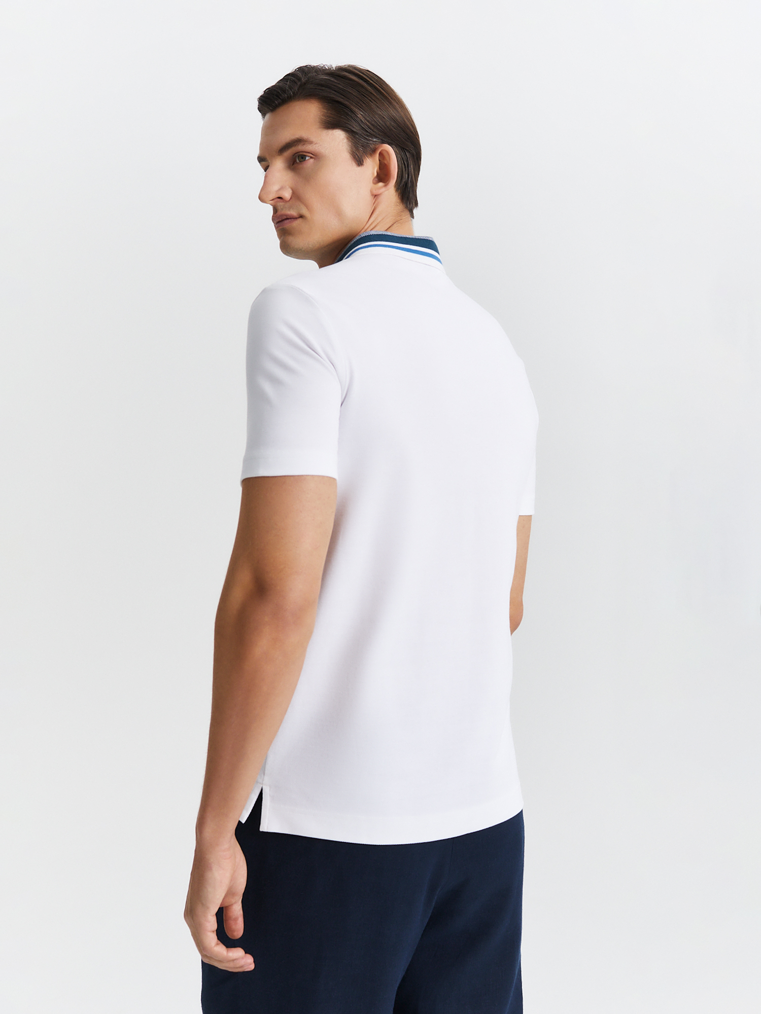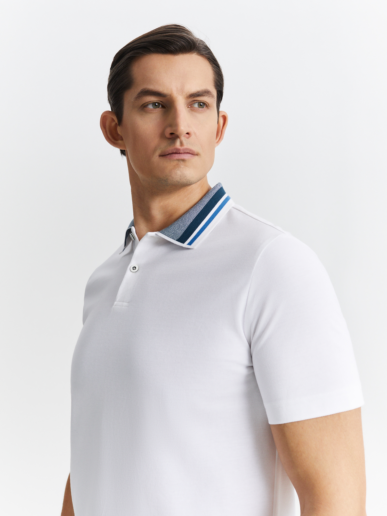 Белое поло прямого силуэта на основе дышащей ткани пике из натурального хлопка. Мягкий трикотаж не препятствует циркуляции воздуха и обеспечивает комфортную посадку на фигуре. Модель с коротким рукавом, отложным воротником и застежкой на две пуговицы дополнена контрастным воротником с декоративными полосками. Поло идеально подойдет для создания современных образов в стиле casual как для офиса, так и для активного отдыха.