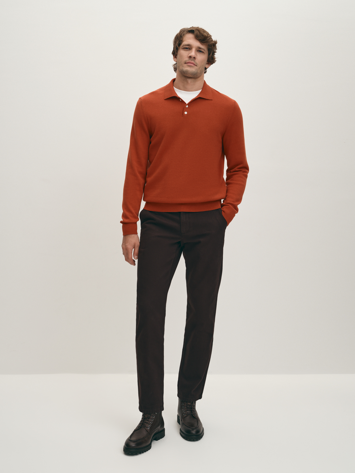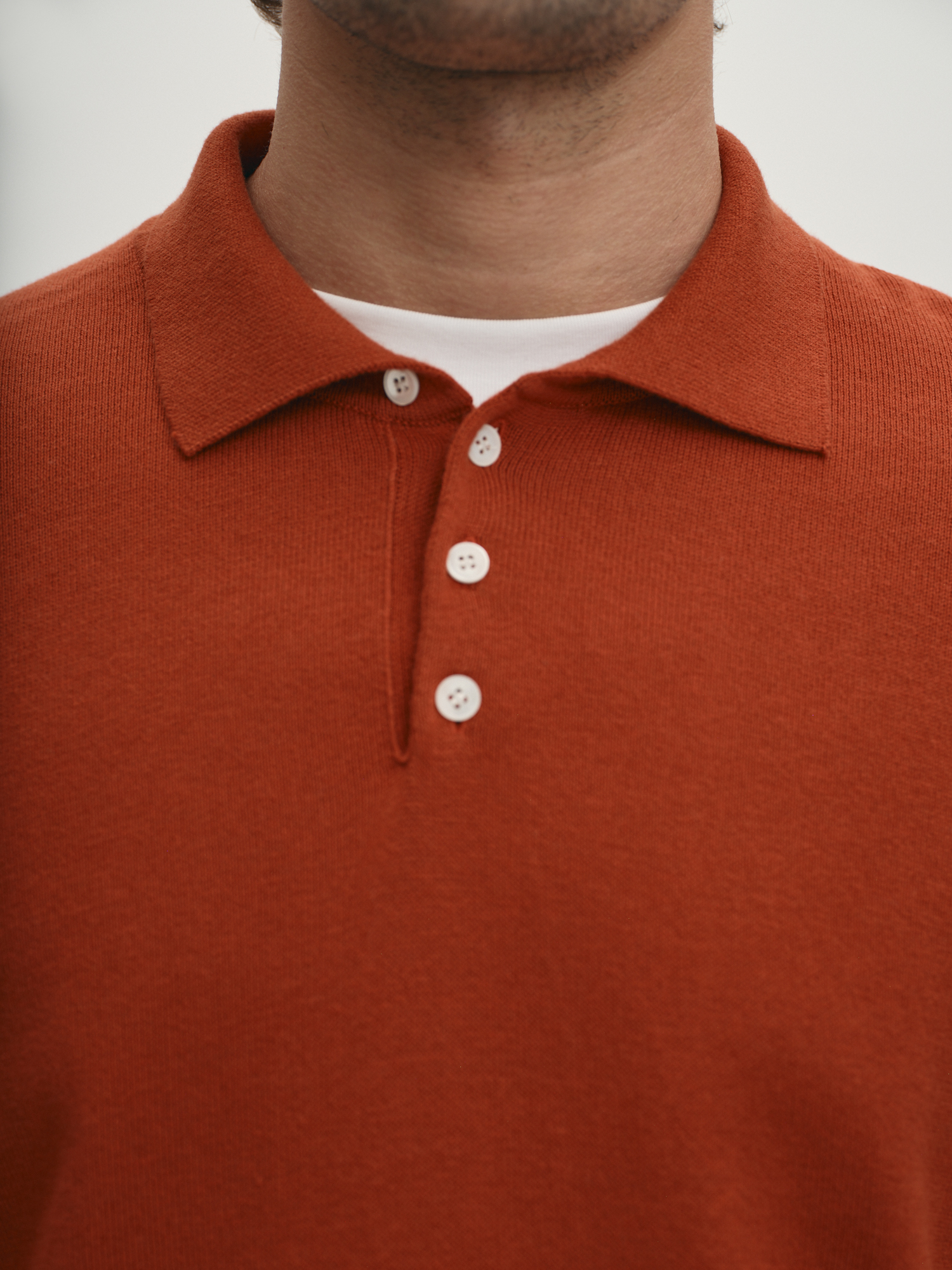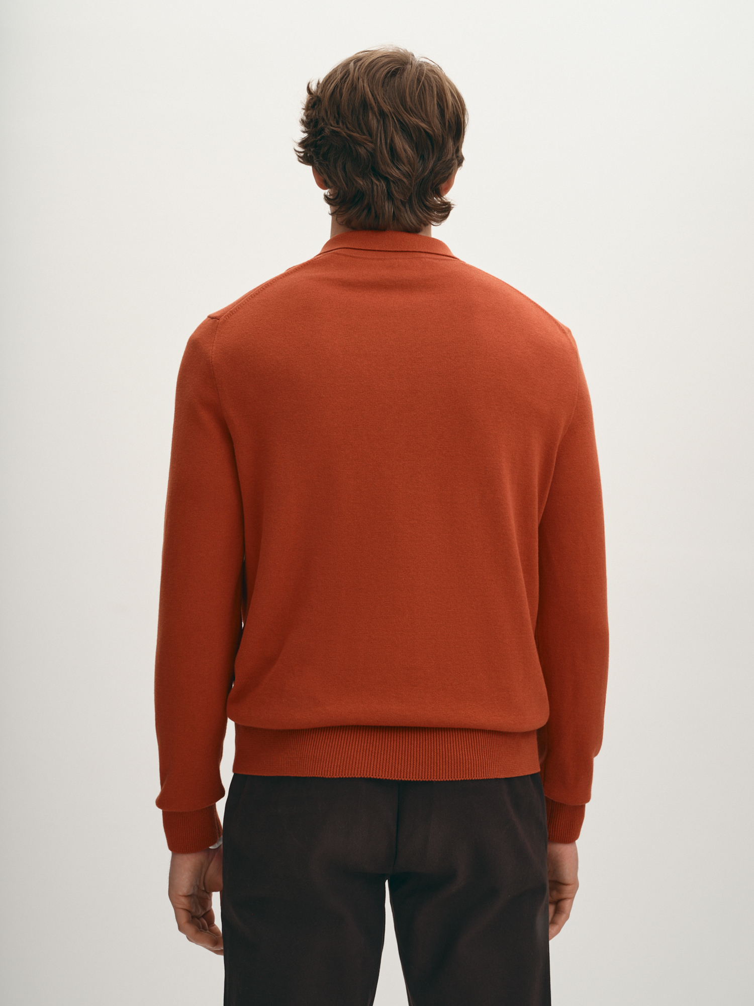Вязаное поло терракотового оттенка. Изготовлено из эластичной, износостойкой пряжи, в состав которой входит натуральный хлопок и шерсть мериноса. Модель с воротником на пуговицах и длинными рукавами выгодно подчеркивает фигуру, благодаря полуприлегающему силуэту. Поло станет удачным дополнением к образу в стиле кэжуал и хорошо сочетается с классическими брюками и джинсами.