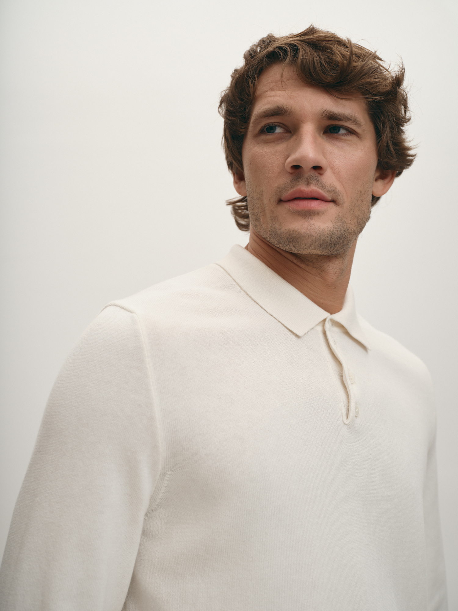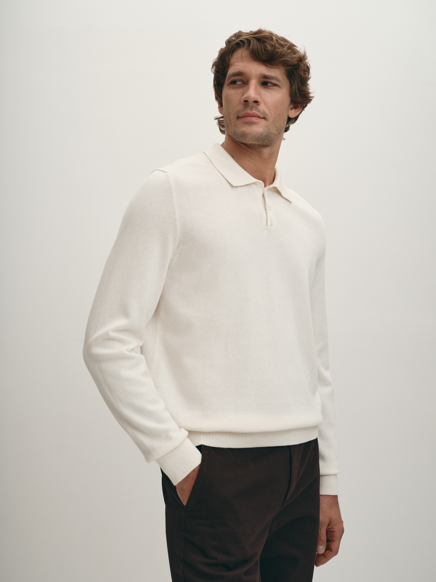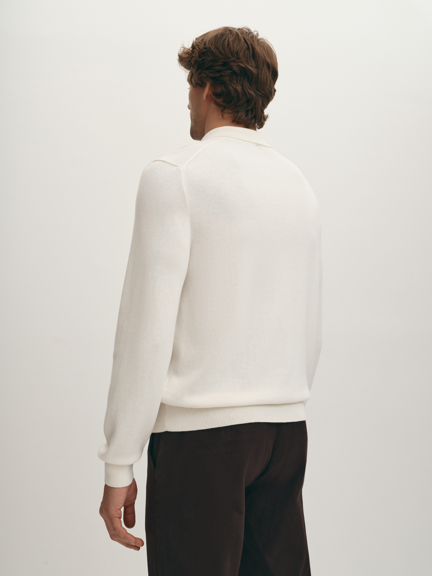 Вязанное поло молочного оттенка. Изготовлено из эластичной, износостойкой пряжи, в состав которой входит натуральный хлопок и шерсть мериноса. Модель с воротником на пуговицах и длинными рукавами выгодно подчеркивает фигуру, благодаря полуприлегающему силуэту. Поло станет удачным дополнением к образу в стиле кэжуал и хорошо сочетается с классическими брюками и джинсами.