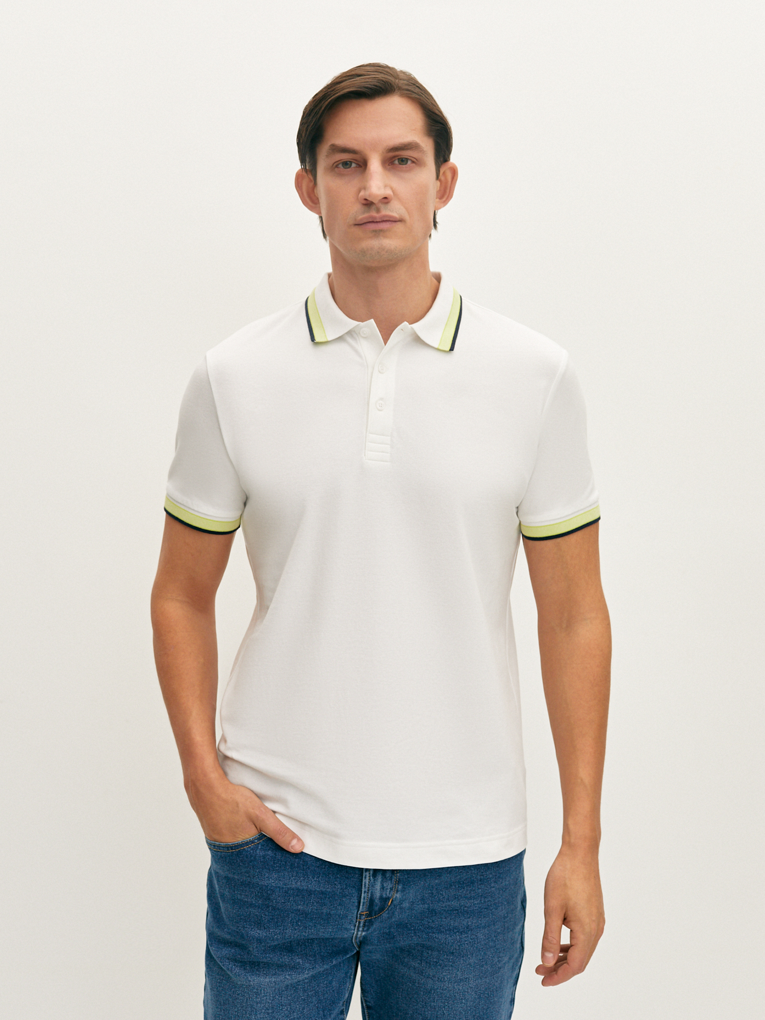 Белое поло прямого силуэта из дышащей ткани пике. Изделие изготовлено из натурального хлопка, прошедшего процесс мерсеризации, с добавлением нитей спандекса для обеспечения лучшей посадки на фигуре. Модель с коротким рукавом, отложным воротником и застежкой на три пуговицы. Украшена спортивными полосками на воротнике и манжетах. Поло идеально подойдет для любого типа фигуры и создания современных образов в стиле casual.