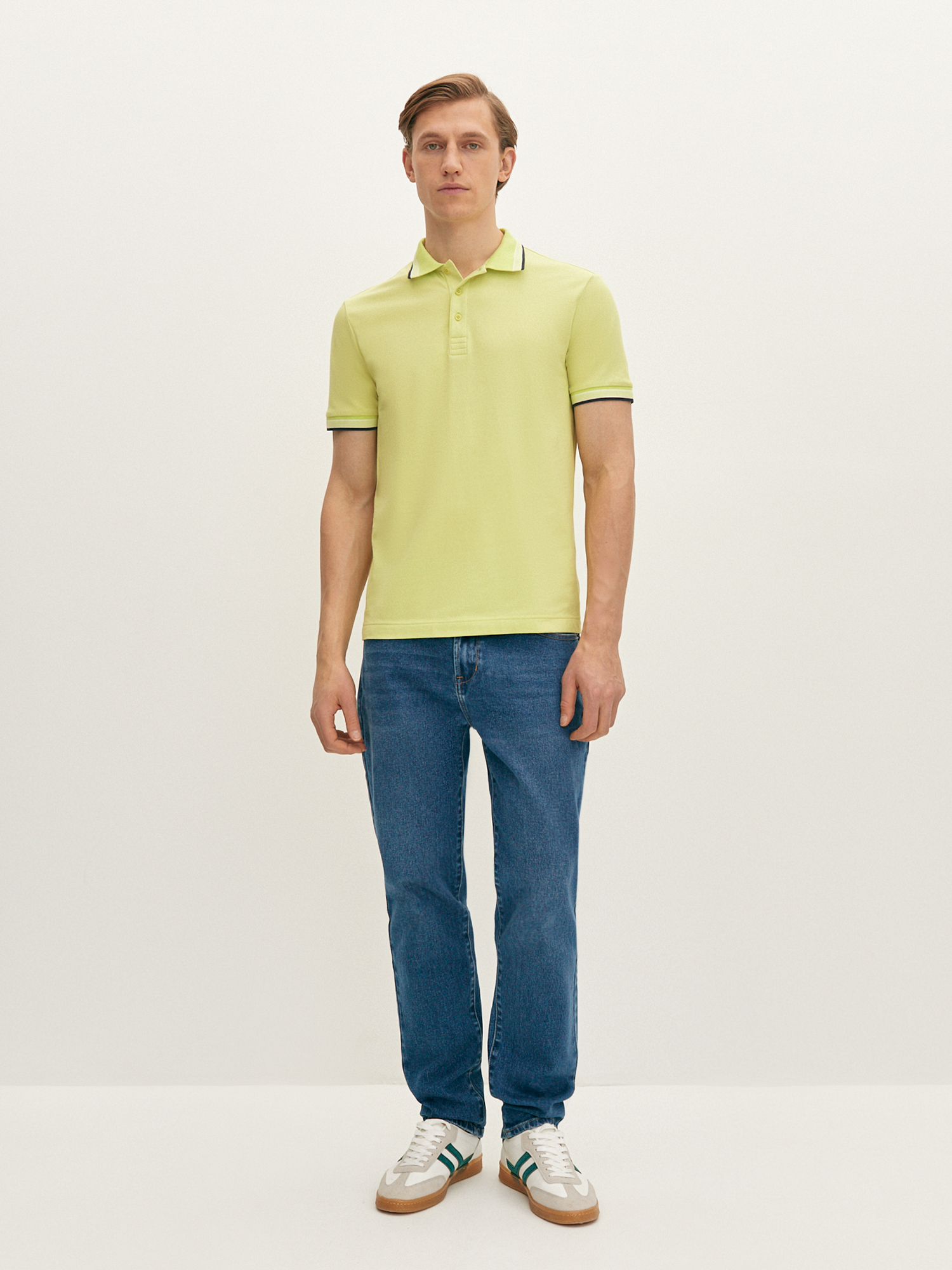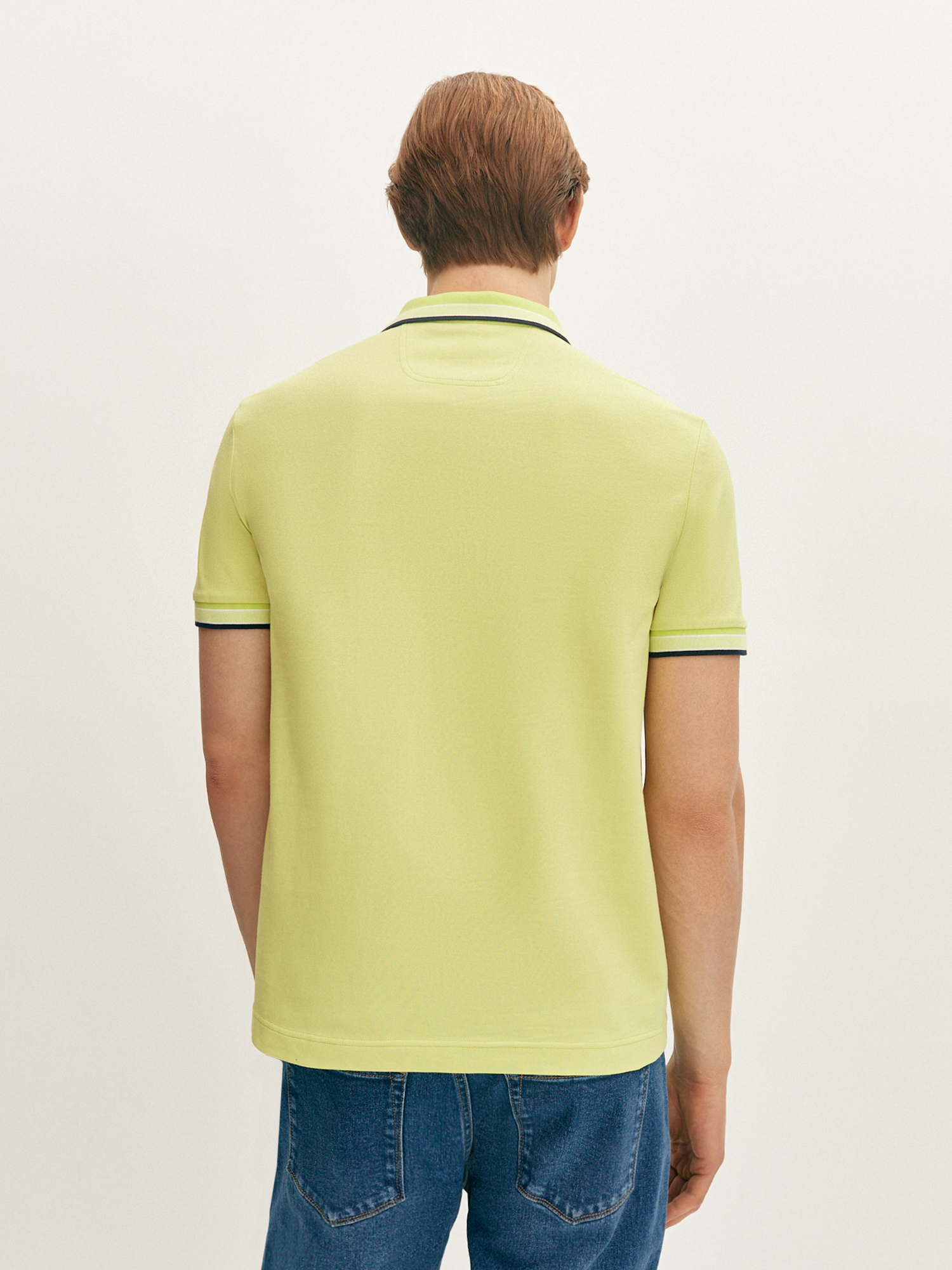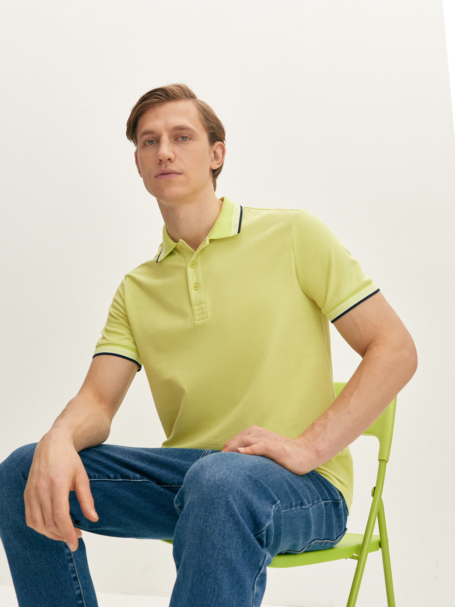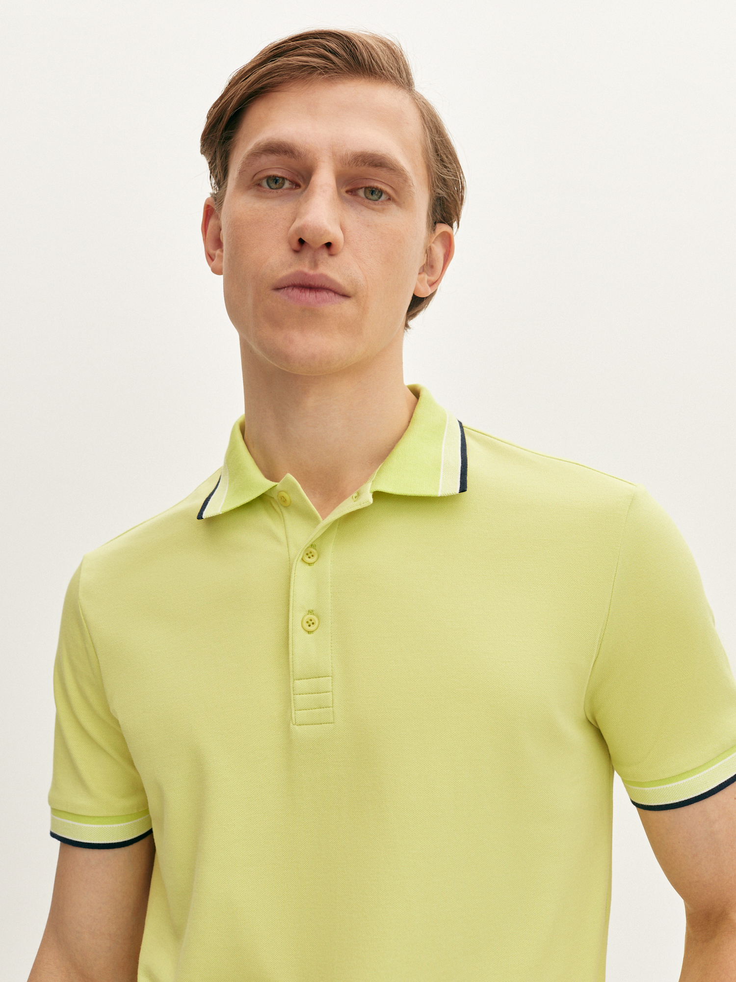 Поло в актуальном салатовом оттенке прямого силуэта из дышащей ткани пике. Изделие изготовлено из натурального хлопка, прошедшего процесс мерсеризации, с добавлением нитей спандекса для обеспечения лучшей посадки на фигуре. Модель с коротким рукавом, отложным воротником и застежкой на три пуговицы. Украшена спортивными полосками на воротнике и манжетах. Поло идеально подойдет для любого типа фигуры и создания современных образов в стиле casual.