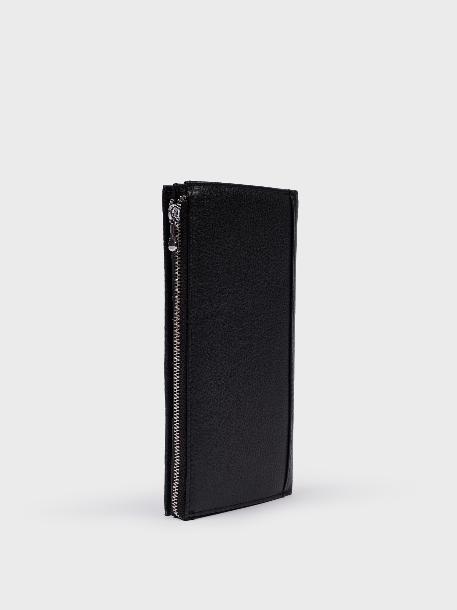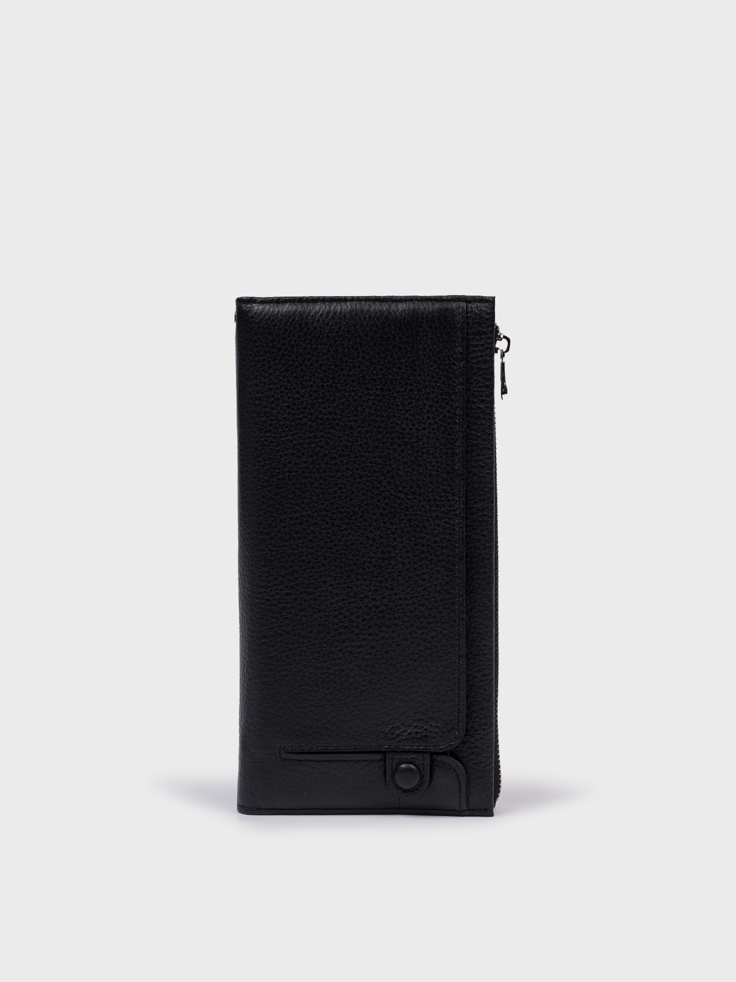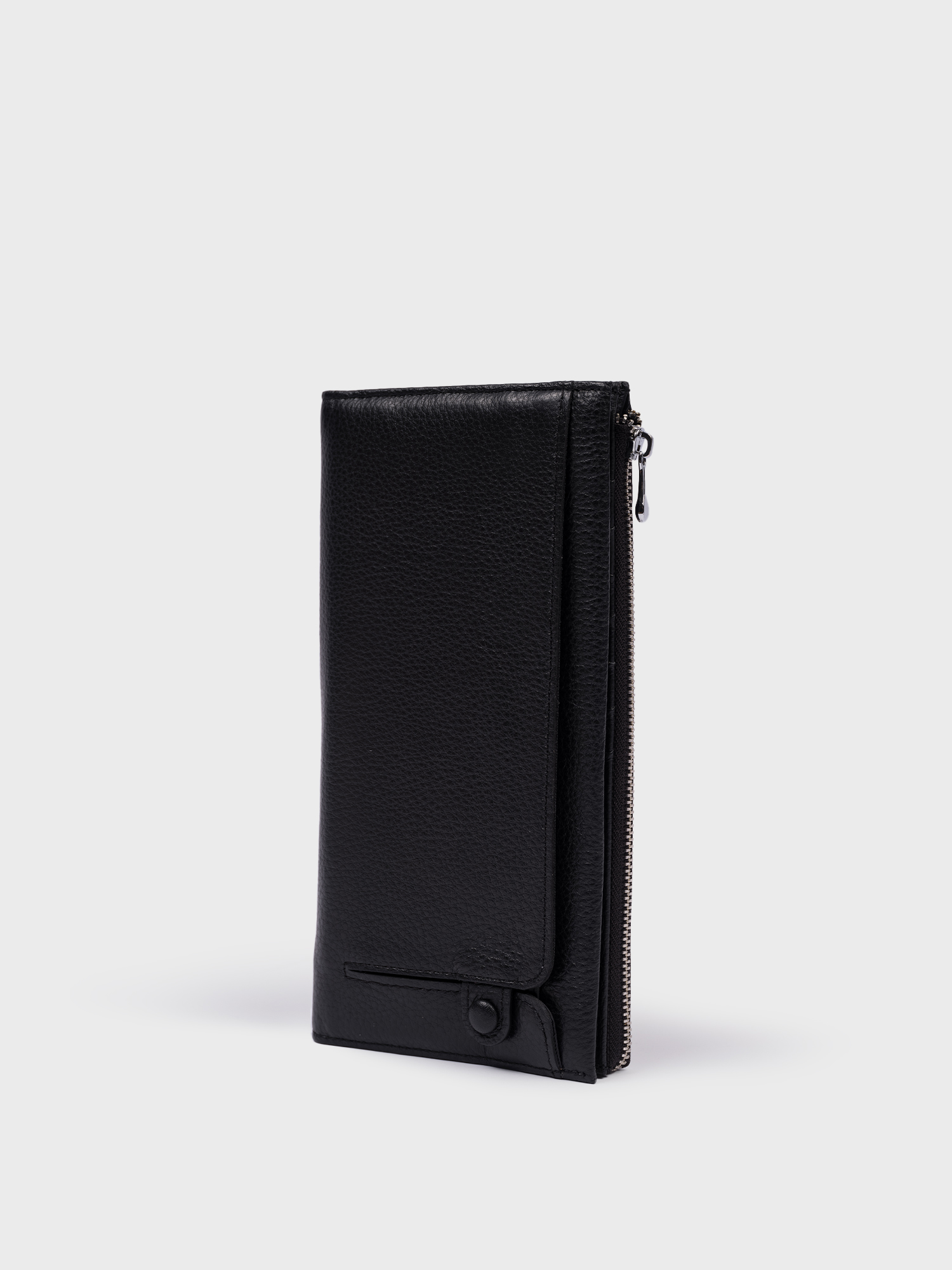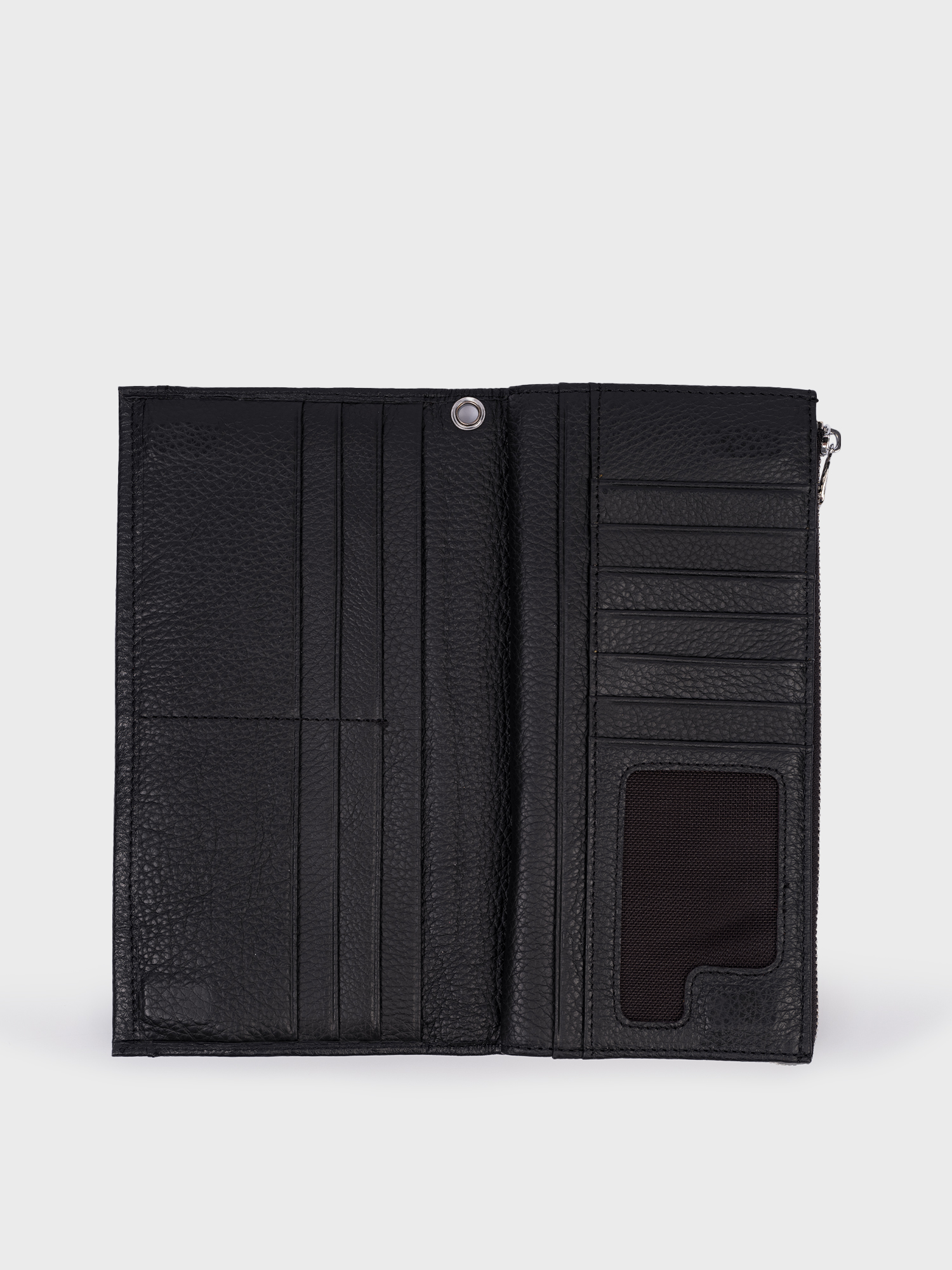 Портмоне удлиненное из натуральной мягкой кожи с двумя отделениями. Внутри аксессуара, застегивающегося на молнию с крупным пуллером, есть отделения для купюр, монет и кредитных карт. Размер аксессуара 20,5*2*10 см