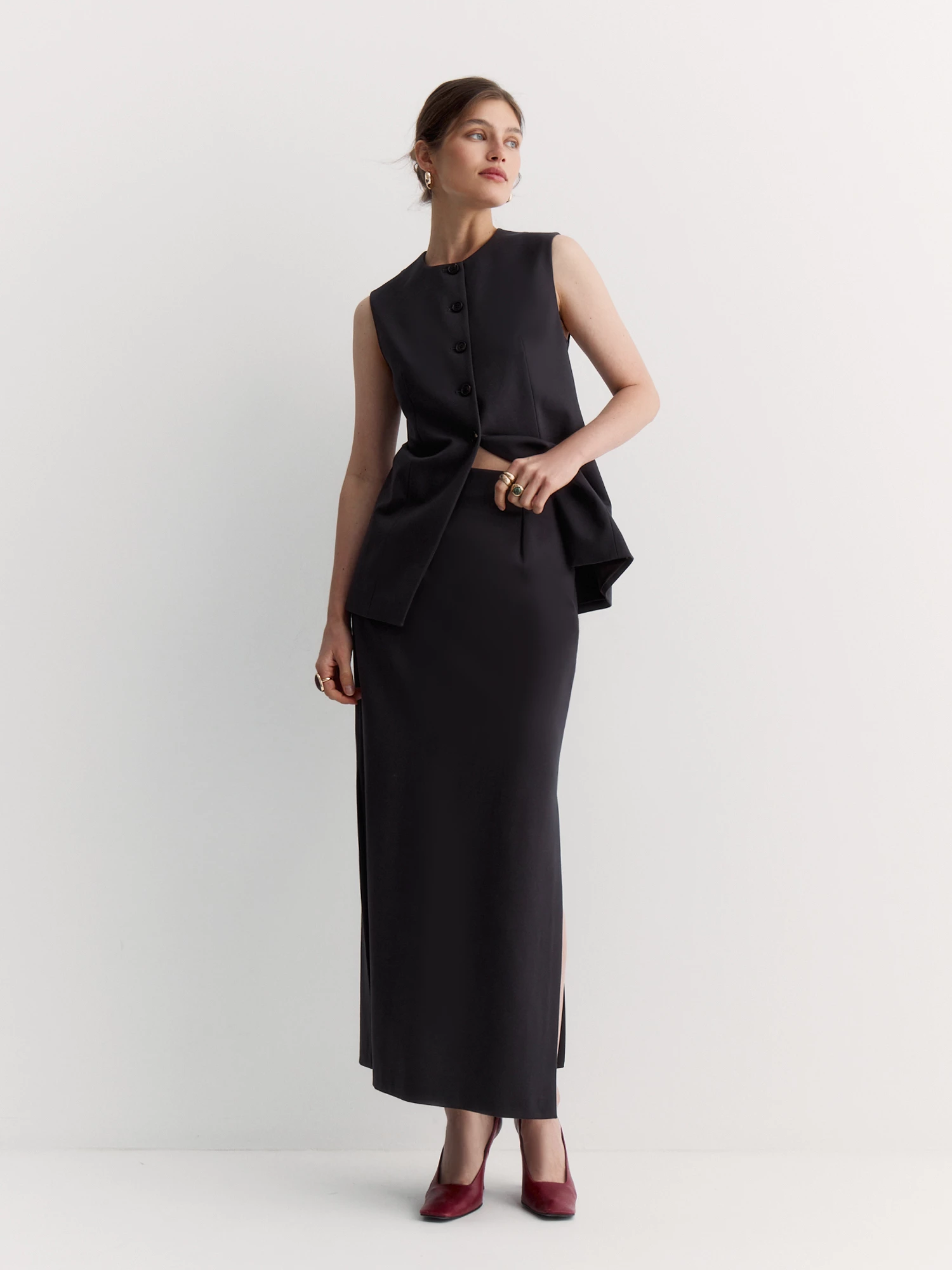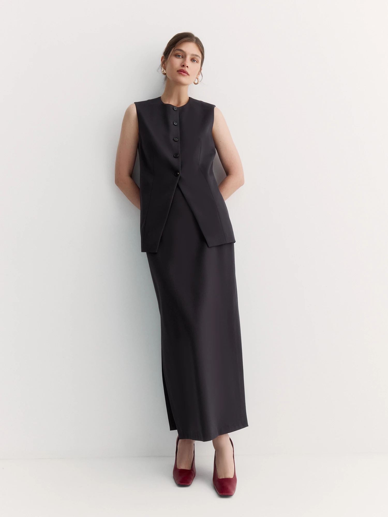Носите юбку с футболкой для образов smart casual или с рубашкой для делового стиля. Для строгого образа - жилет закрытого типа VS0048K.