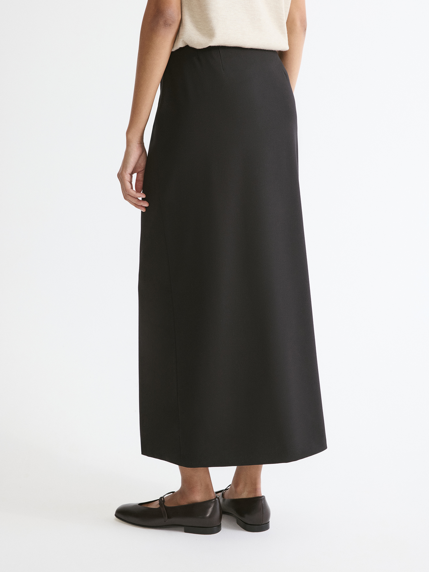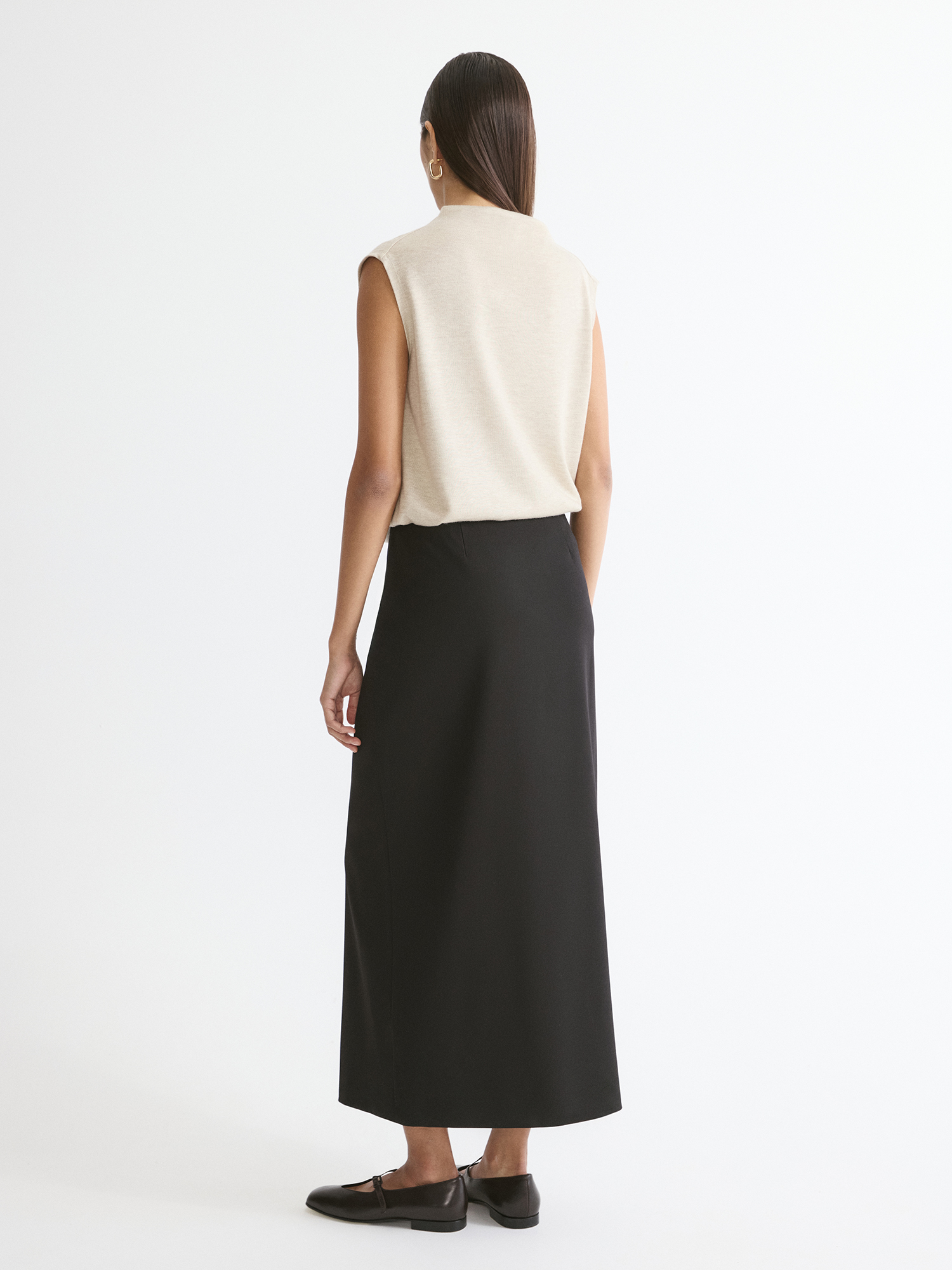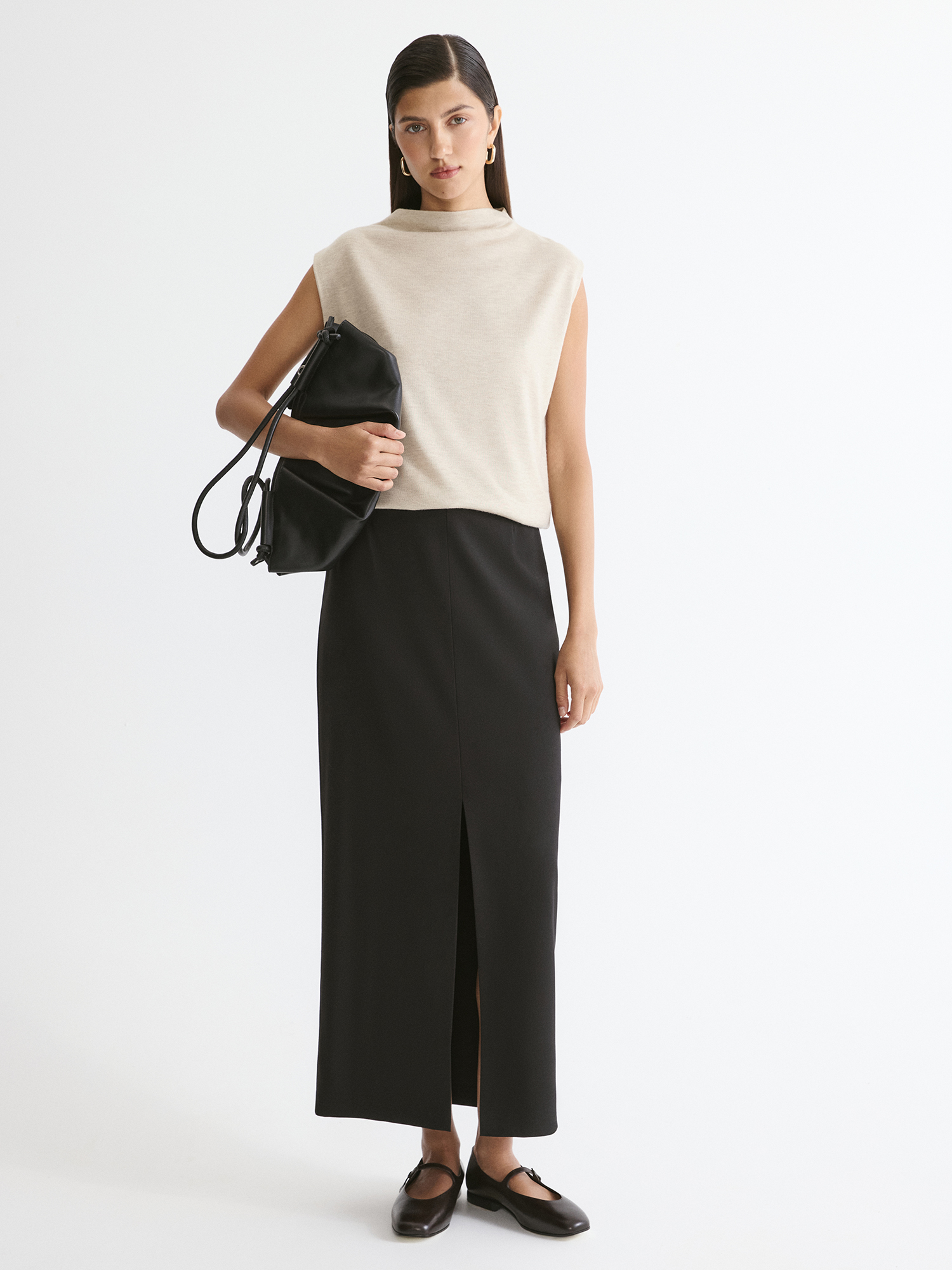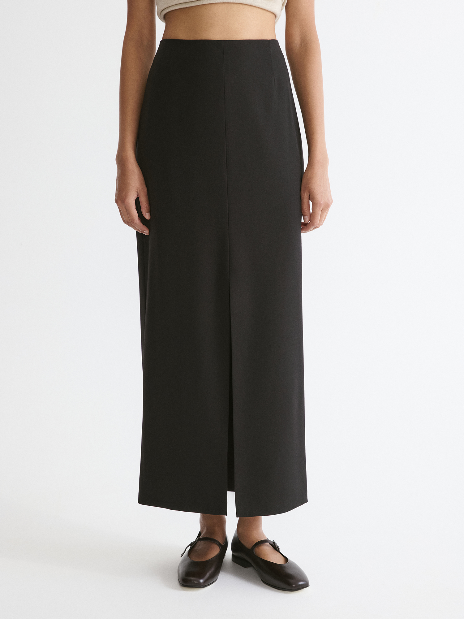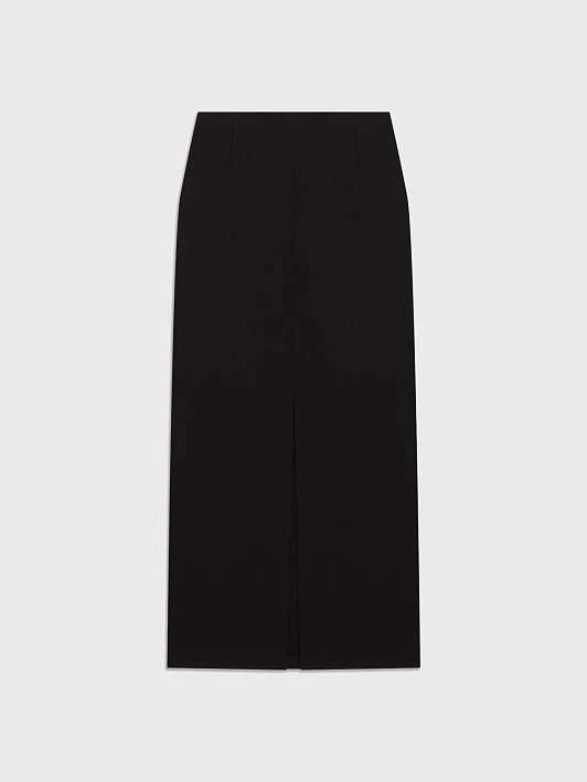 Черная юбка с эффектным разрезом - удобная модель для повседневных и вечерних выходов. Минималистичный силуэт и длина миди делают ее идеальным компаньоном для верха в любом стиле.