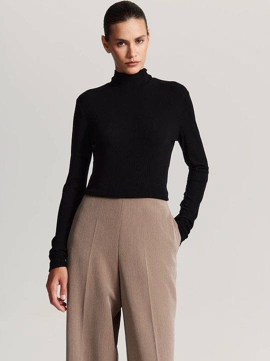 Брюки из прочной поливискозной ткани удобно сидят и практически не мнутся. Высокая талия с вытачками и без притачного пояса подчеркивает достоинства фигуры, а потайная молния сбоку обеспечивает комфортную посадку по бедрам.