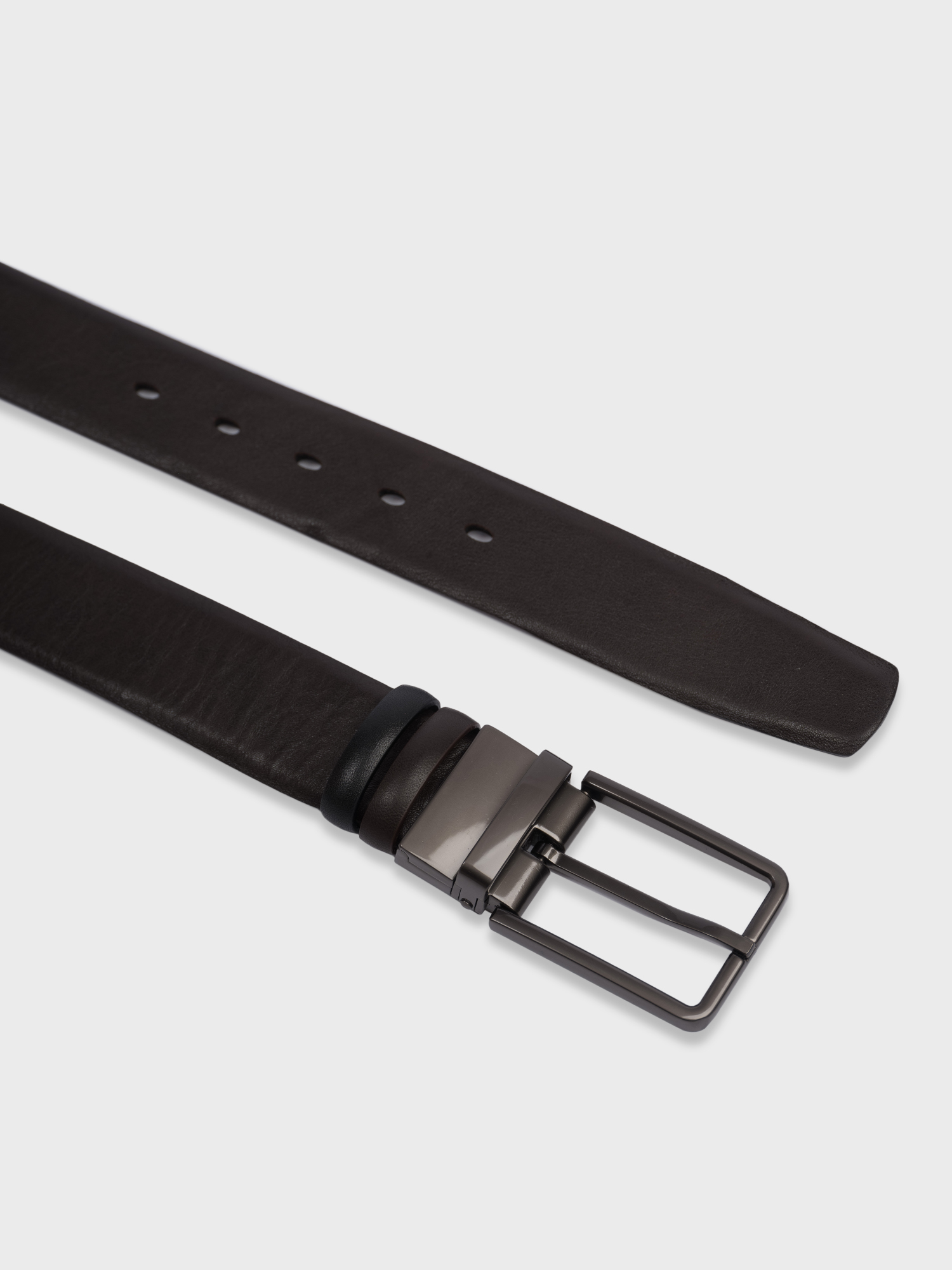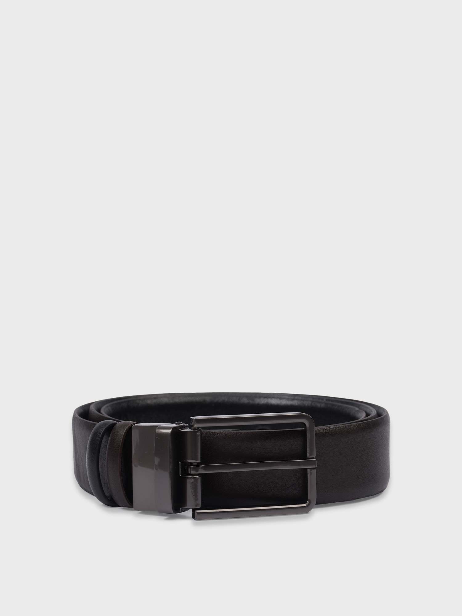 Универсальный двухсторонний ремень из натуральной кожи с серебристой прямоугольной пряжкой имеет две носимые лицевые стороны: черного и коричневого оттенка. Ширина ремня 3,5 см