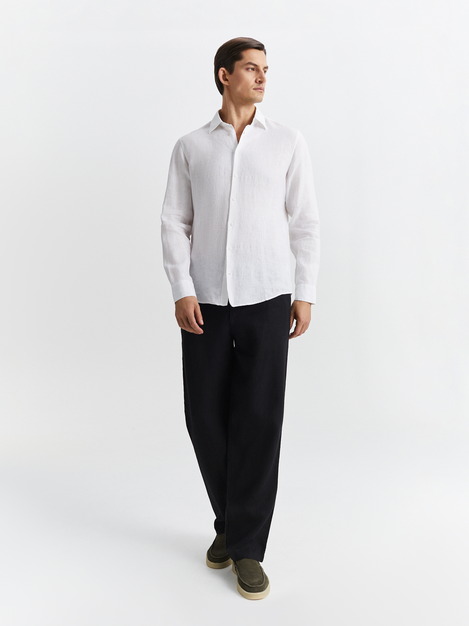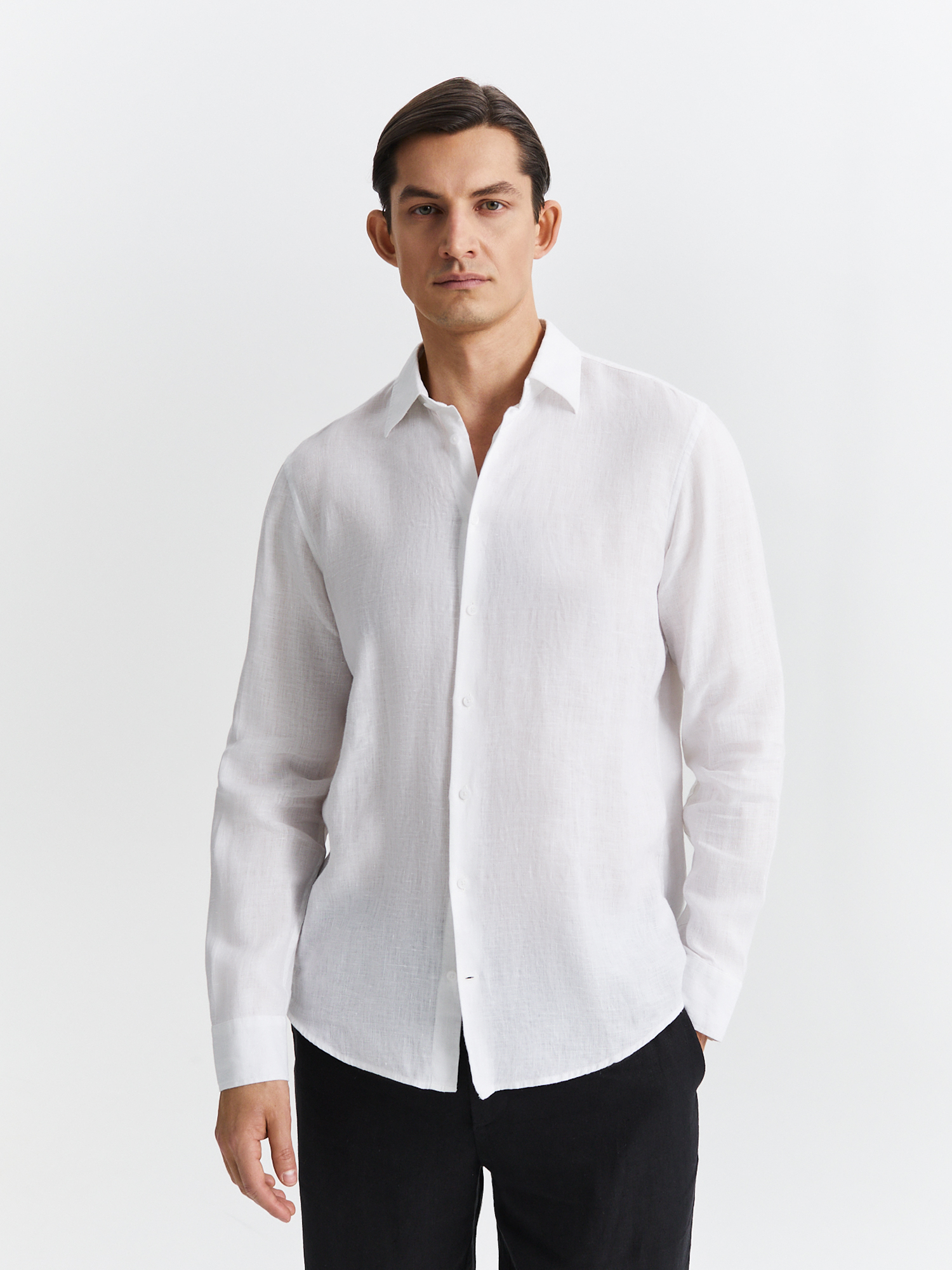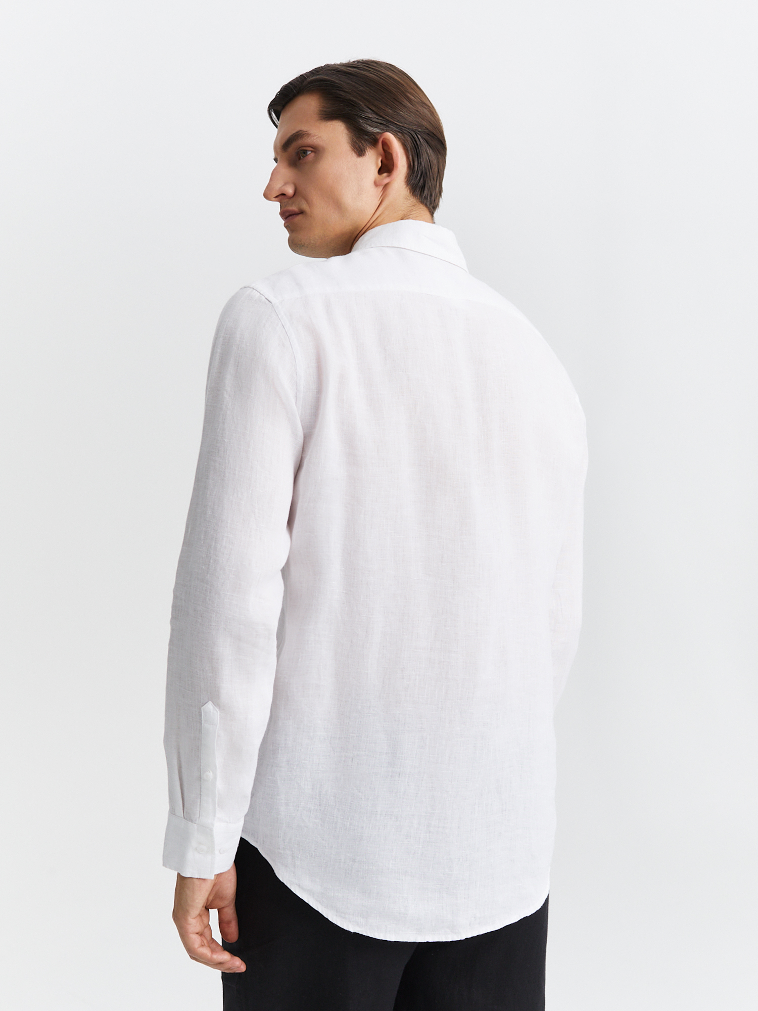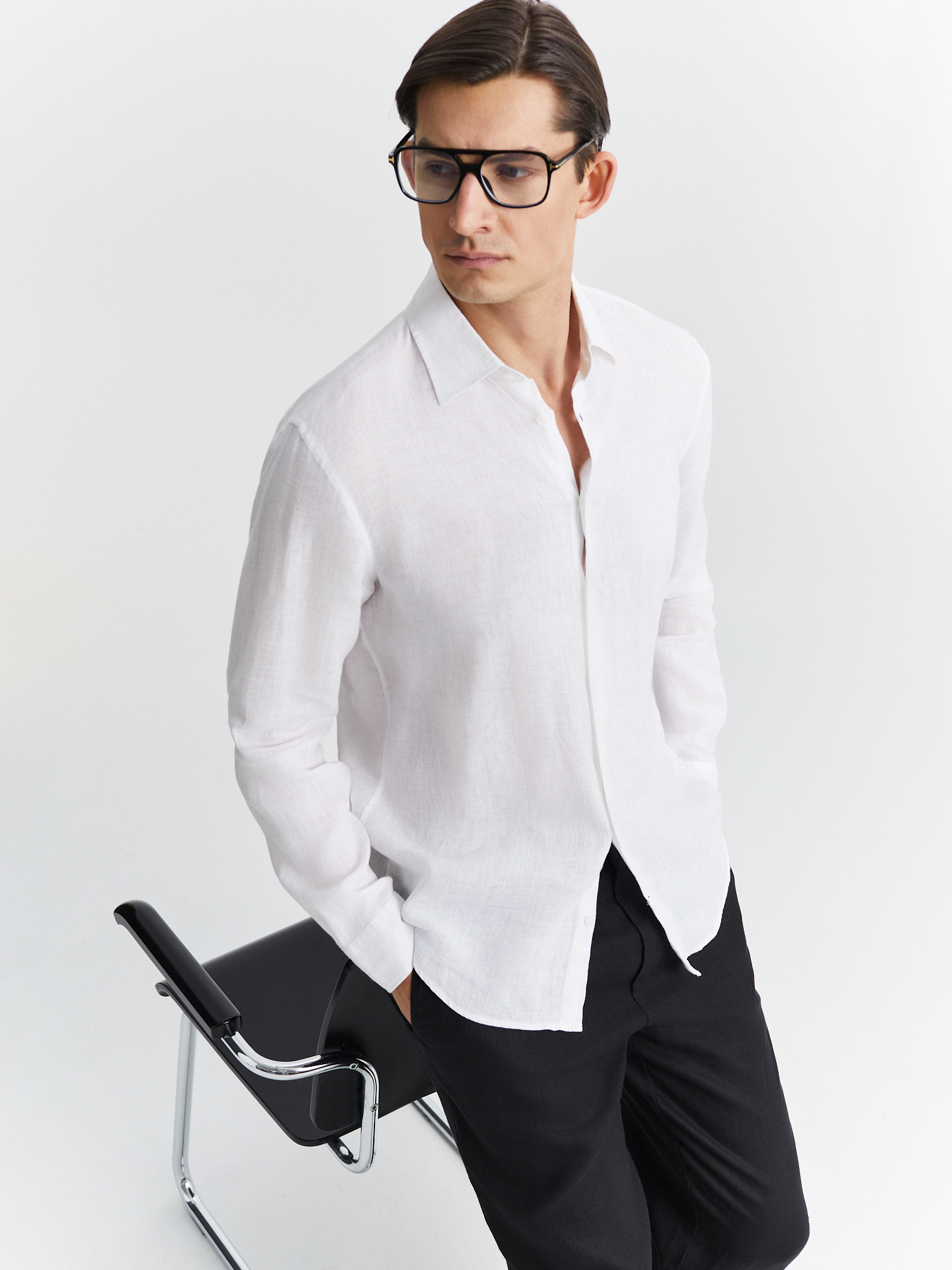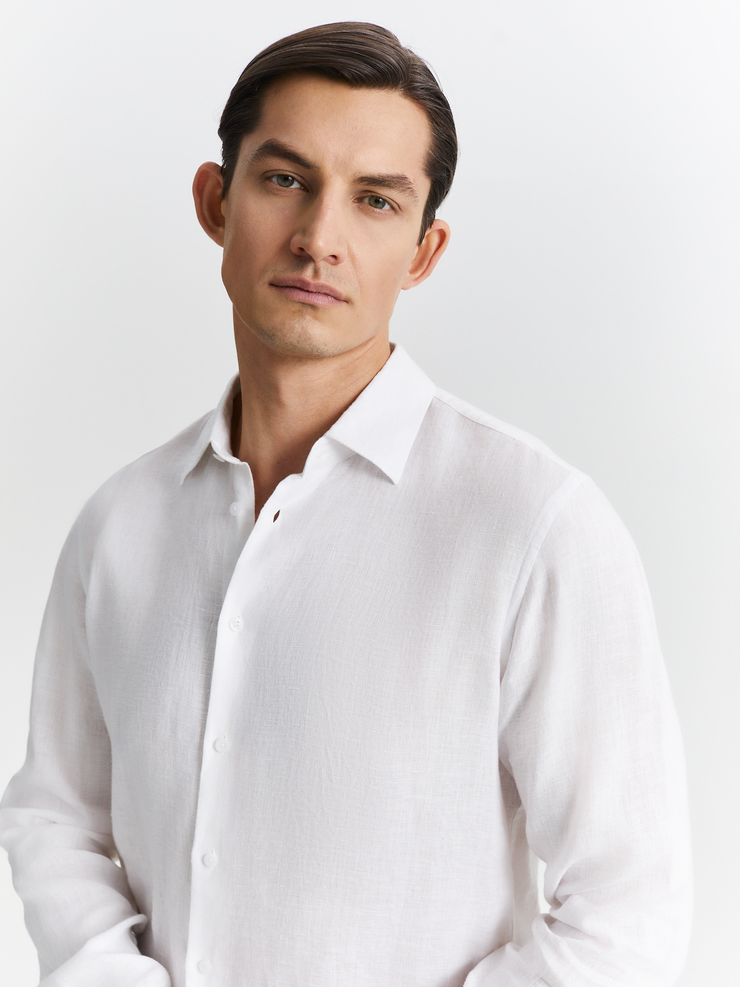 Белая рубашка из тонкого льна с натуральной неоднородной текстурой. Модель с отложным воротником, длинным втачным рукавом с манжетами и застёжкой на пуговицы. Прямой крой подходит для любого типа фигуры и придает особую свободу движений в течение дня. Легкая рубашка прекрасно дополнит повседневный весенне-летний гардероб и будет уместно выглядеть как в образах для офиса без строгого дресс-кода, так и в неформальных образах.