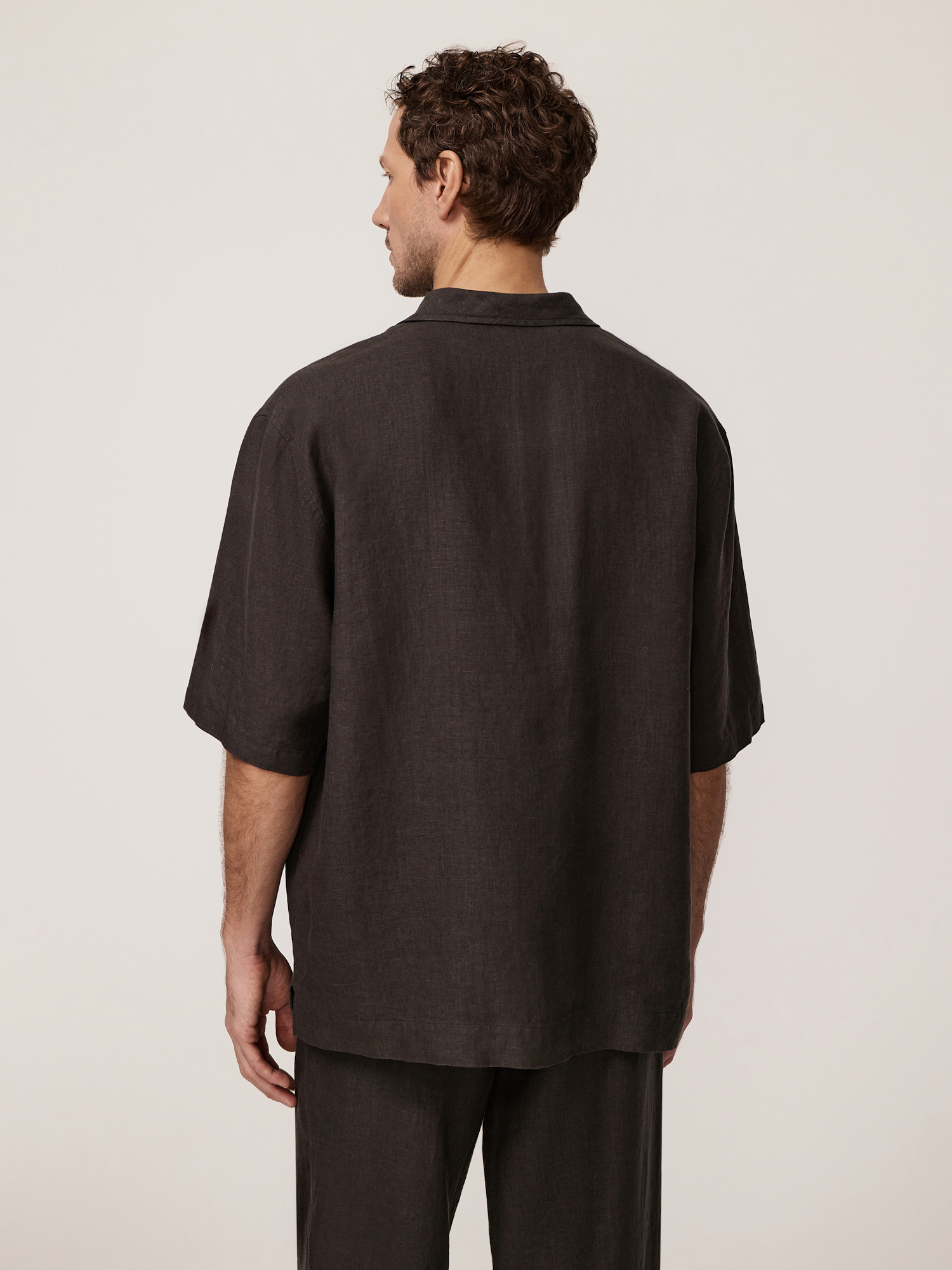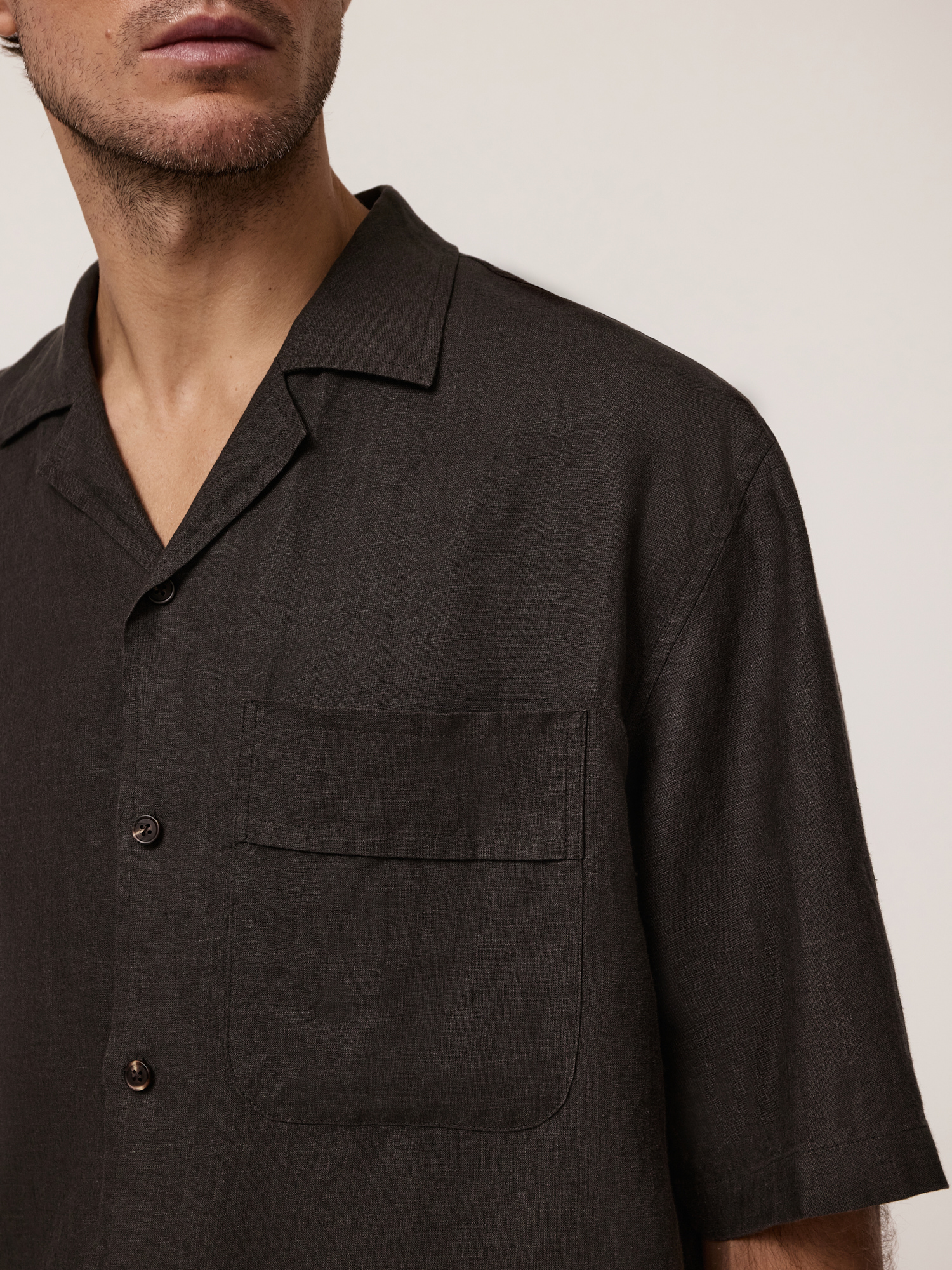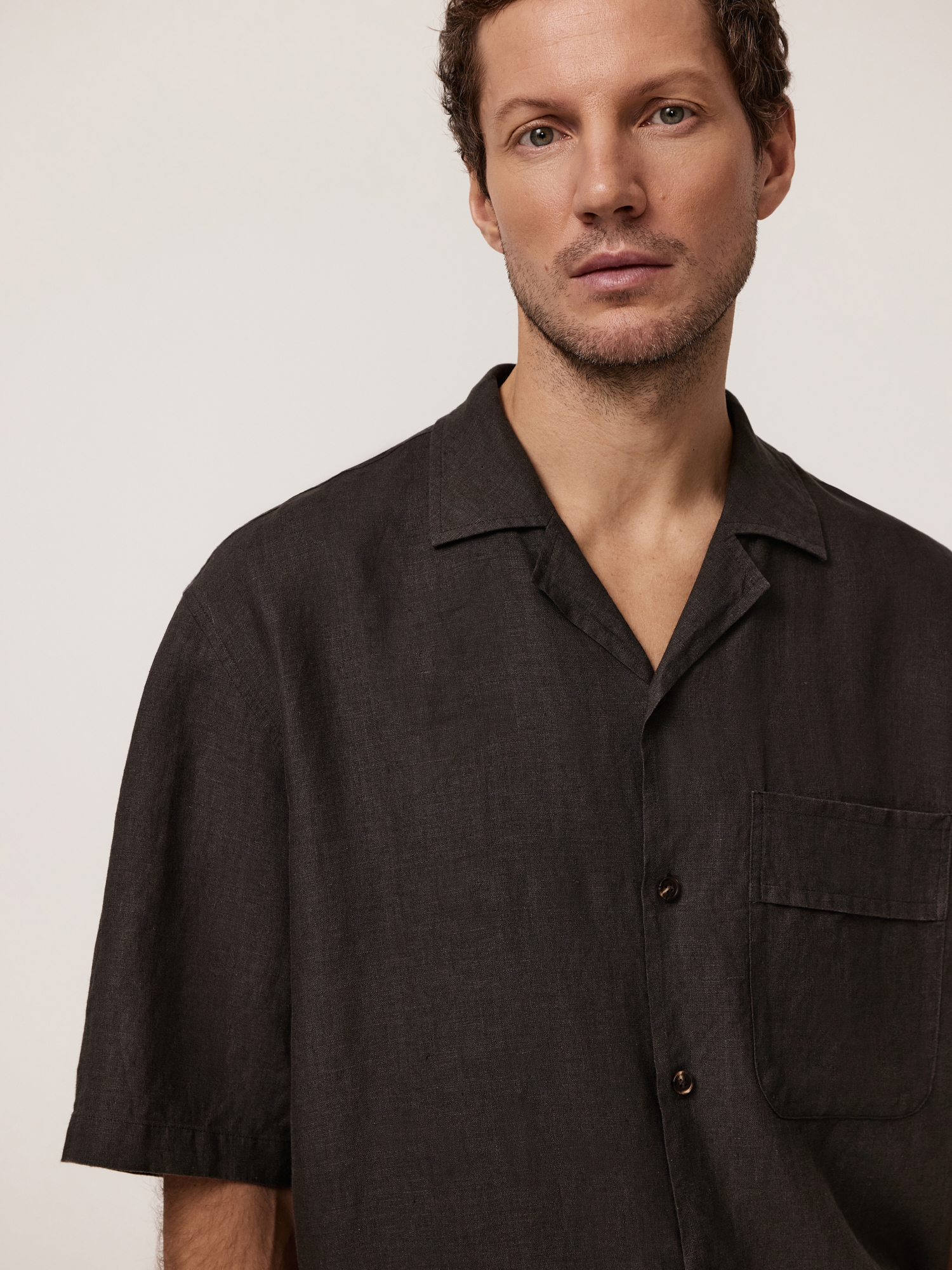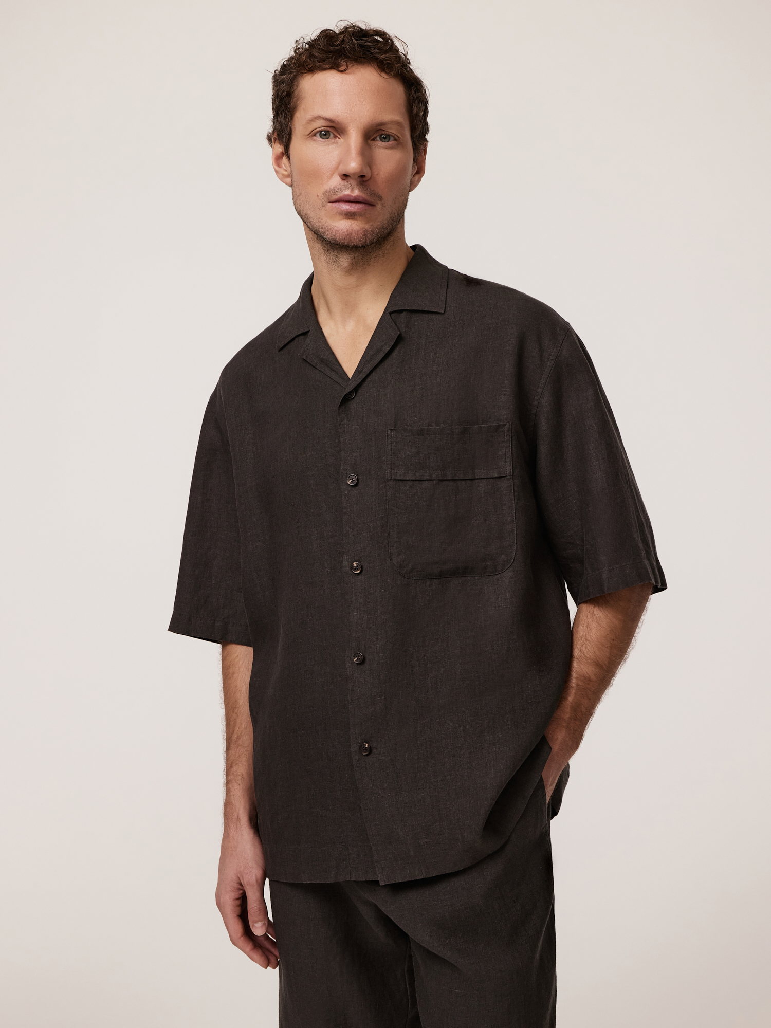 Выбрали для модели увеличенный прямой силуэт, воротник "camp" и короткий рукав. Рубашка дополнена нагрудным функциональным карманом увеличенного размера и разрезами по бокам для свободы движения. Воротник "кэмп" лишен стойки, поэтому шея достаточно открыта и модель приобретает расслабленный вид. Несмотря на это, летом такой рубашкой вполне можно дополнять образ smart casual, подобранный для офиса. Легкий дышащий лен турецкого производства, сотканный в шоколадно-коричневом оттенке, комфортен для жаркого летнего периода. Этот природный материал обладает уникальной терморегуляцией: его волокна регулируют микроклимат, отводя влагу в жару и сохраняя тепло при лёгком похолодании. Лен удивительно износостоек — чем больше носишь, тем мягче и выразительнее становится его фактура, кроме того, лен антибактериален и гипоаллергенен. Насыщенный тёмно-коричневый цвет с лёгким красноватым подтоном, напоминающий горький шоколад премиум-класса - это цвет уверенности, традиций и мужской элегантности.