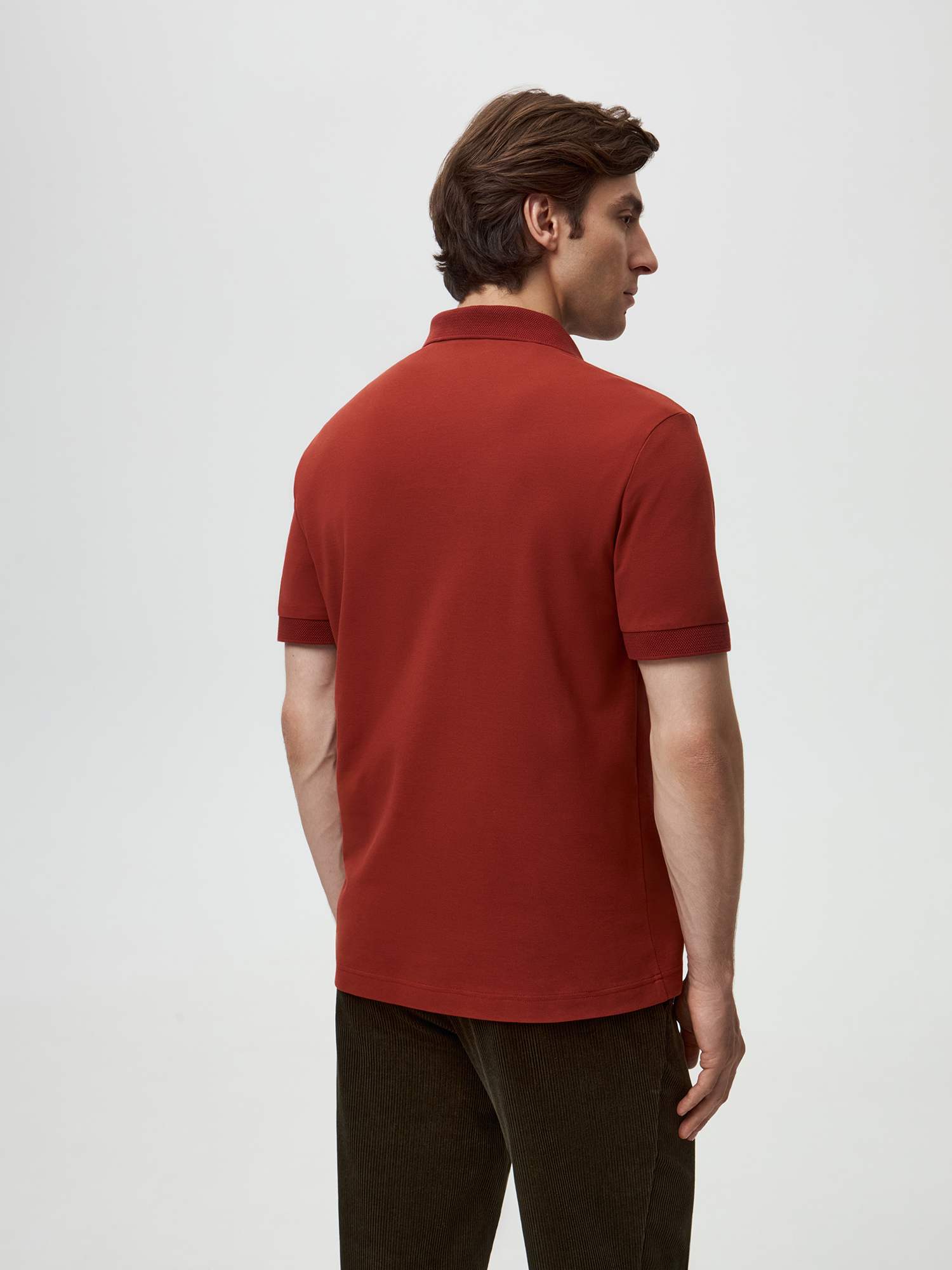 Стильное поло с втачным коротким рукавом, выполненное в актуальном терракотовом оттенке, станет отличным дополнением Вашего гардероба. Отложной воротник и манжеты выполнены из фактурного трикотажа, что придает модели интересный визуальный акцент. Застежка на планку с двумя пуговицами добавляет элегантности. На поло нанесен брендированный принт, выполненный на собственном производстве с использованием современного оборудования для печати по ткани.