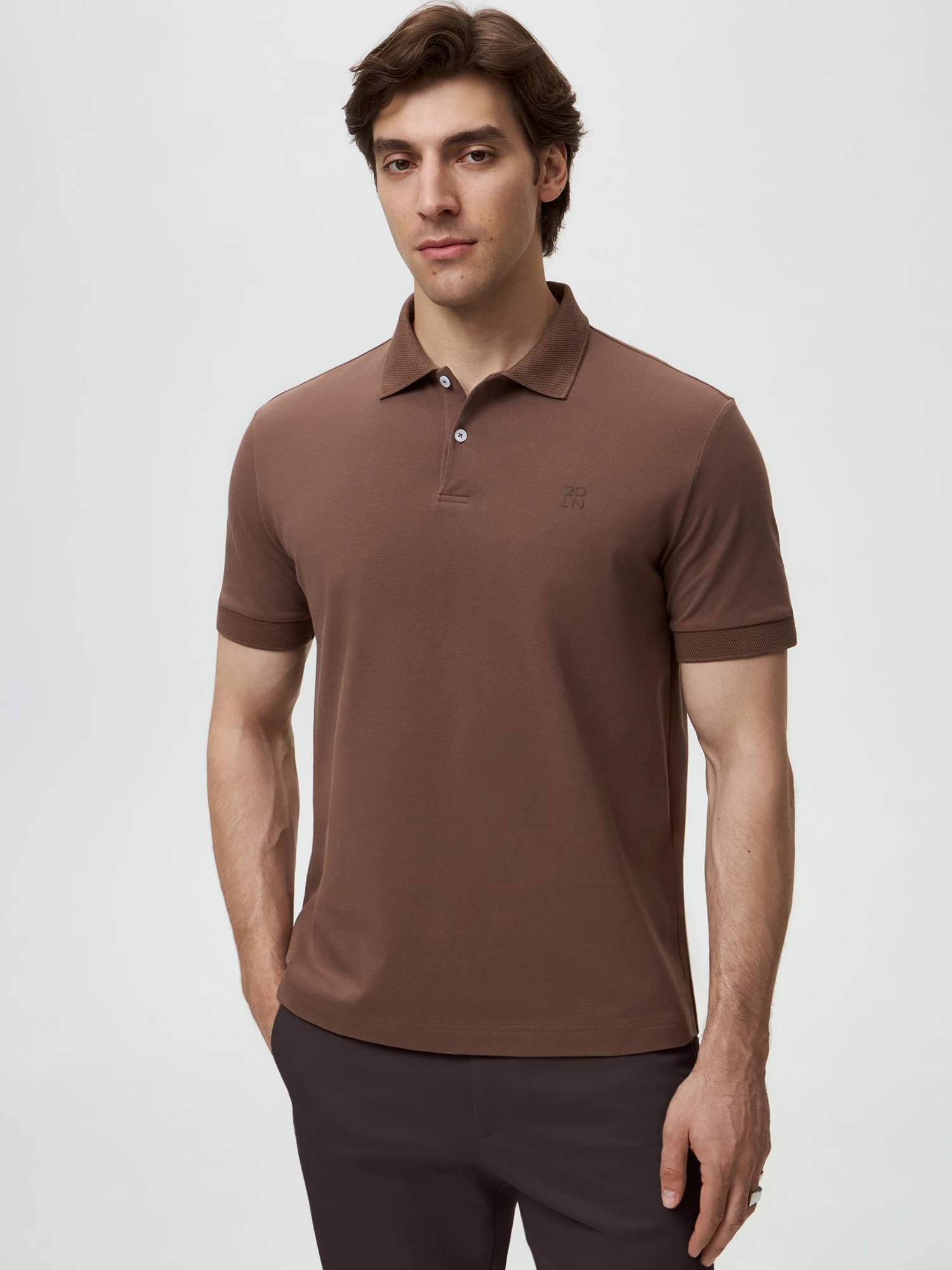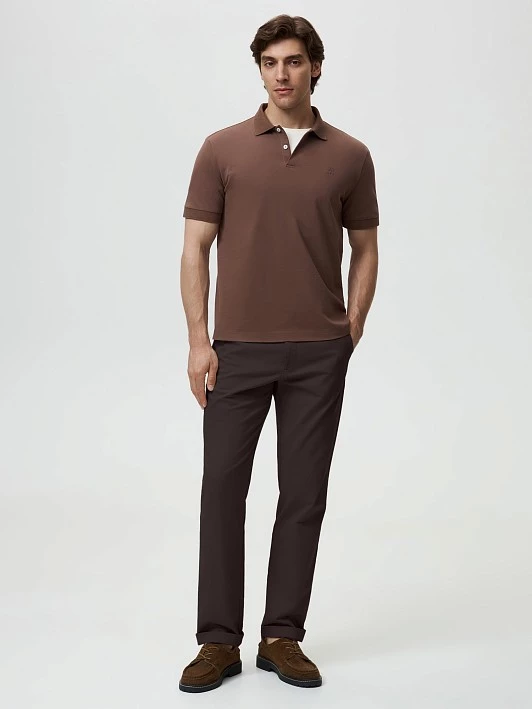 Стильное поло с втачным коротким рукавом, выполненное в теплом коричневом оттенке, станет отличным дополнением Вашего гардероба. Отложной воротник и манжеты выполнены из фактурного трикотажа, что придает модели интересный визуальный акцент. Застежка на планку с двумя пуговицами добавляет элегантности. На поло нанесен брендированный принт, выполненный на собственном производстве с использованием современного оборудования для печати по ткани.