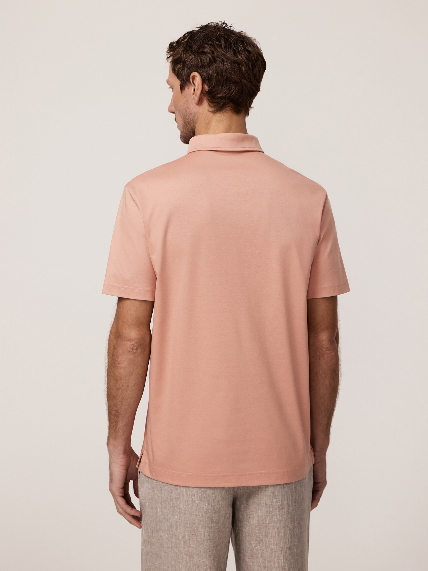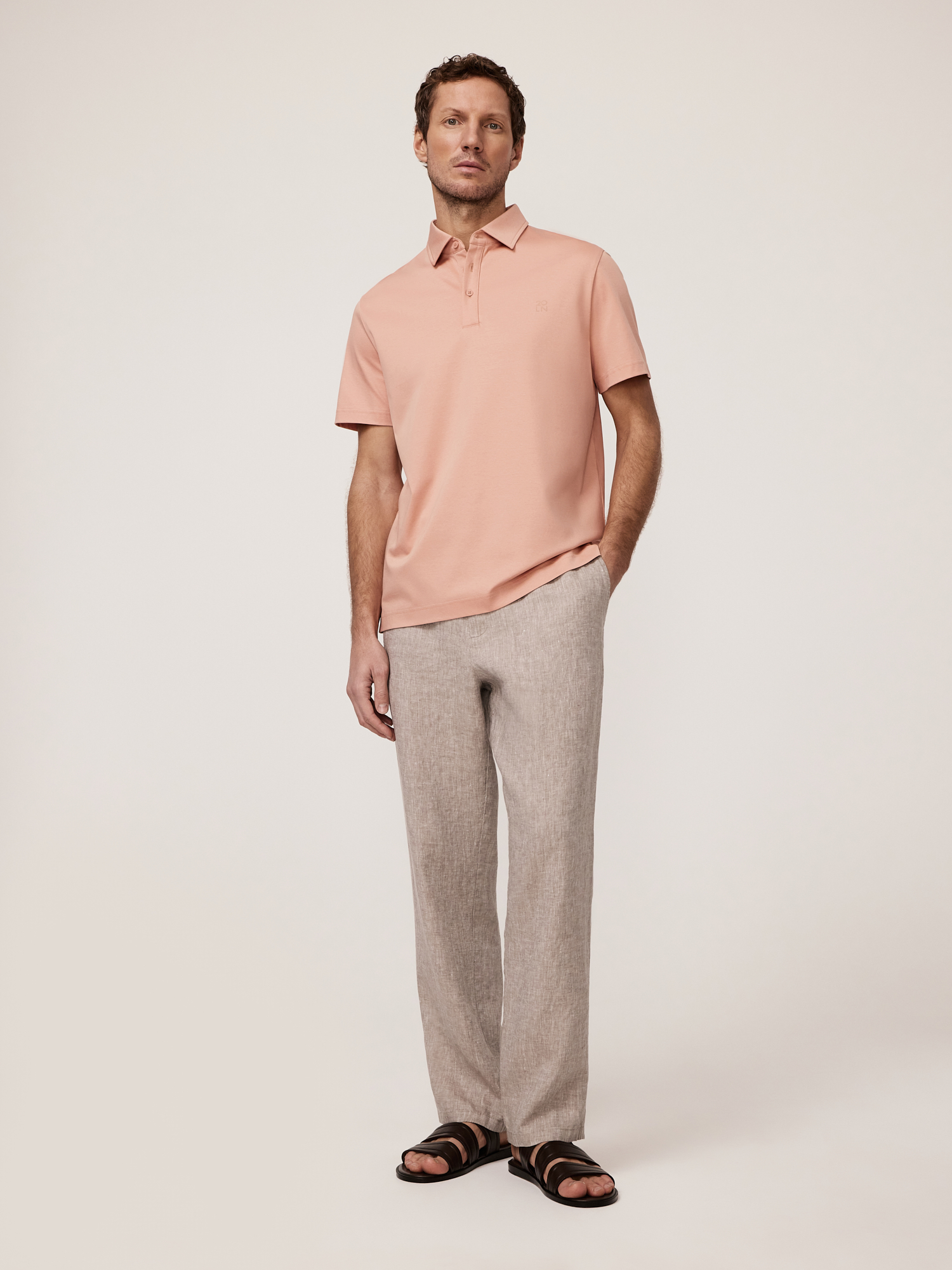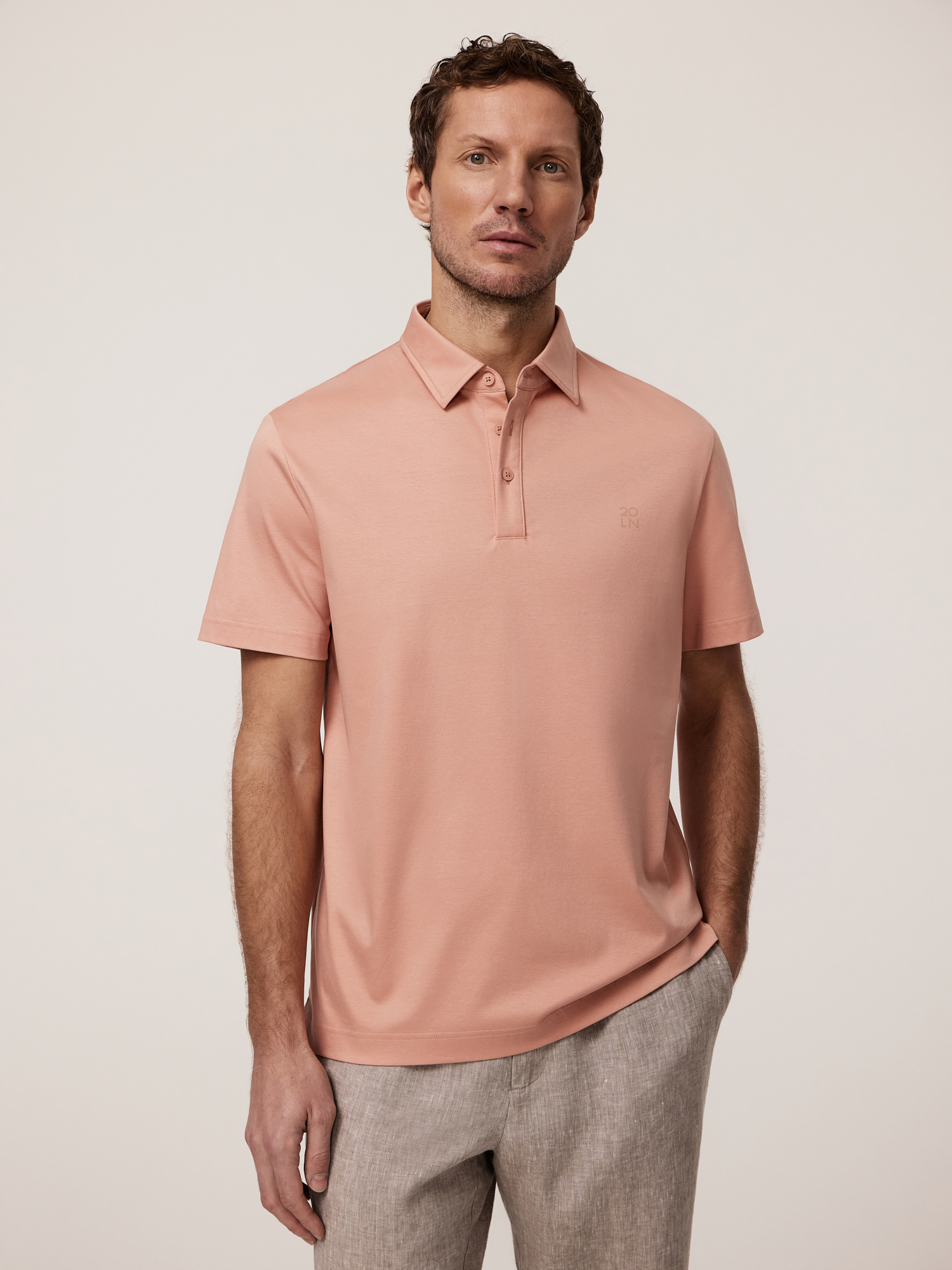 Благородная элегантность, непринужденность кэжуал эстетики и достижения современной текстильной промышленности повлияли на создание универсального поло. Выбрали для рубашки-поло персиковый смесовый трикотаж с премиальным составом, демонстрирующим высокие эксплуатационные качества. Сочетание мерсеризованного хлопка, люксового шелка и модала из буковой целлюлозы - это идеальный баланс натуральности, комфорта и практичности. Мерсеризованный хлопок – это хлопок премиум-класса, прошедший специальную обработку. Он приобретает особый глянцевый блеск, становится прочнее и устойчивее к износу, сохраняя при этом все достоинства натурального хлопка: безупречную воздухопроницаемость и гипоаллергенность. Такая ткань необыкновенно приятна на ощупь – мягкая, гладкая и удивительно нежная к коже. Шёлк – эталон роскоши среди тканей. Он придаёт материалу струящуюся лёгкость, изысканный благородный блеск и способность красиво драпироваться. Шёлк обладает природной терморегуляцией – в жару дарит прохладу, а в прохладную погоду сохраняет тепло. Кроме того, он гипоаллергенен и невероятно прочен, несмотря на кажущуюся хрупкость. Модал – современное высокотехнологичное волокно, получаемое из натуральной целлюлозы. Оно сочетает в себе лучшие свойства натуральных тканей: мягче хлопка, впитывает на 50% больше влаги, чем хлопок, обладает антибактериальными свойствами и при этом совершенно не мнётся. Модал придаёт ткани дополнительную эластичность, делает её приятно прохладной на ощупь и обеспечивает идеальную посадку по фигуре. Лаконичный крой подчеркивает достоинства фигуры, сохраняя при этом комфорт повседневной вещи. Особое внимание привлекает брендированный принт, нанесенный на собственном производстве с помощью высокоточного оборудования для печати по ткани — такая деталь добавляет образу индивидуальности, без ущерба общей гармонии образа. Модель для мужчин, которые ценят комфортную и универсальную одежду, созданную с вниманием к деталям.