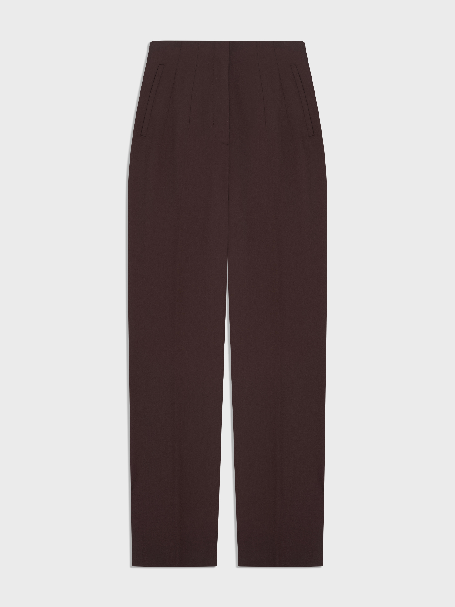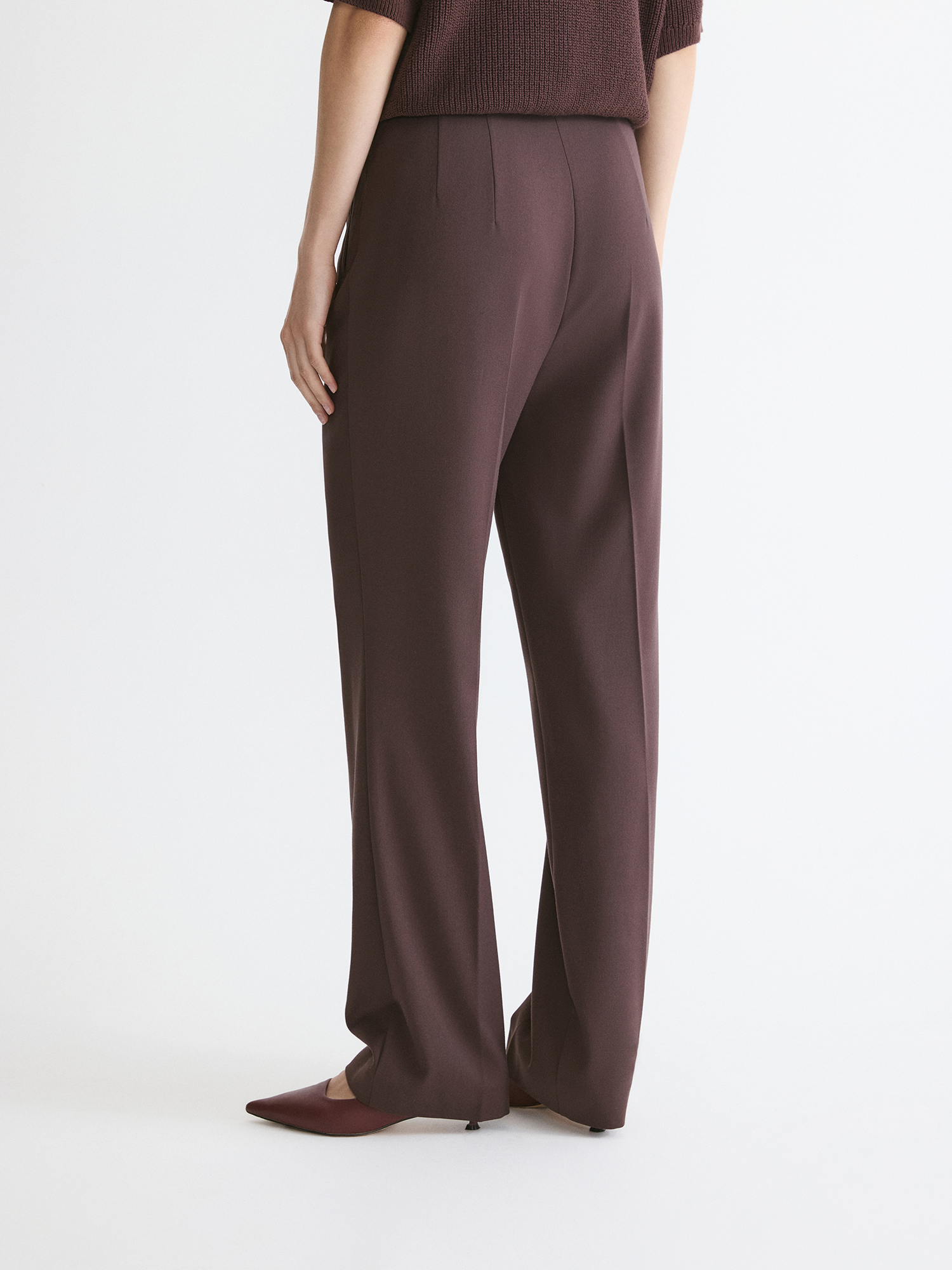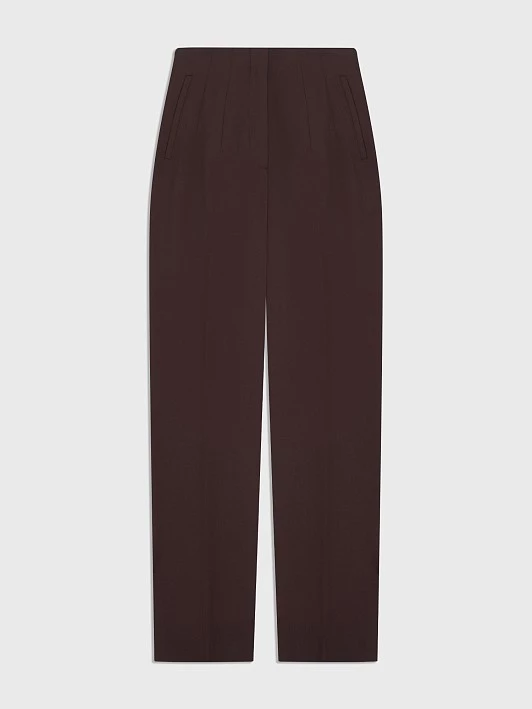 Брюки классического кроя в благородном шоколадном оттенке станут универсальной основой для осенне-зимнего гардероба. Слегка зауженные, с заутюженными стрелками и аккуратными карманами с листочкой, они выглядят строго и элегантно. Брюки с высокой посадкой корсетного типа, с четырьмя вытачками идеально облегают фигуру, а удобная застежка-гульфик делает их комфортными в носке.