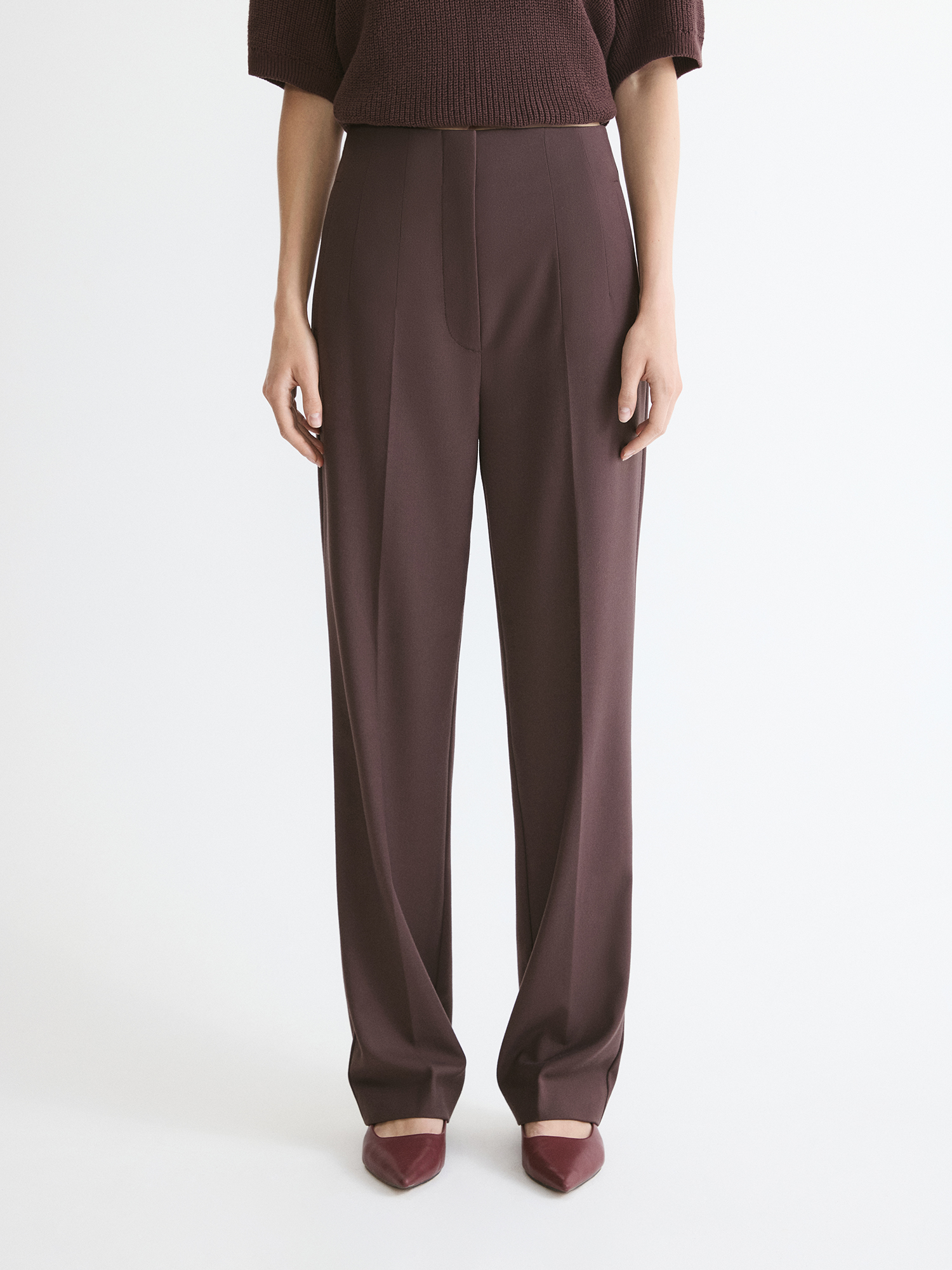 Такие брюки подойдут к пиджаку для деловой встречи, к джемперу для офиса и к нарядному топу для вечернего выхода. Эффектный шоколадный цвет делает их акцентом в образе, а выверенный корсетный крой обеспечивает безупречную посадку.