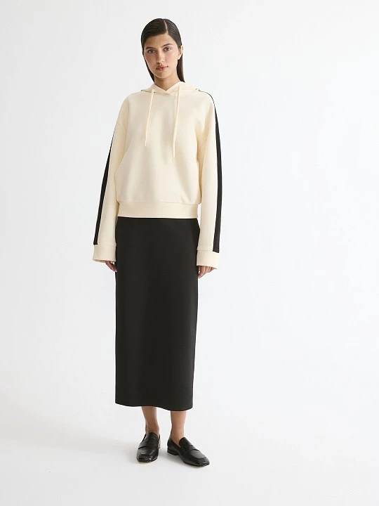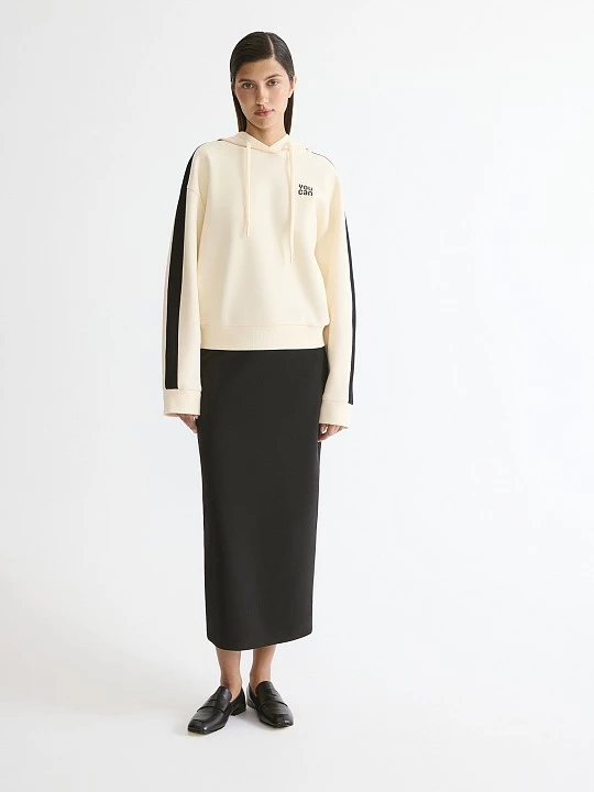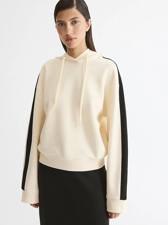 Свитшот в актуальном сливочном оттенке выполнен с капюшоном с возможностью фиксации с помощью специального шнура. Длинный рукав со спущенным плечом комфортен и дополнен манжетом из трикотажа рибана с черными полосками, планка из аналогичного трикотажа фиксирует модель по низу.