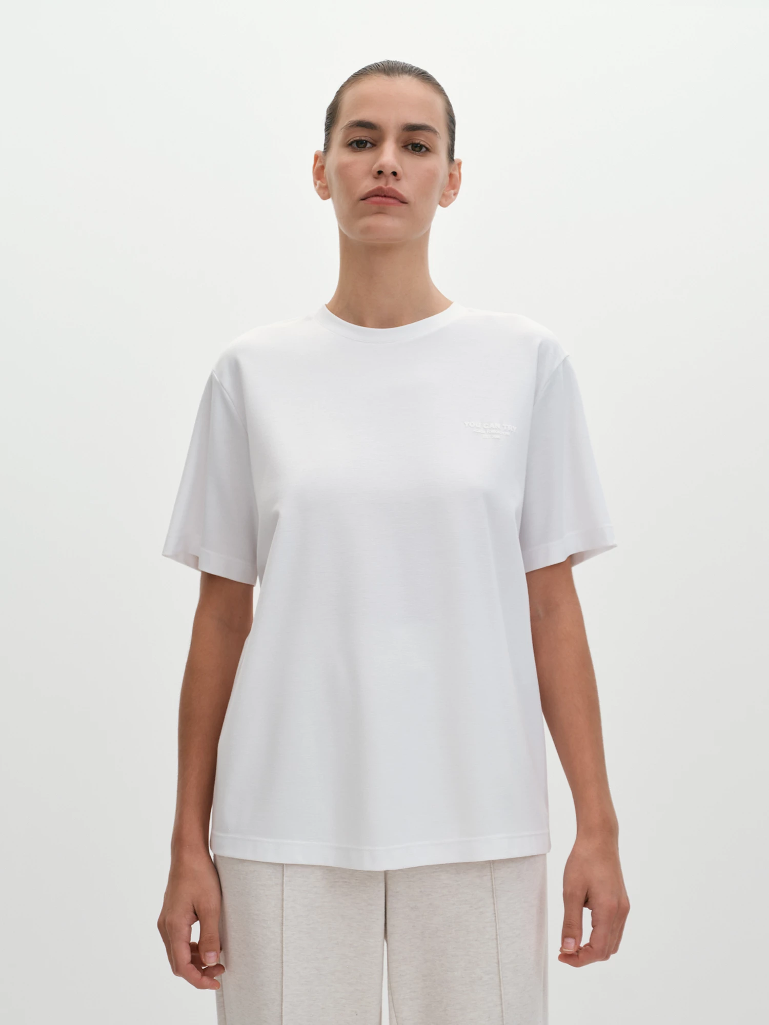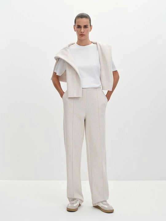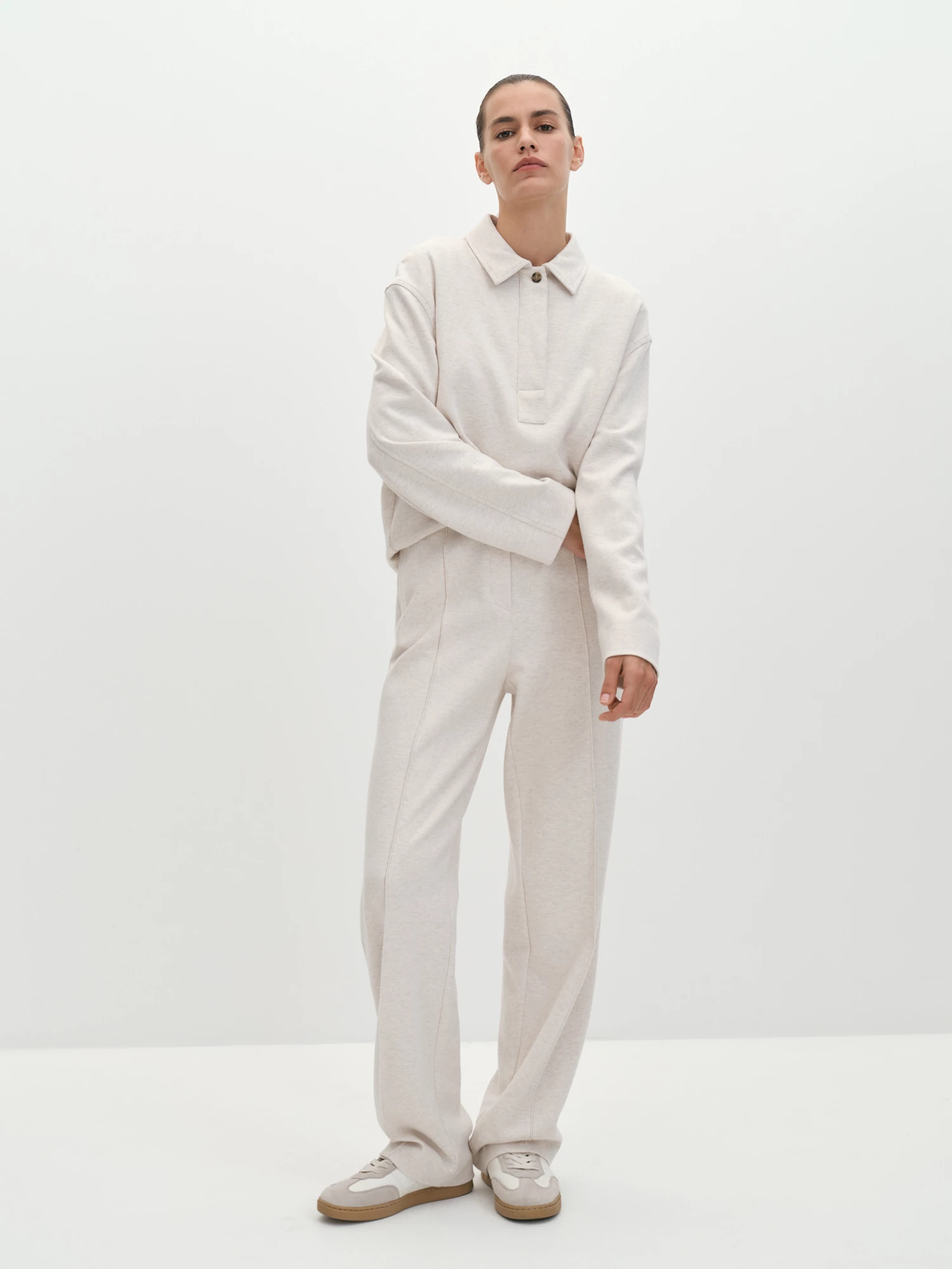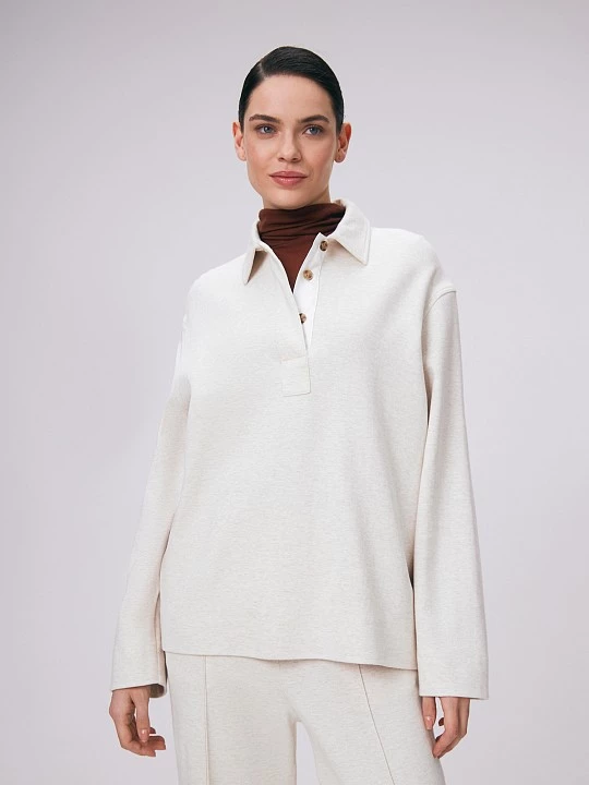 Свитшот с воротником-поло и частично скрытой застежкой выводит одежду из хлопкового трикотажа на новый уровень комфорта. Втачной рукав с мягким спущенным плечом удобен, а нарочито объемные, рельефные швы, вместе с разрезами по бокам подчеркивают линии кроя и свободный силуэт изделия. Современный хлопковый трикотаж идеален для отдыха и прогулок, он гипоаллергенен, хорошо дышит и удобен в эксплуатации. Меланжевые ткани всегда имеют базовый цвет, к которому подбираются нити других оттенков, близких к основному. В итоге получается интересный эффект, называемый оптикой меланжа. Такое полотно экологично, ведь при его производстве используется меньше воды и энергии, чем при традиционных методах окрашивания. Бежевый меланж в образах хорошо сочетается с моделями в базовых и классических оттенках. Органичный в своей эклектичности, костюм из свитшота и брюк с застроченными стрелками получился даже в какой-то степени романтичным из-за выбранного для него оттенка сливочного меланжа.