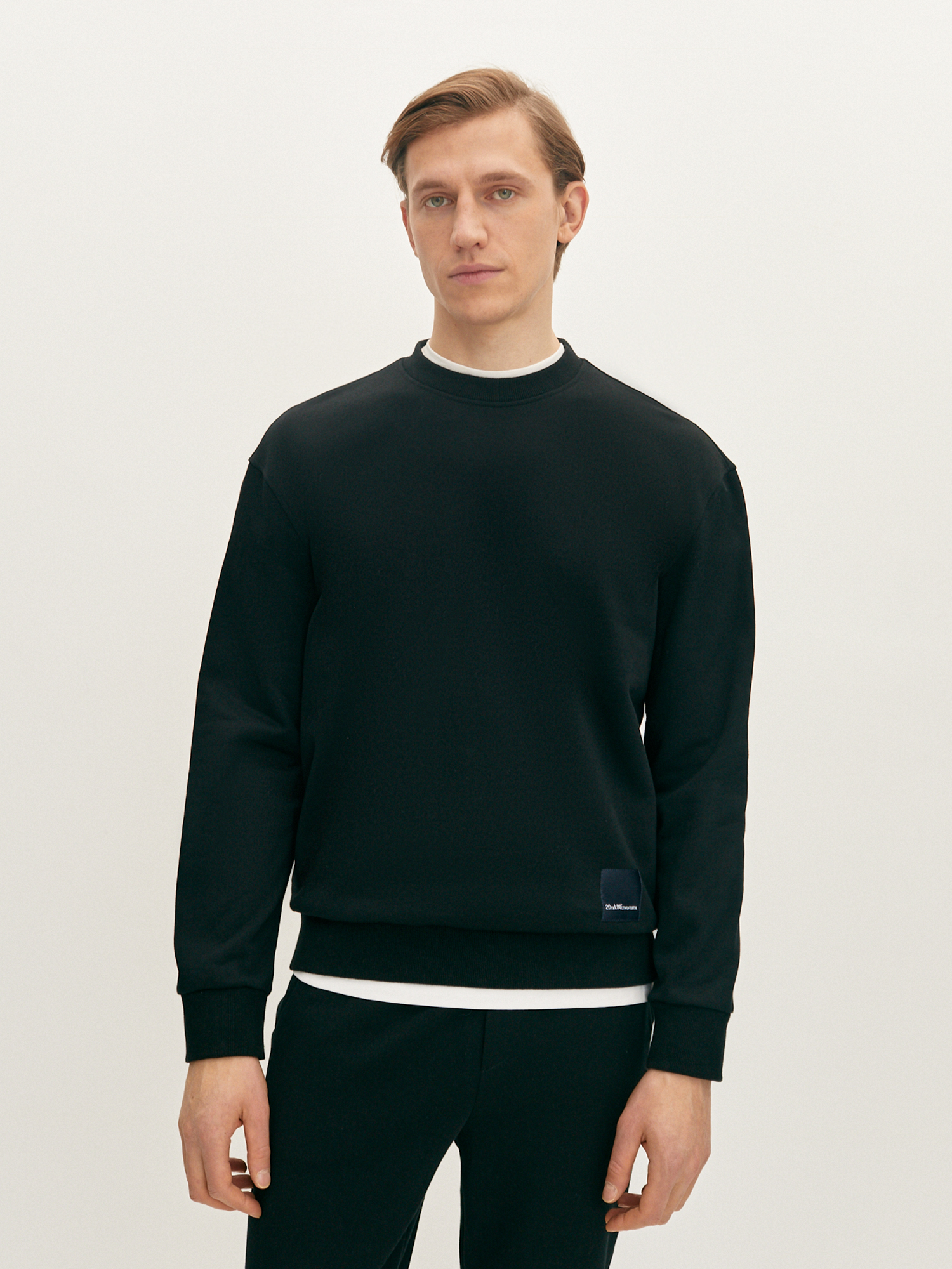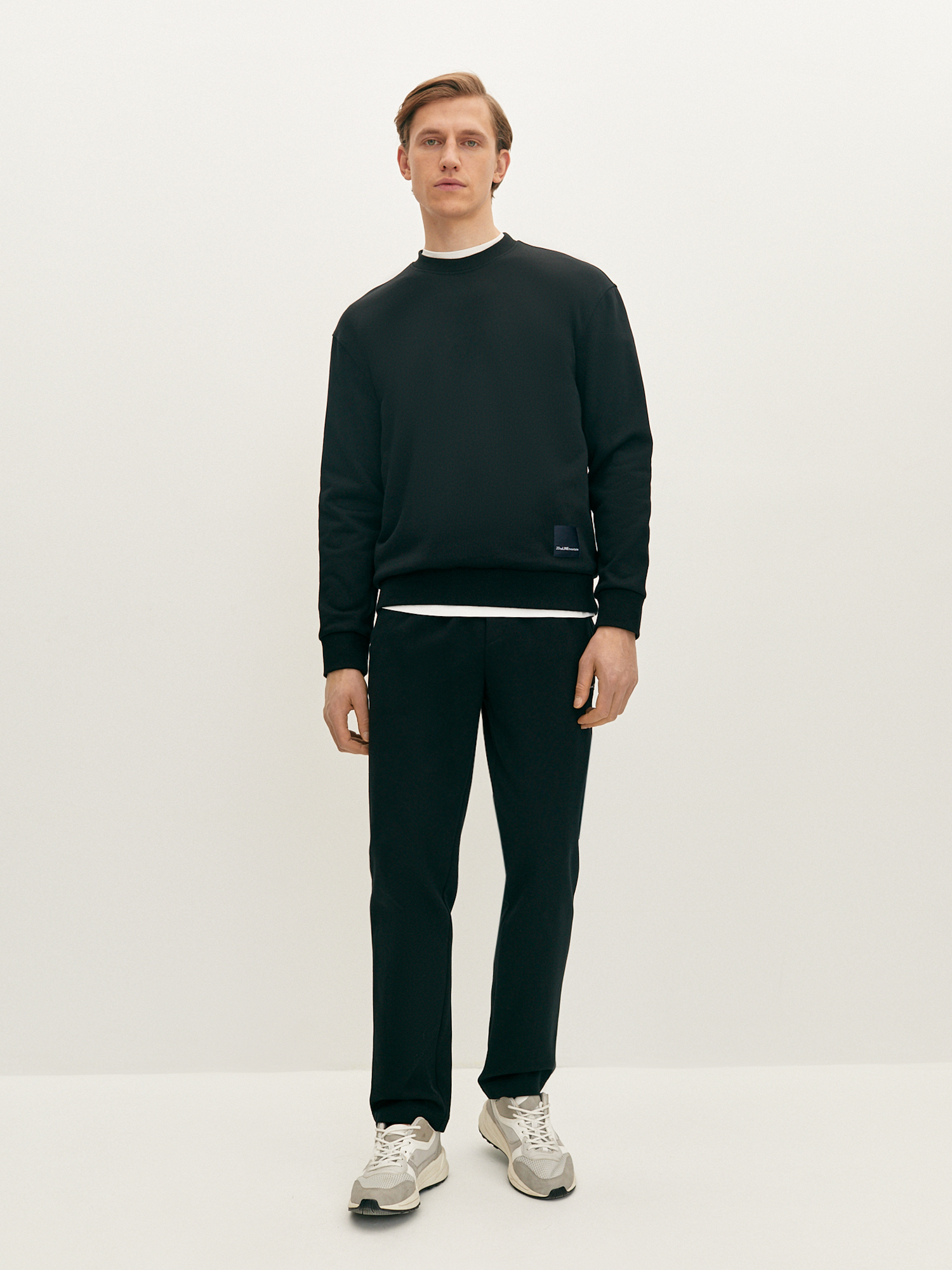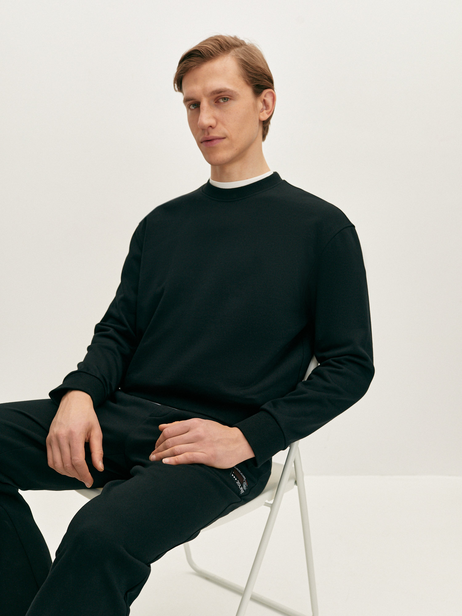 Трикотажный свитшот чёрного цвета свободного силуэта. Плотный трикотаж на основе хлопка, тёплый, но при этом дышащий и эластичный, не сковывает движения и обеспечивает комфортную посадку. Модель прямого силуэта со спущенной линией плеча, длинным рукавом с манжетами, круглой горловиной и эластичной резинкой по низу изделия из ткани кашкорсе. Свитшот декорирован текстильным патчем. Он гармонично сочетается с джинсами и брюками, и прекрасно подойдет для создания образов в стиле casual, а также дополнит образ со спортивными брюками из комплекта.