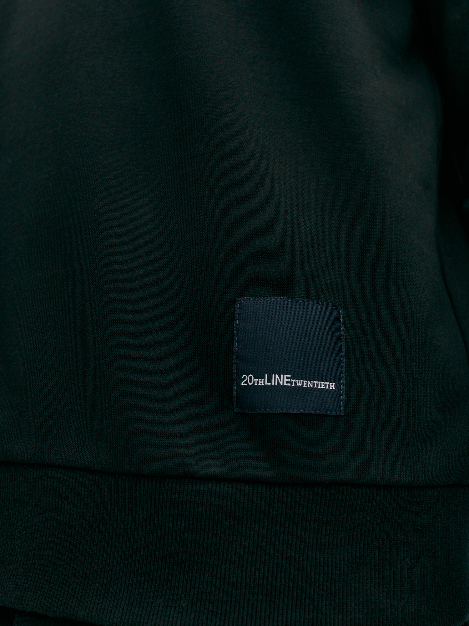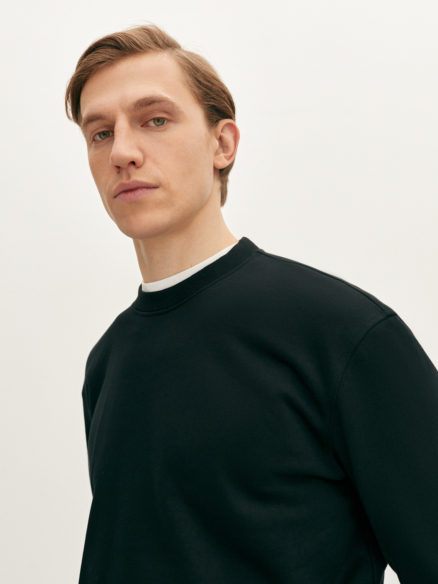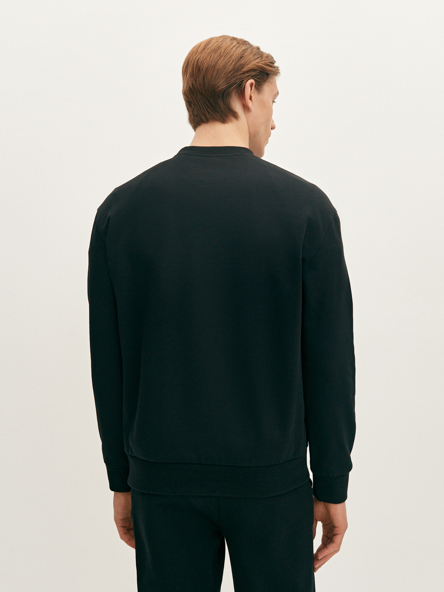 Трикотажный свитшот чёрного цвета свободного силуэта. Плотный трикотаж на основе хлопка, тёплый, но при этом дышащий и эластичный, не сковывает движения и обеспечивает комфортную посадку. Модель прямого силуэта со спущенной линией плеча, длинным рукавом с манжетами, круглой горловиной и эластичной резинкой по низу изделия из ткани кашкорсе. Свитшот декорирован текстильным патчем. Он гармонично сочетается с джинсами и брюками, и прекрасно подойдет для создания образов в стиле casual, а также дополнит образ со спортивными брюками из комплекта.