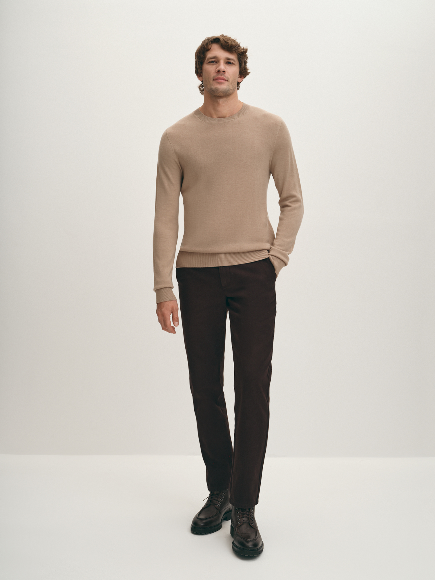 Бежевый вязаный базовый джемпер прилегающего силуэта с длинным рукавом. Использована качественная итальянская пряжа с шерстью мериноса и мягким акрилом. Процесс вязки происходит на японской плосковязальной машине Shima Seiki. Цельновязаная основа теплого брендового джемпера 20line соединена на кеттельном оборудовании с бейкой горловины. Это премиальная, дорогая обработка, позволяющая создавая эластичное, практически незаметное соединение.