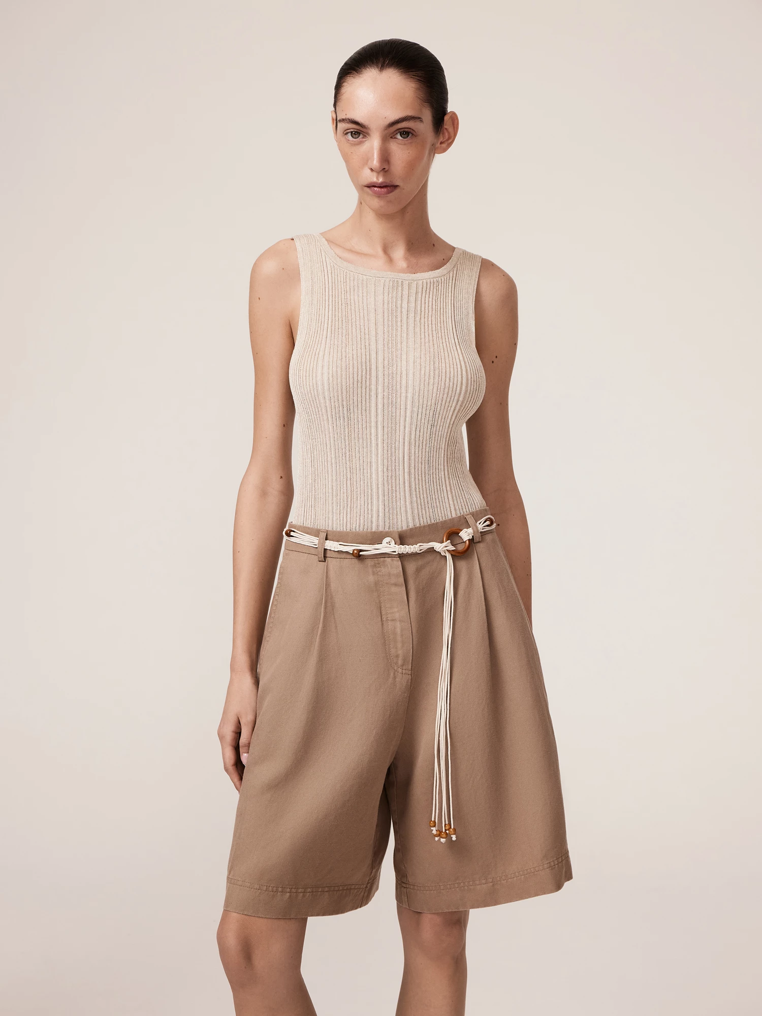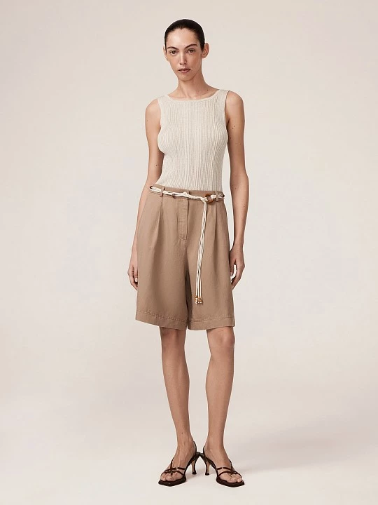 Итальянская пряжа на основе вискозы демонстрирует безупречное качество и утонченную роскошь. Мягкая и очень приятная на ощупь, она дарит ощущение комфорта и нежности, а деликатный благородный блеск делает каждый образ особенным. Благодаря добавлению полиэстера пряжа становится еще более прочной и износостойкой, сохраняя безупречный вид, что делает ее идеальным выбором для тех, кто ценит долговечность и практичность без ущерба для эстетической составляющей. Базовый бежевый оттенок актуален всегда. Такой цвет легко сочетается с любыми цветами и фактурами, он универсален, элегантен и дарует гармонию. Этот топ – воплощение современного минимализма, где главный акцент сделан на лаконичном крое и изысканном переплетении нитей, создающем эффект вертикальных полос разного ритма. Элементарный дизайн подчеркивает утонченность силуэта, а глубокий круглый вырез на спине добавляет ноту чувственности, позволяя легко трансформировать образ из повседневного в вечерний. Модель выполнена на японской плосковязальной машине Shima Seiki и отличается 12-м классом вязки . Чем выше класс вязки, тем более тонкое, ценное вязаное изделие мы получаем. 12-й класс – один из самых высоких и доступен нам благодаря современному оборудованию фабрики. Топ связан по бесшовной технологии - это значит, что он создается как единое целое, хорошо держит форму и долго прослужит. Бейка горловины присоединена к цельновязаной модели на кеттельном оборудовании. Эта премиальная, практически незаметная обработка с высокой долей ручного труда и вниманием к деталям, отличается высокой эластичностью, что способствует формоустойчивости изделия. Вязка в технике «рибана» создает эффект объемного текстурированного полотна, добавляя образу динамику и стиль. Такая модель подчеркивает индивидуальность и безупречный вкус в любой ситуации.