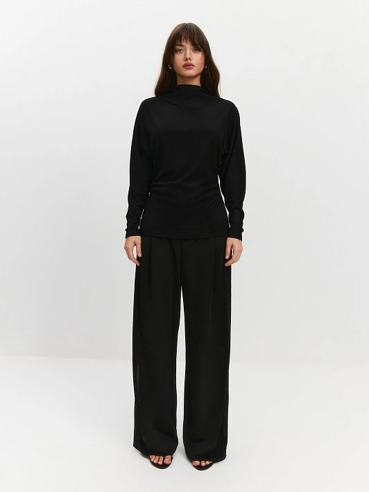 Классический черный цвет и оригинальный крой делают блузу универсальной — её можно сочетать с любой нижней частью гардероба. Особенно выигрышно блуза смотрится с юбкой SK0571K из смесового трикотажа с содержанием шерсти.