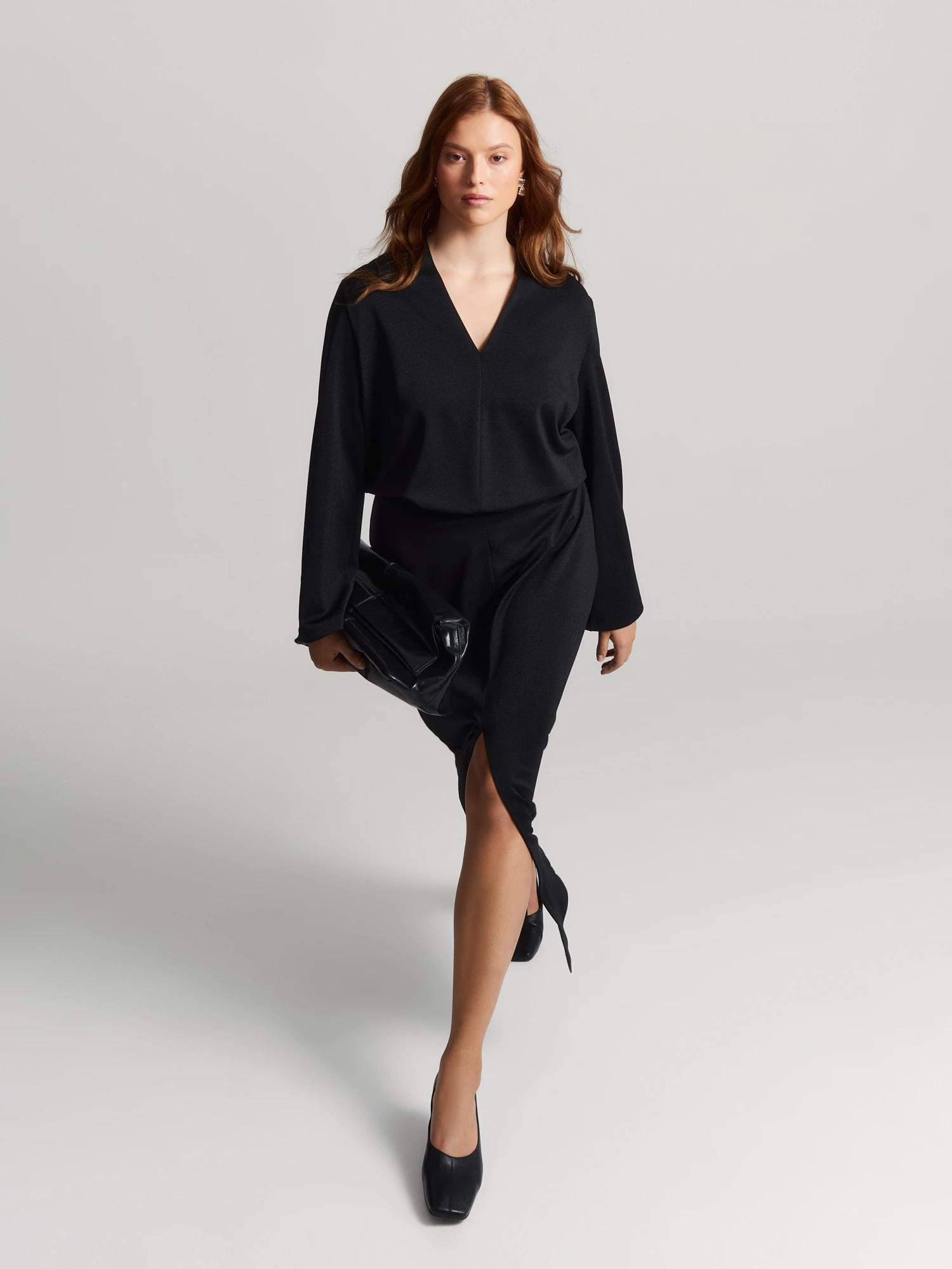Небольшая стойка сзади комфортно переходит в эффектный V-вырез. Длинные рукава со спущенным плечом и разрезами на манжетах добавляют модели динамики.